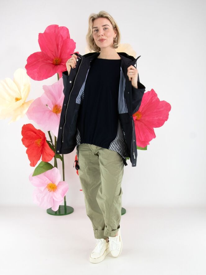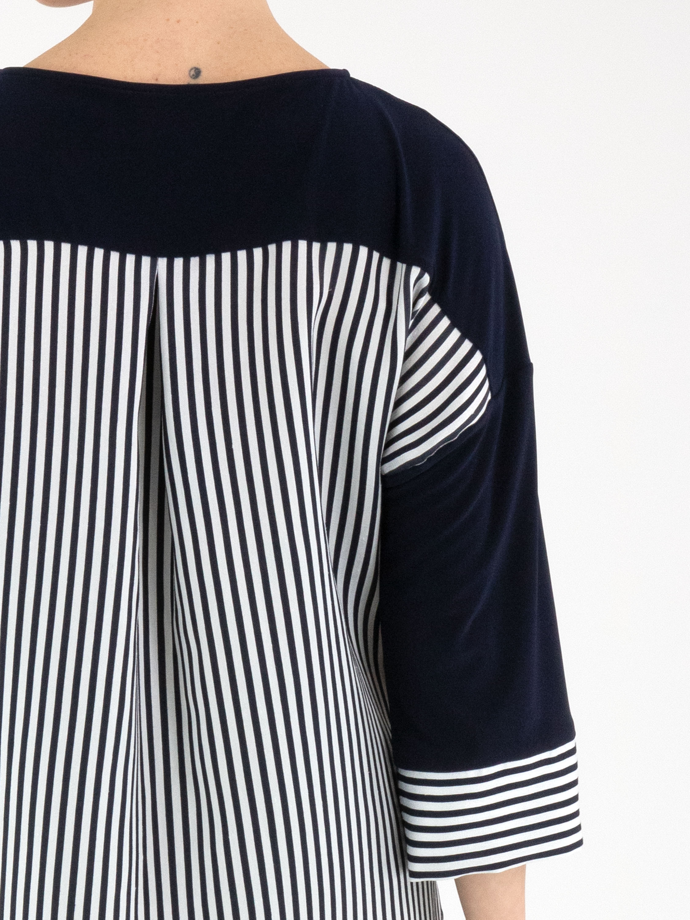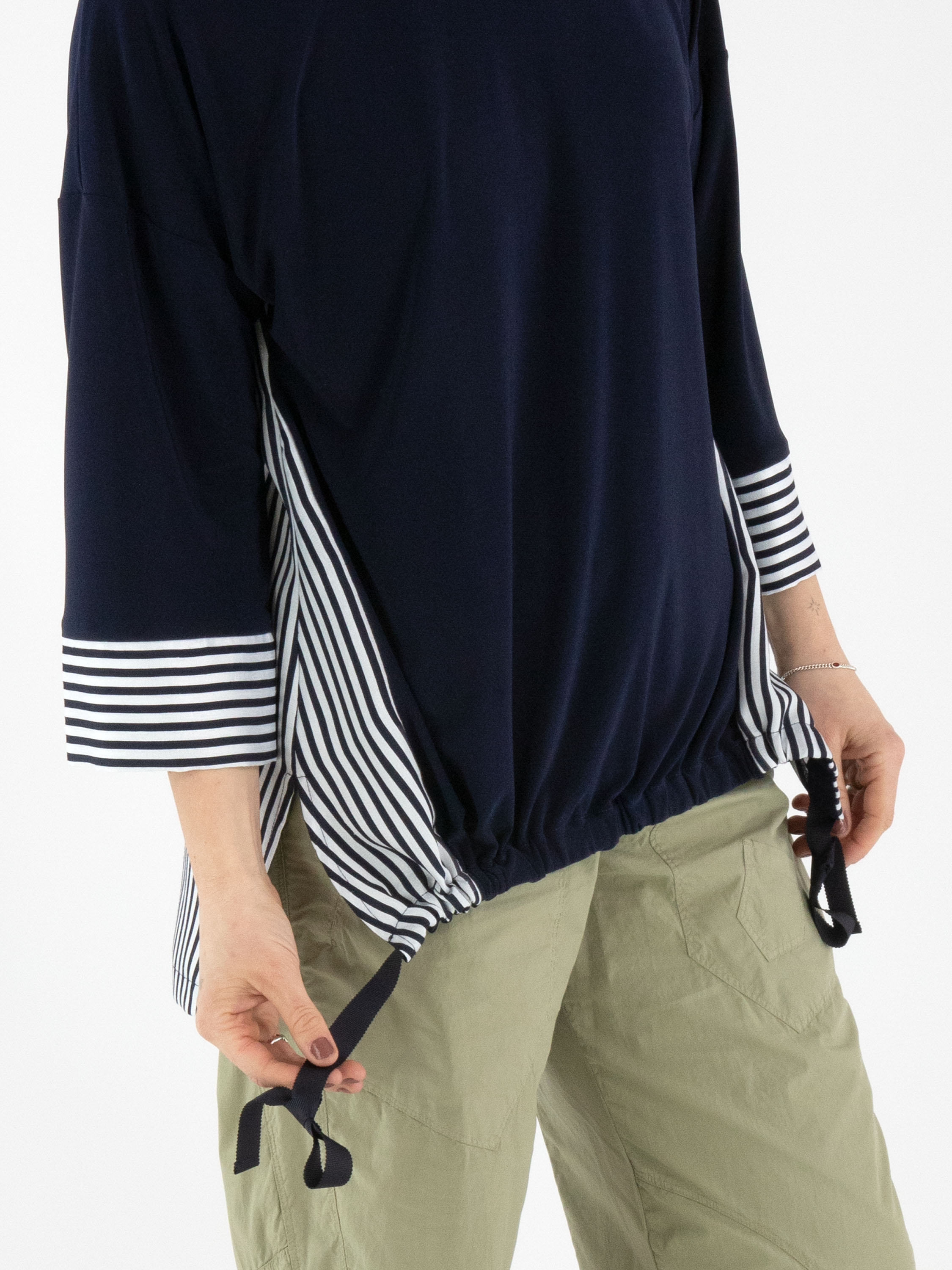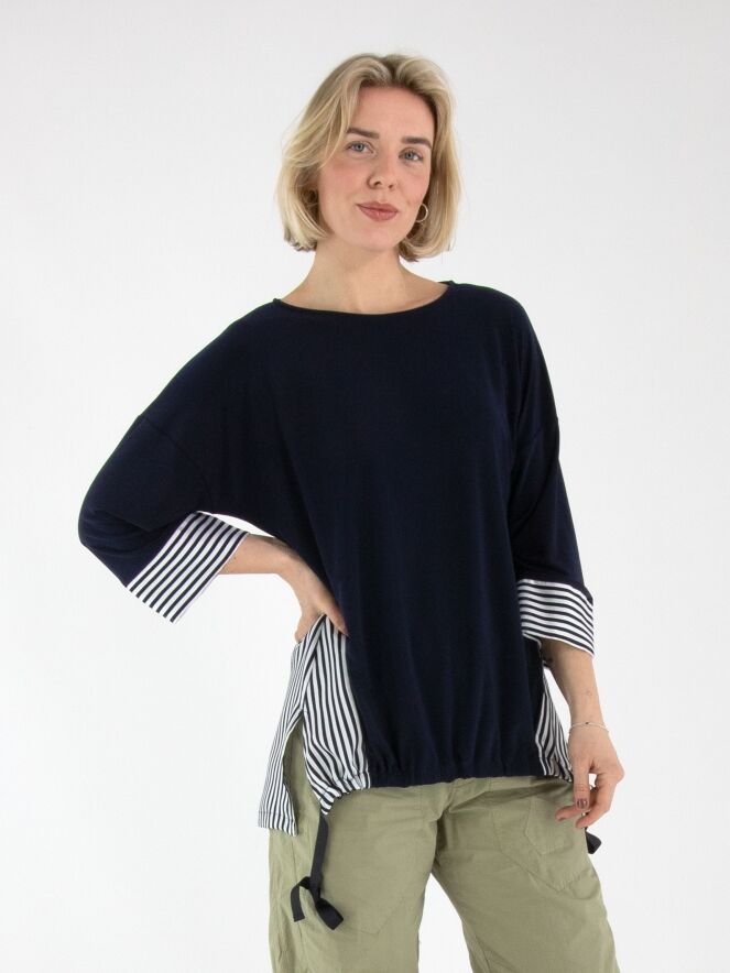 Ein Shirt von Joseph Ribkoff mit einer unifarbenen marineblauen Vorderseite und einer gestreiften Rückseite in Cremeweiß und Marineblau. Die Manschetten der halblangen Ärmel sind ebenfalls aus dem gestreiften Stoff gefertigt. Am vorderen Saum ist ein Band in Tunnelverarbeitung eingearbeitet, mit dem ein Falteneffekt erzeugt werden kann. Dieses Shirt kann von Hand gewaschen werden.