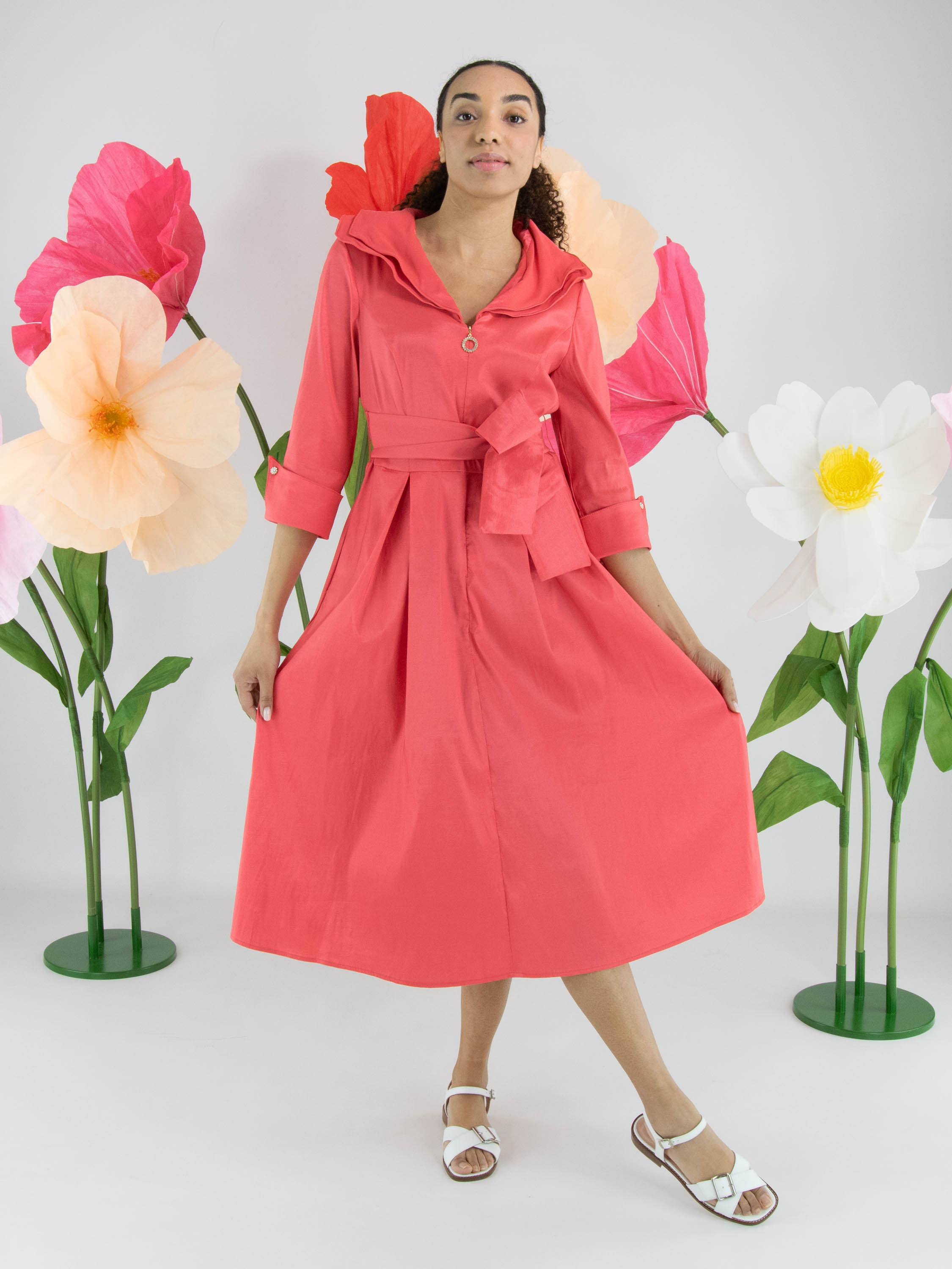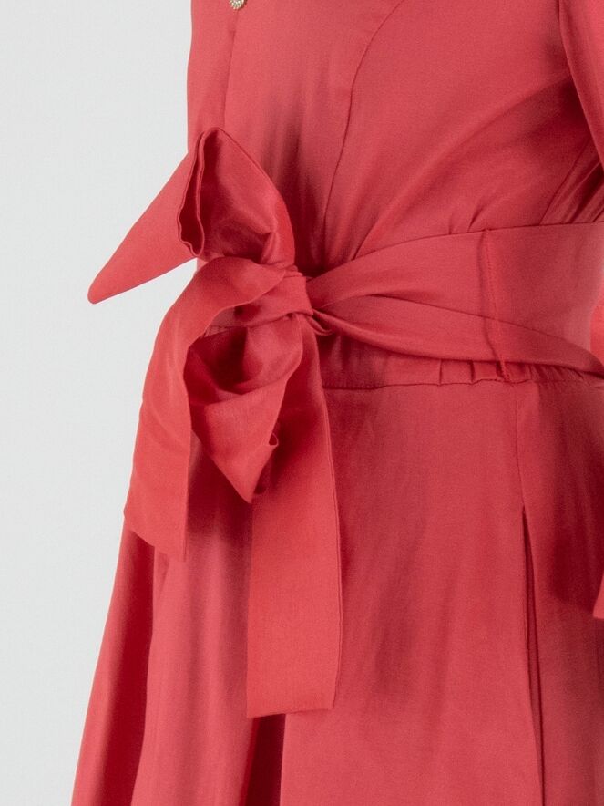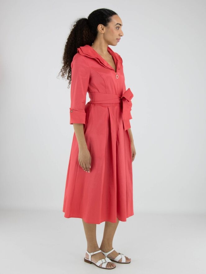 Kleid von Joseph Ribkoff aus mattem Satin in einem intensiven Korallrot. Im Rand des doppelten Kragens ist ein biegsamer Draht eingearbeitet, mit dem sich der Kragen individuell in Form bringen lässt und so eine ausdrucksstarke Note erhält. Die halblangen Ärmel sind mit breiten Umschlagmanschetten und einer Knopfleiste mit Imitationsdiamanten versehen, was einen luxuriösen Akzent setzt. In der Taille befindet sich ein breiter Gürtel, der zu einer dekorativen Schleife gebunden werden kann. Mehrere Falten in der Taille sorgen für einen elegant fließenden Effekt nach unten. Dieses exklusive Designerkleid sollte per Hand gewaschen werden.