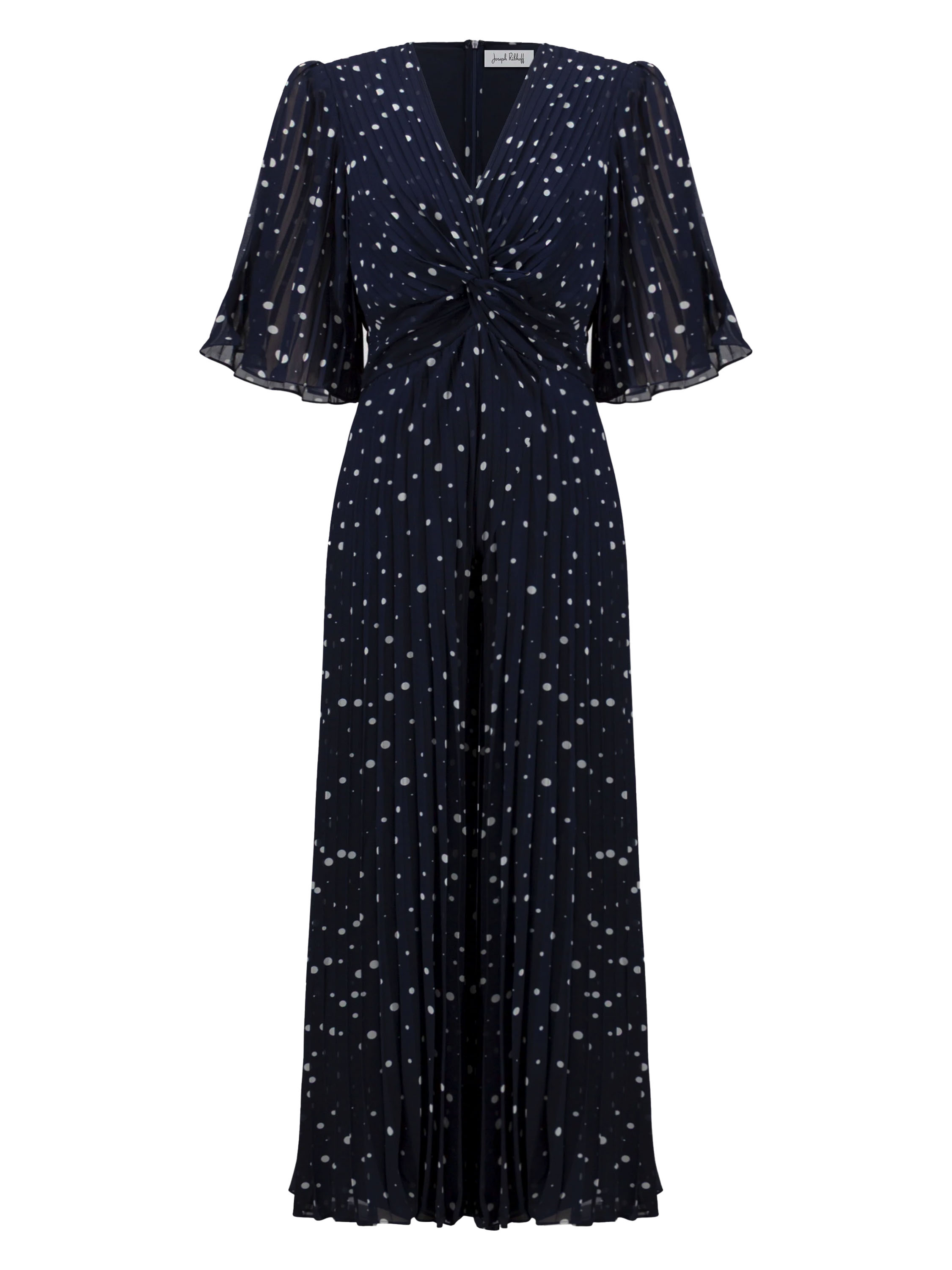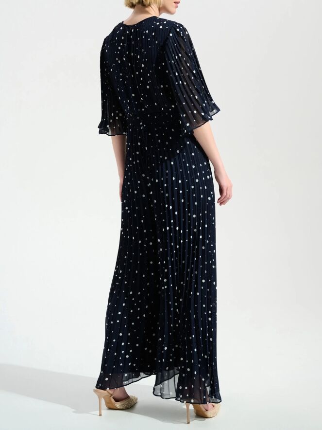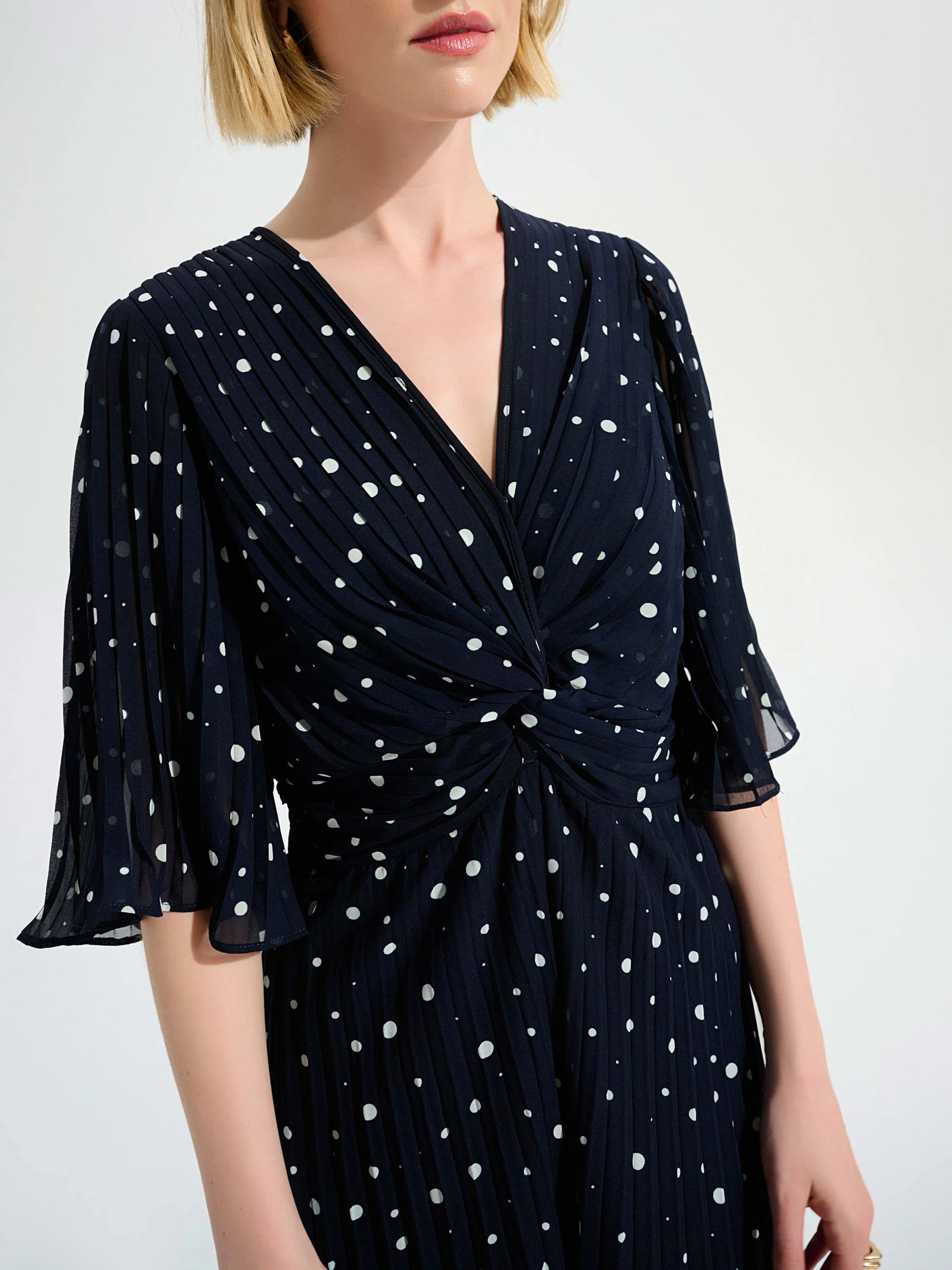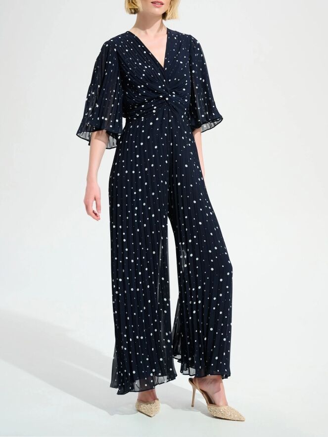 Ein Jumpsuit von Joseph Ribkoff mit einem Tupfenprint in Marineblau und Weiß. Der Stoff ist plissiert. Der untere Teil des V-Ausschnitts ist als Umschlag gearbeitet, der von diesem Punkt aus zu den Seiten der Taille verläuft. Die kurzen Ärmel sind aus Voile gefertigt und weit ausgestellt. Auf der Rückseite verläuft ein Reißverschluss vom Ausschnitt bis zur Taille, wo ein breites elastisches Band eingearbeitet ist. Dieser Jumpsuit kann von Hand gewaschen werden.