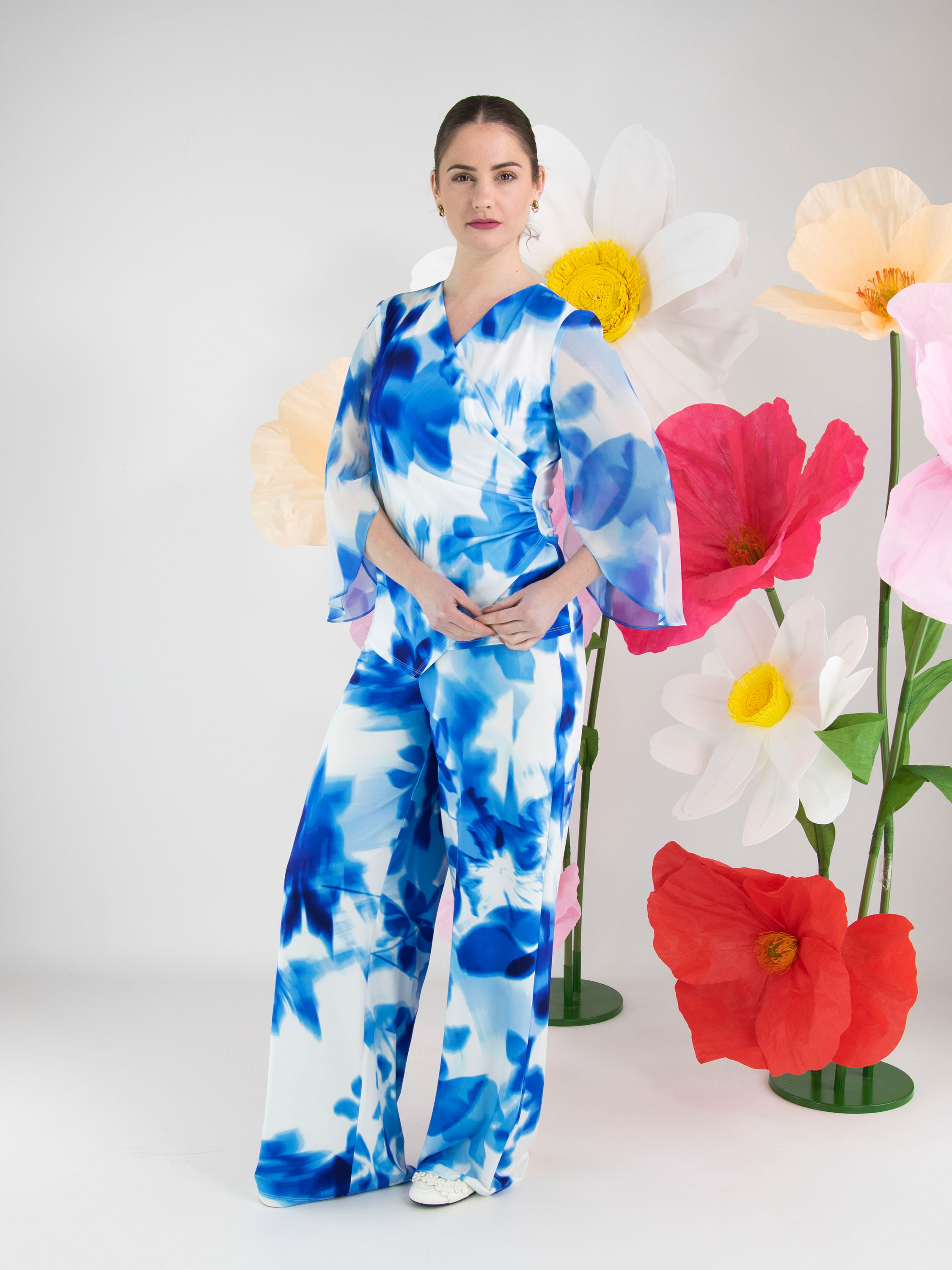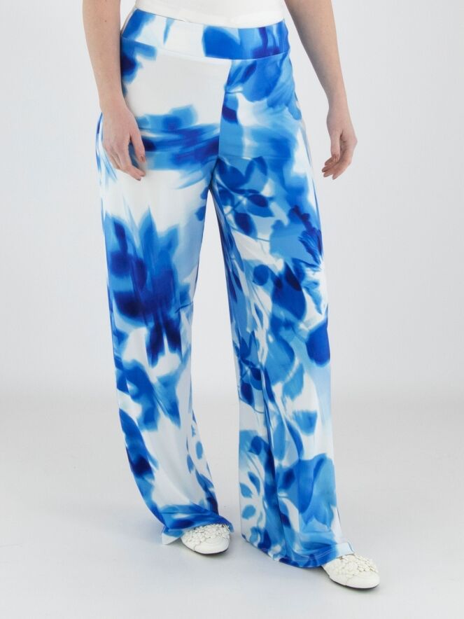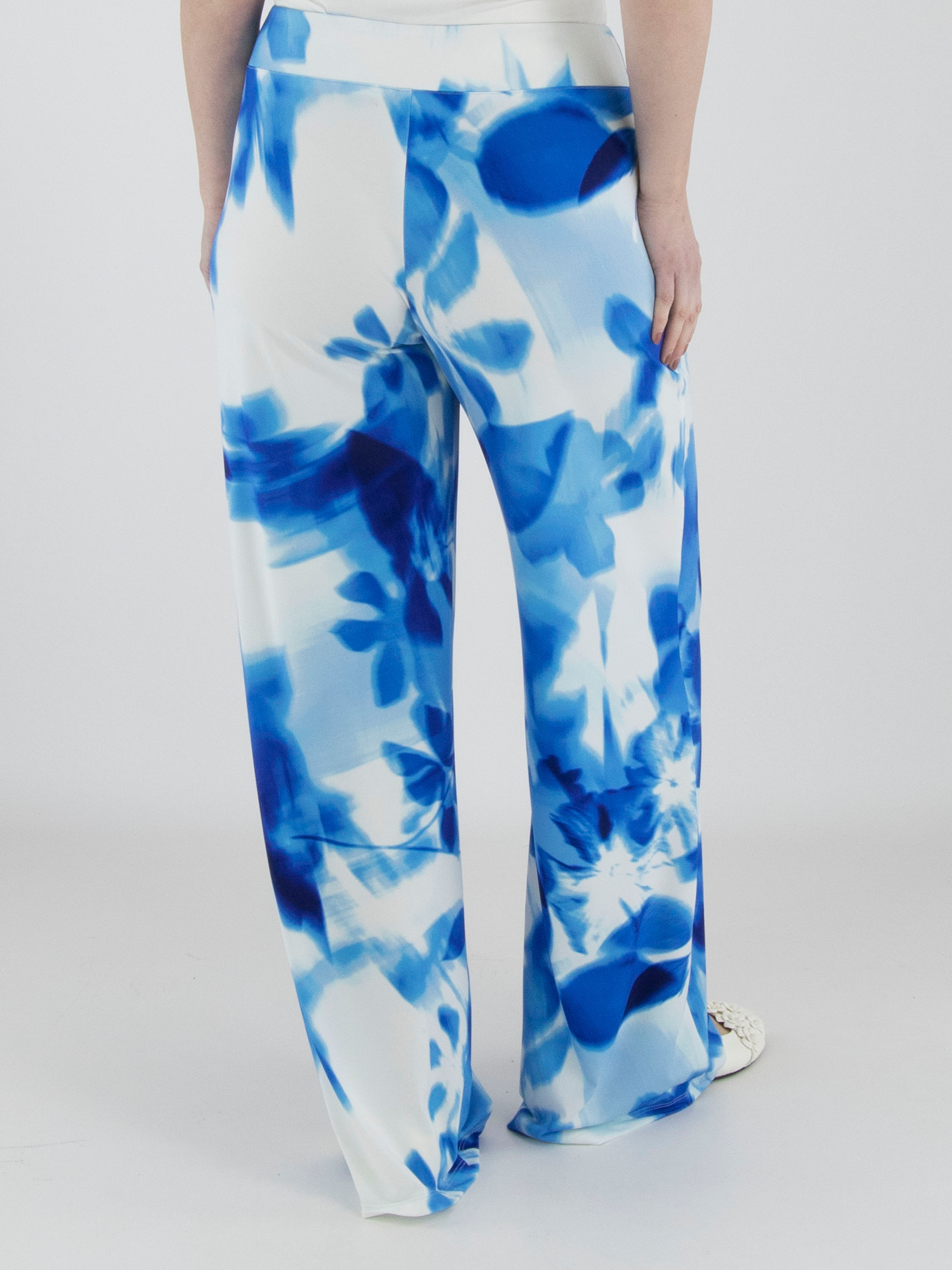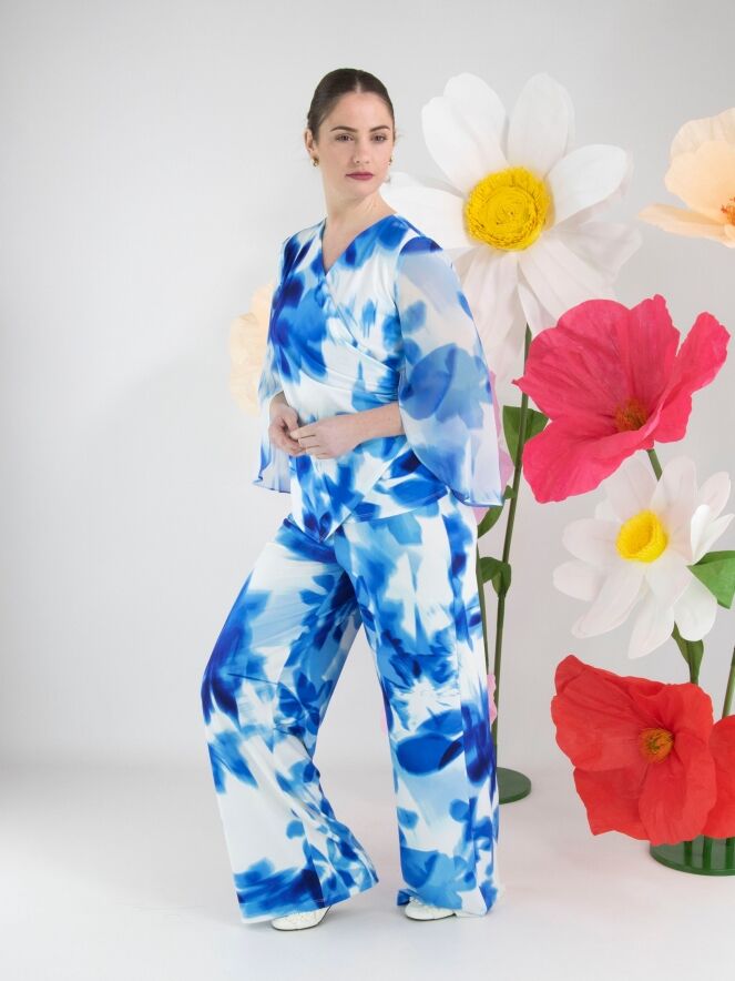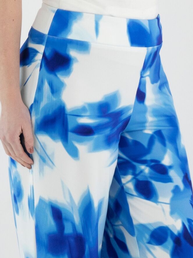 Ein Wickelshirt von Joseph Ribkoff mit grafischem Print in mehreren leuchtenden Blautönen und Weiß. Auf Taillenhöhe, dort wo der Wickel in die Naht eingearbeitet ist, ist der Stoff fein plissiert. Die halblangen Ärmel sind aus transparentem Stoff gefertigt und haben einen Schlitz bis zum Ärmelansatz. Der Saum ist diagonal geschnitten. Dieses Shirt kann per Hand gewaschen werden.