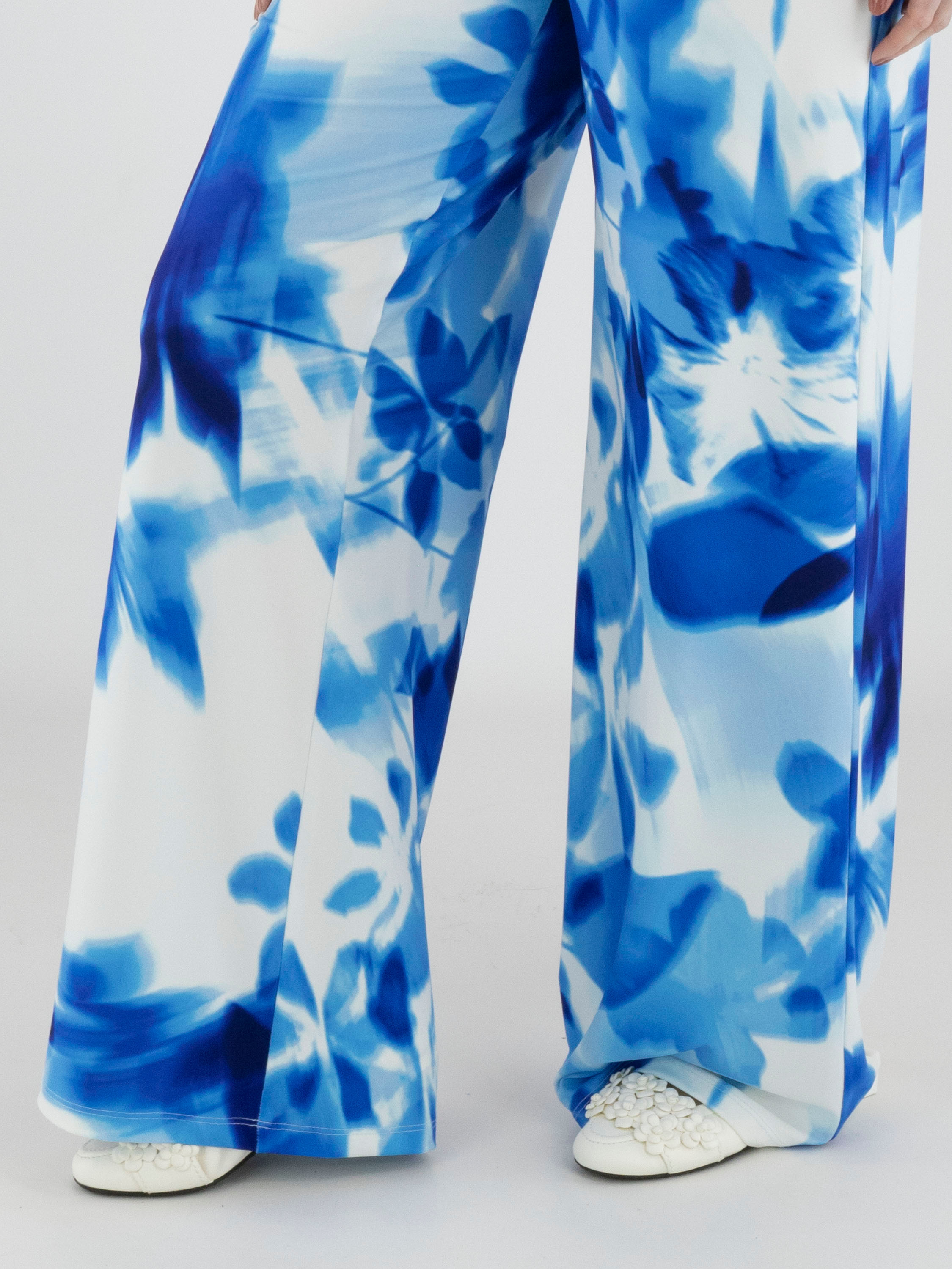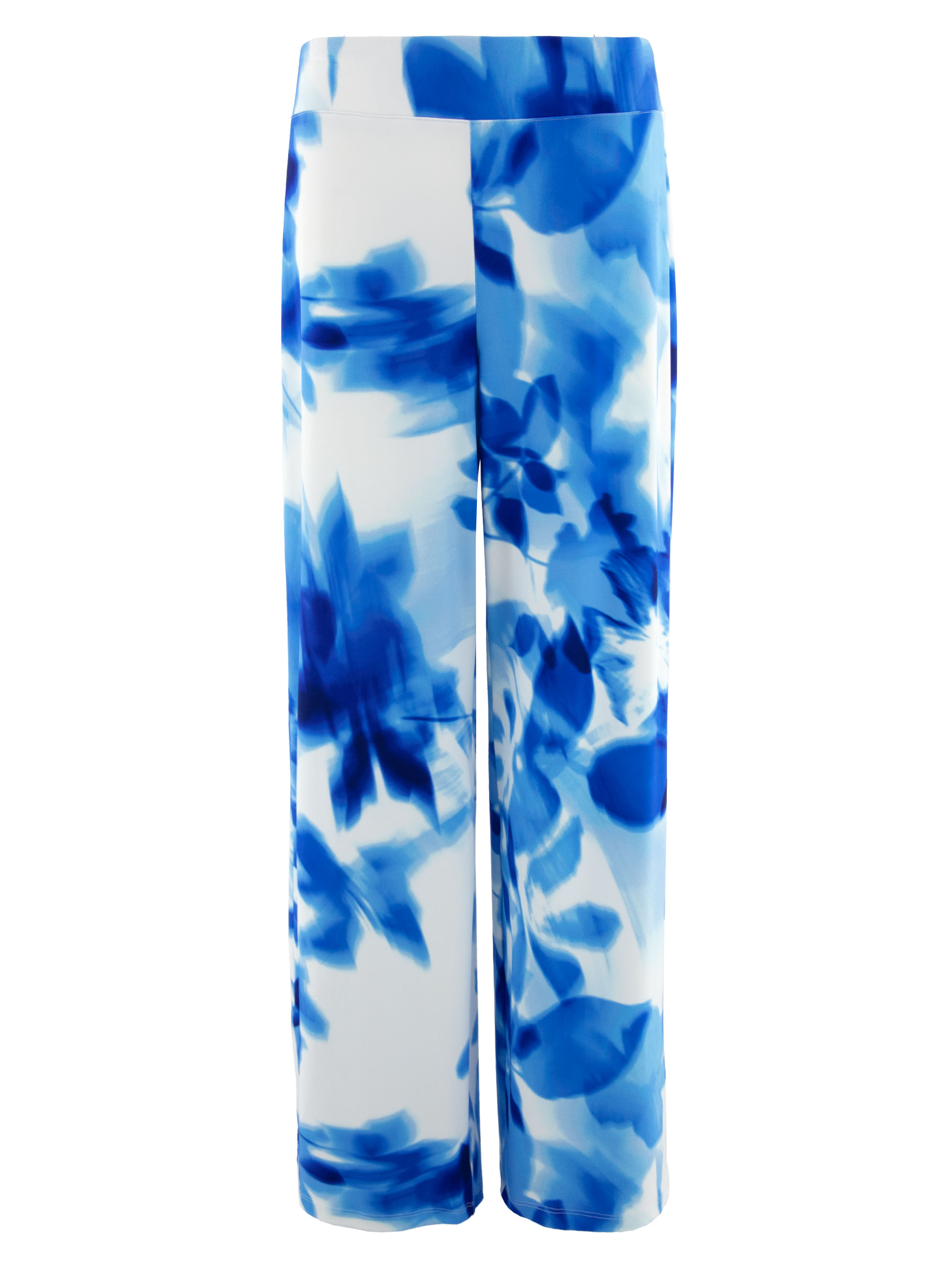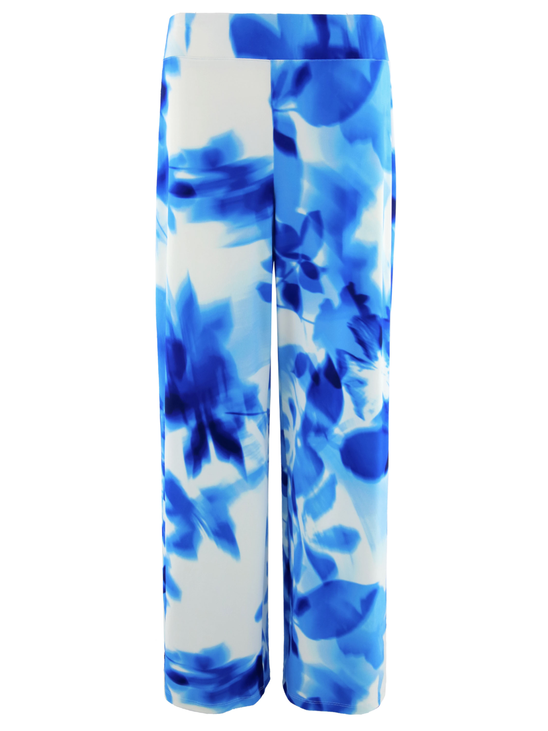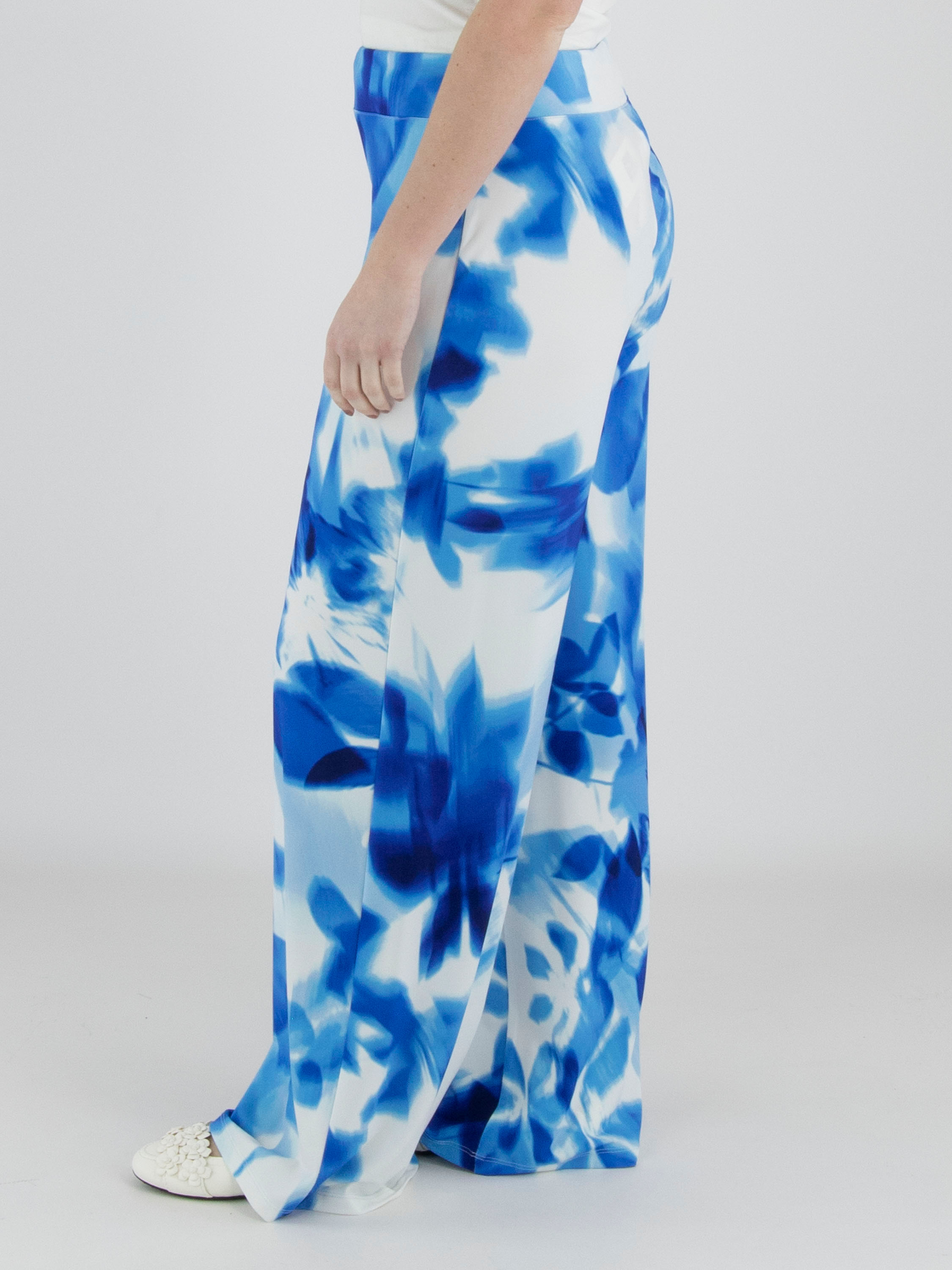 Ein Wickelshirt von Joseph Ribkoff mit grafischem Print in mehreren leuchtenden Blautönen und Weiß. Auf Taillenhöhe, dort wo der Wickel in die Naht eingearbeitet ist, ist der Stoff fein plissiert. Die halblangen Ärmel sind aus transparentem Stoff gefertigt und haben einen Schlitz bis zum Ärmelansatz. Der Saum ist diagonal geschnitten. Dieses Shirt kann per Hand gewaschen werden.