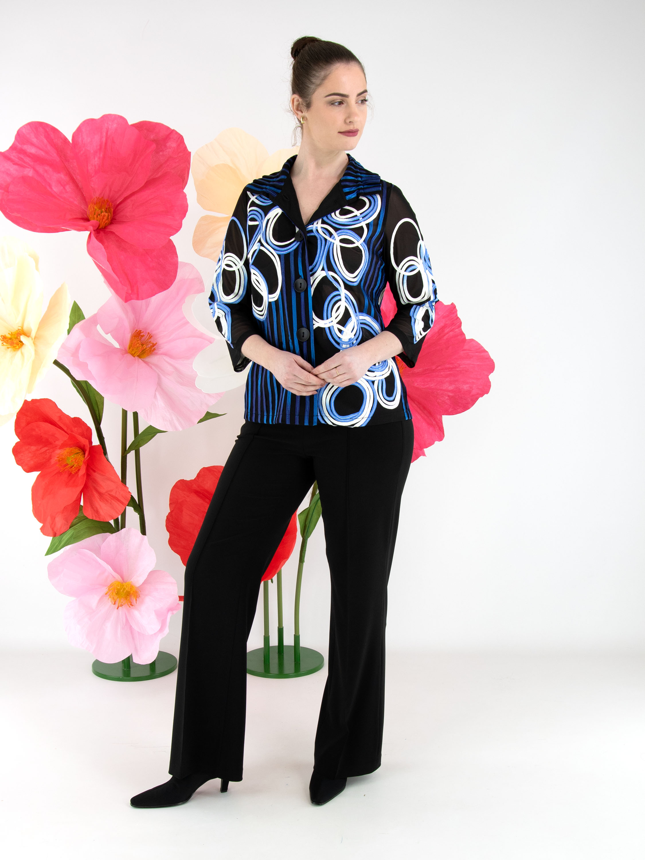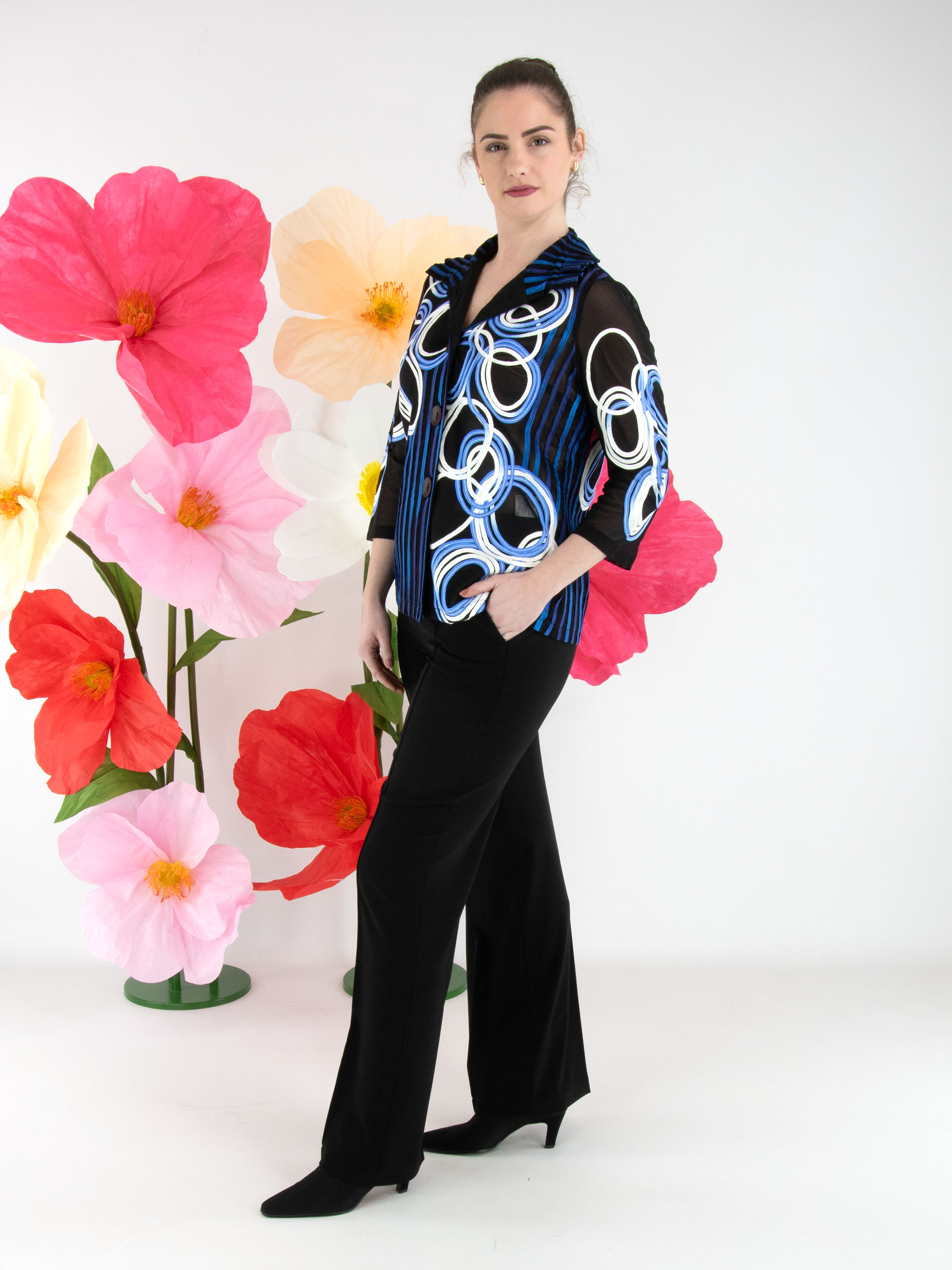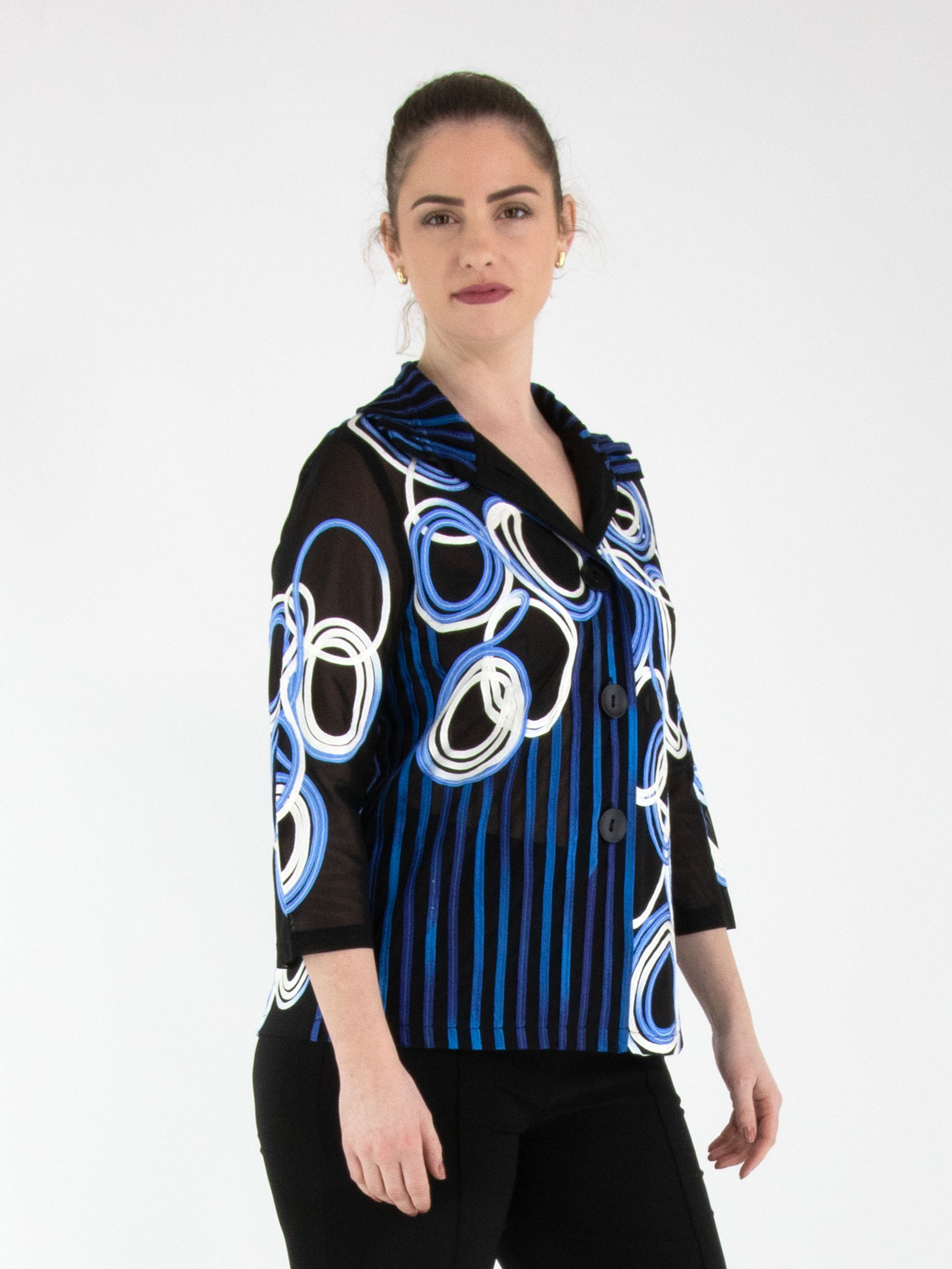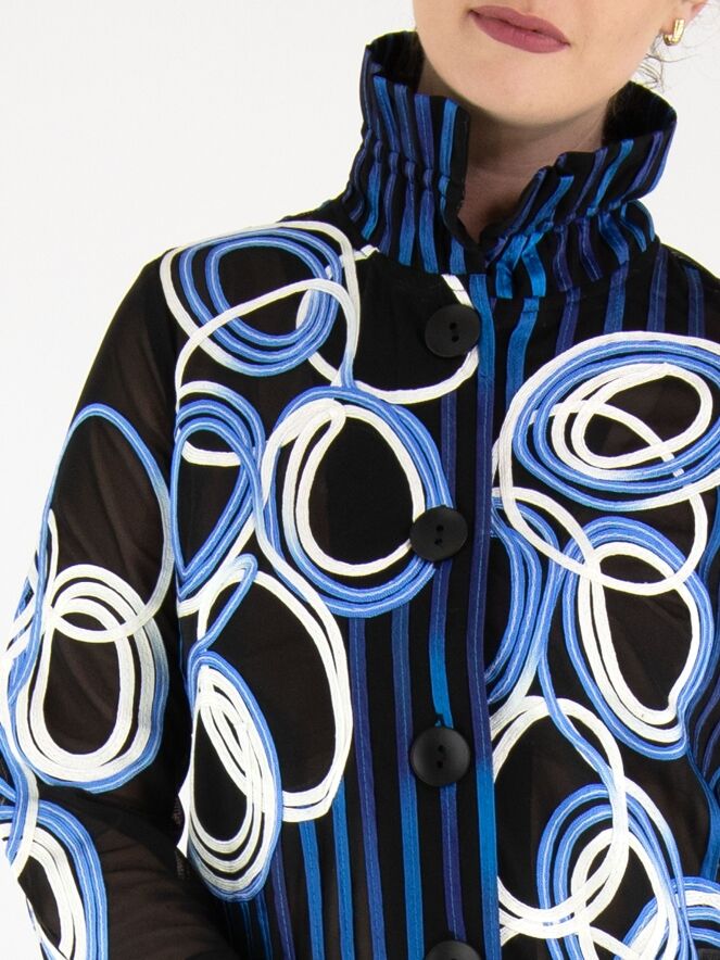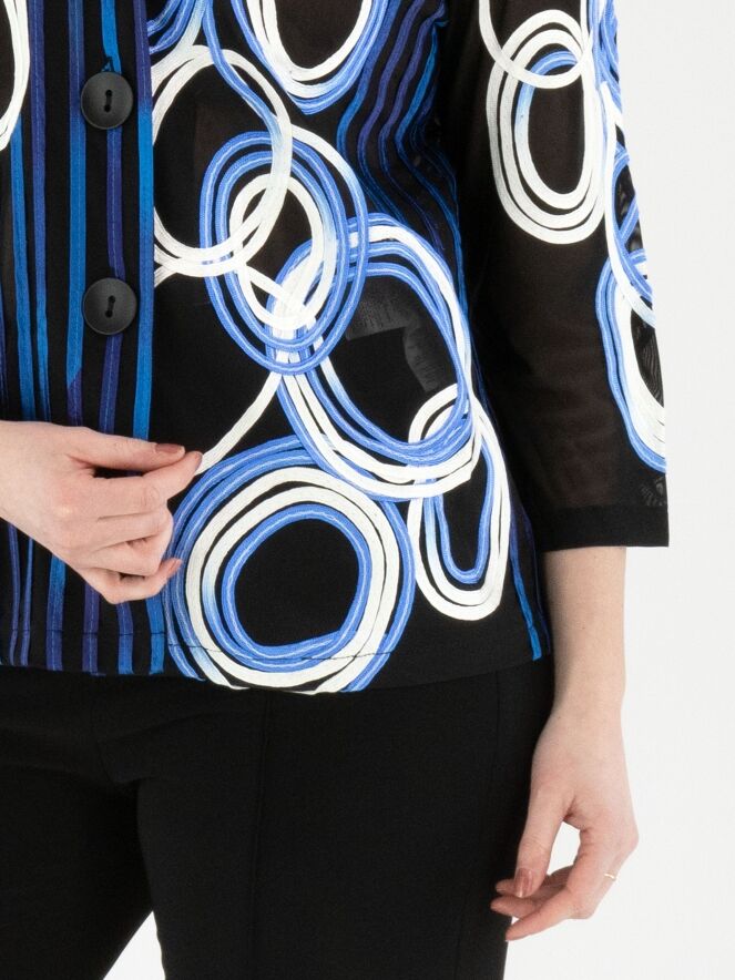 Ein leicht transparenter Blazer von Joseph Ribkoff mit einem Muster aus vertikalen Linien und kreisförmigen Linien in mehreren Blau- und Weißtönen auf schwarzem Hintergrund. Der Blazer hat einen Verschluss mit zwei Knöpfen und halblange Ärmel. Dieser Blazer kann von Hand gewaschen werden.