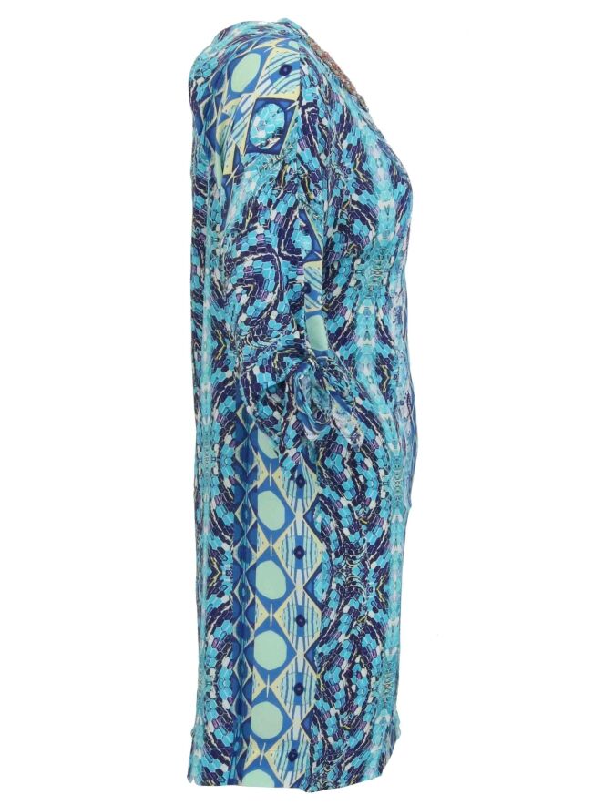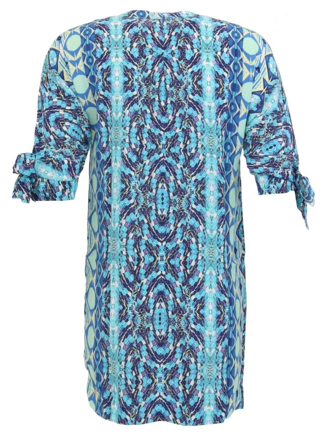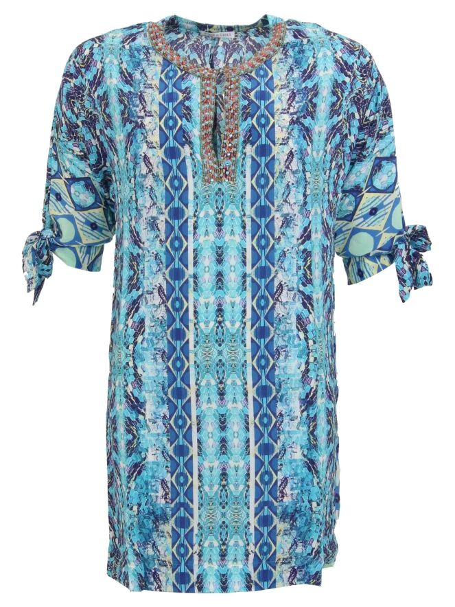 Tunika der Designermarke Joyce & Girls mit Grafikdruck in Aqua und verschiedenen Blautönen. Die kurzen Ärmel sind mit einem Band für einen dekorativen Knoten versehen. In der Mitte des Rundhalsausschnitts ist eine Kerbe. Entlang der Kante des Ausschnitts und der Kerbe befindet sich ein breites Band mit rotem und aquafarbigem Strass. Diese Tunika darf nicht gewaschen werden.