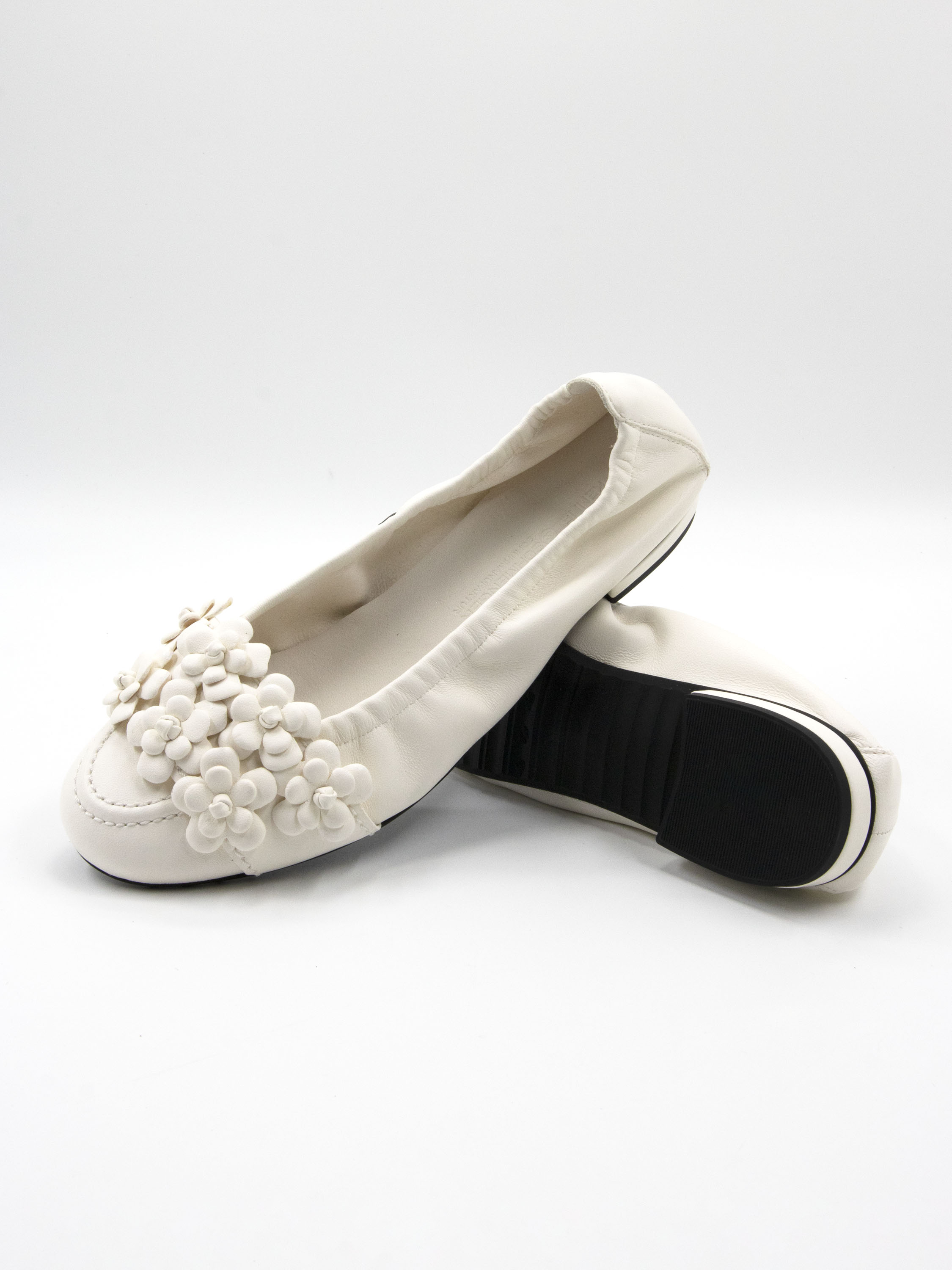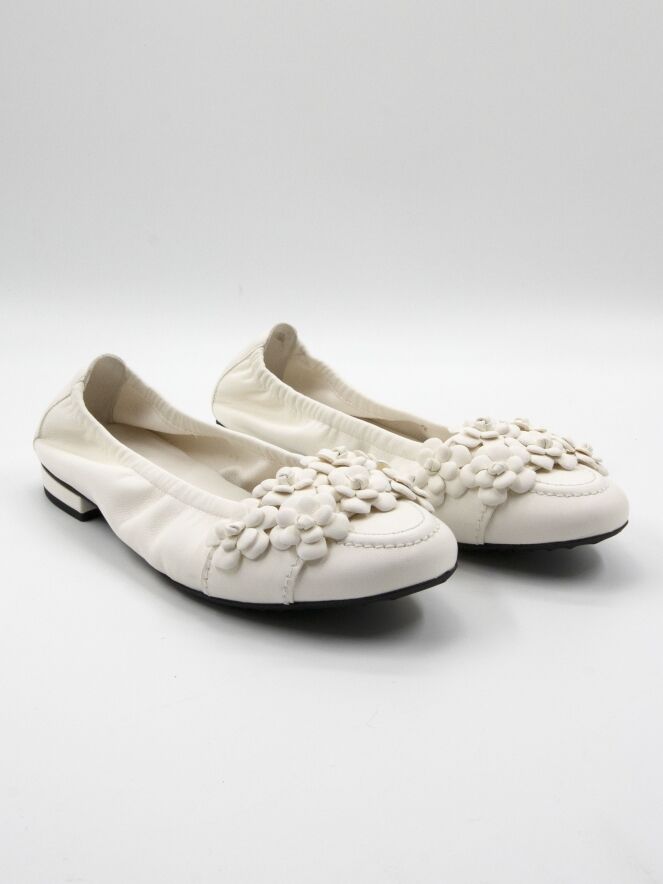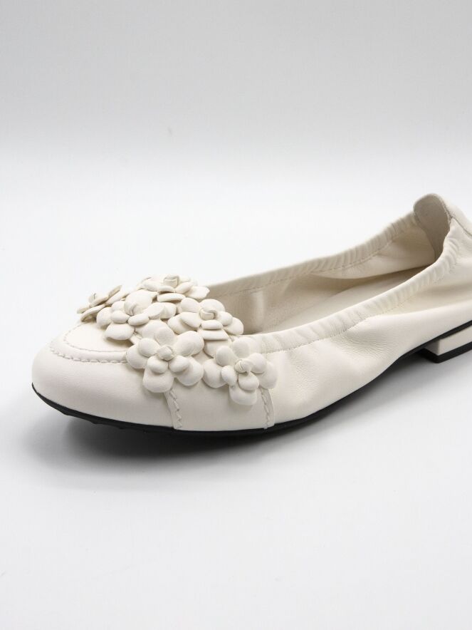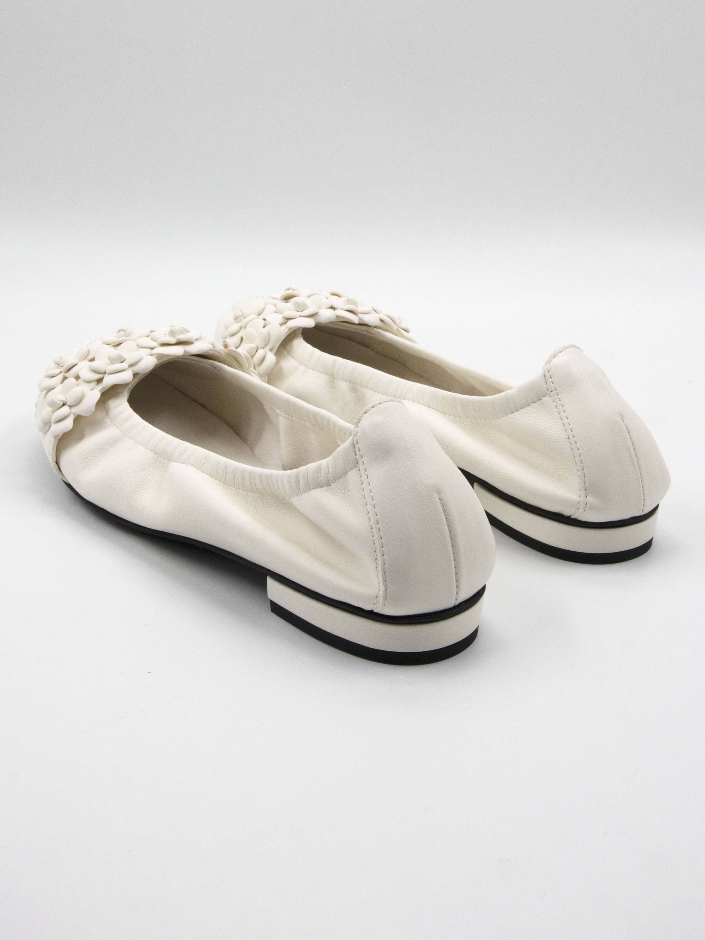 Eine Ballerina von Kennel & Schmenger in Cremeweiß. Über den Vorderfuß verläuft ein breiter Riemen mit dekorativen Blüten. Der Rand des Absatzes ist mit cremeweißem Leder bezogen. Die schwarze Laufsohle ist an der Unterseite leicht gerippt.