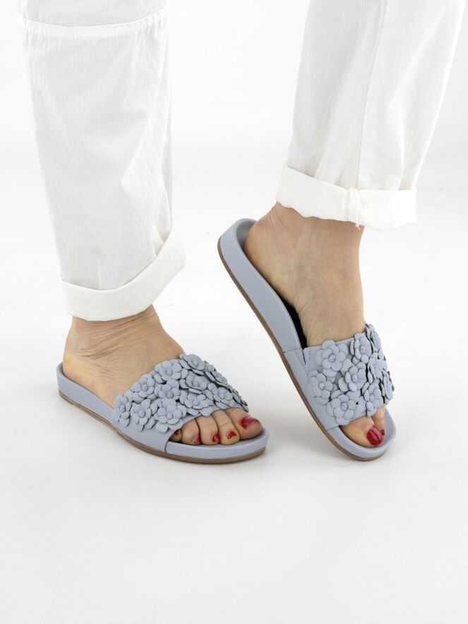 Pantolette von Kennel & Schmenger in einem hellblau bis gräulichen Farbton. Ein breites Band über dem Vorderfuß ist mit dekorativen Blüten verziert und verleiht dem Modell eine feminine, elegante Ausstrahlung.