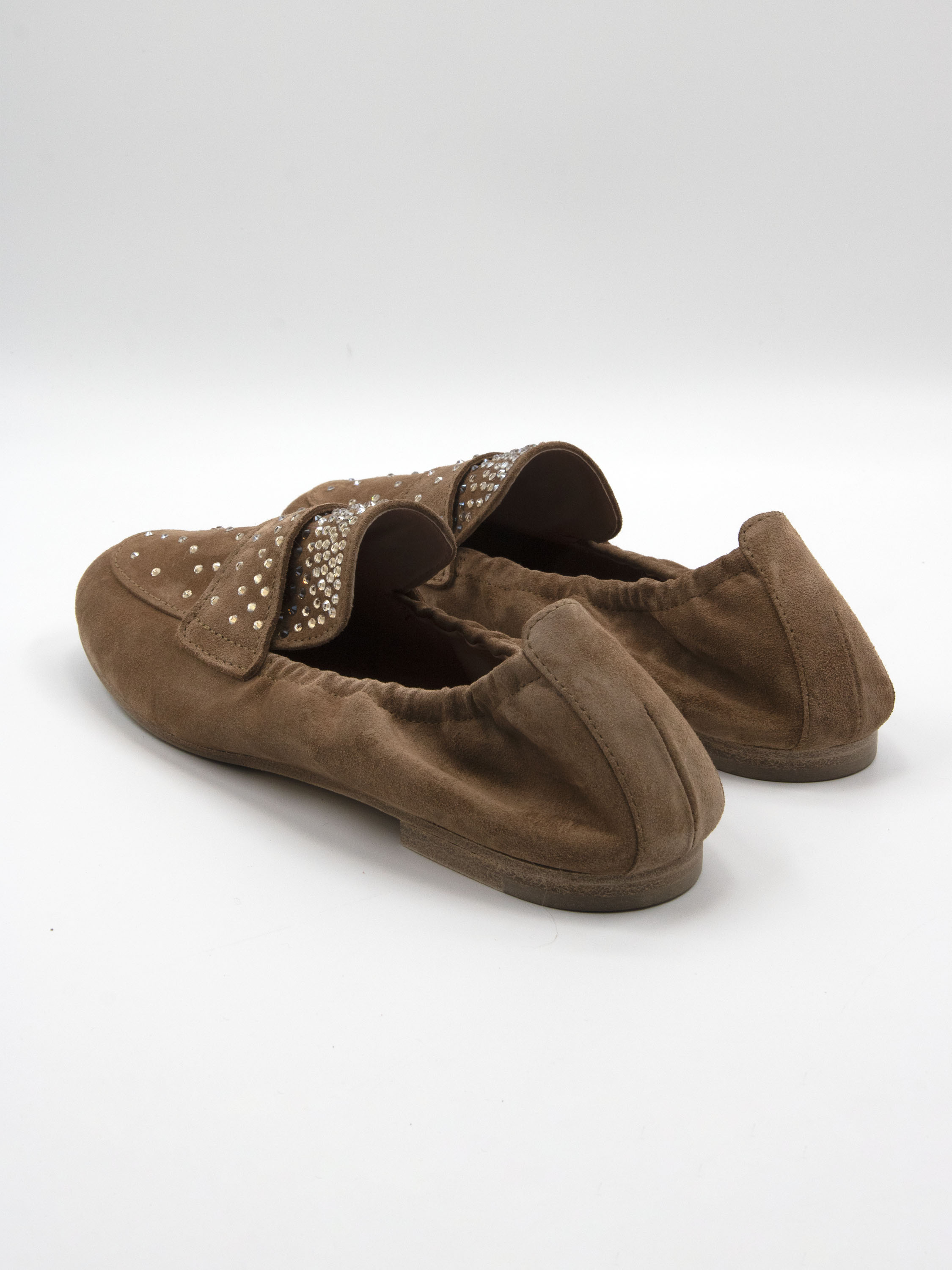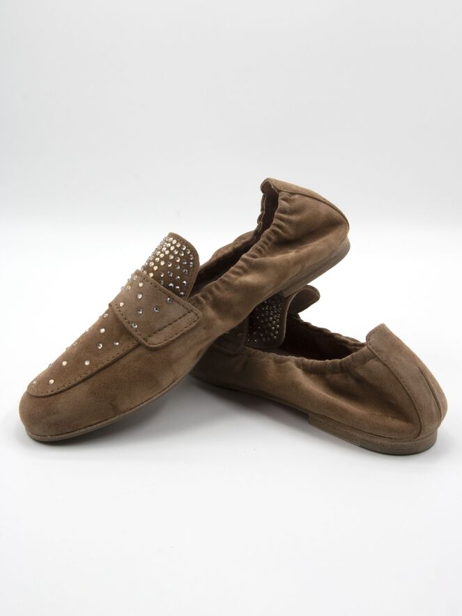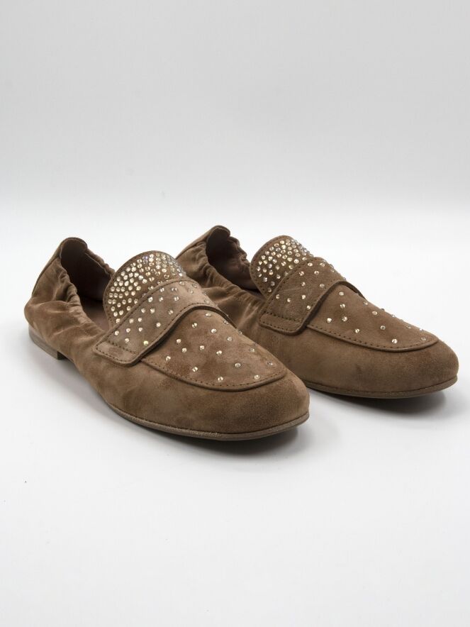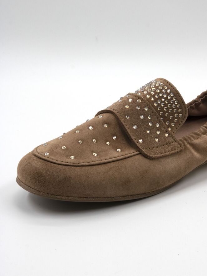 Ein Slipper von Kennel & Schmenger in einem soften Braun- oder Taupeton. Die seitlichen Ränder sind mit elastischen Einsätzen versehen und fein plissiert. Über dem Vorderfuß sind silberfarbene Strasssteine angebracht. Die Innenseite ist mit Leder gefüttert.