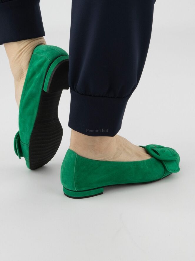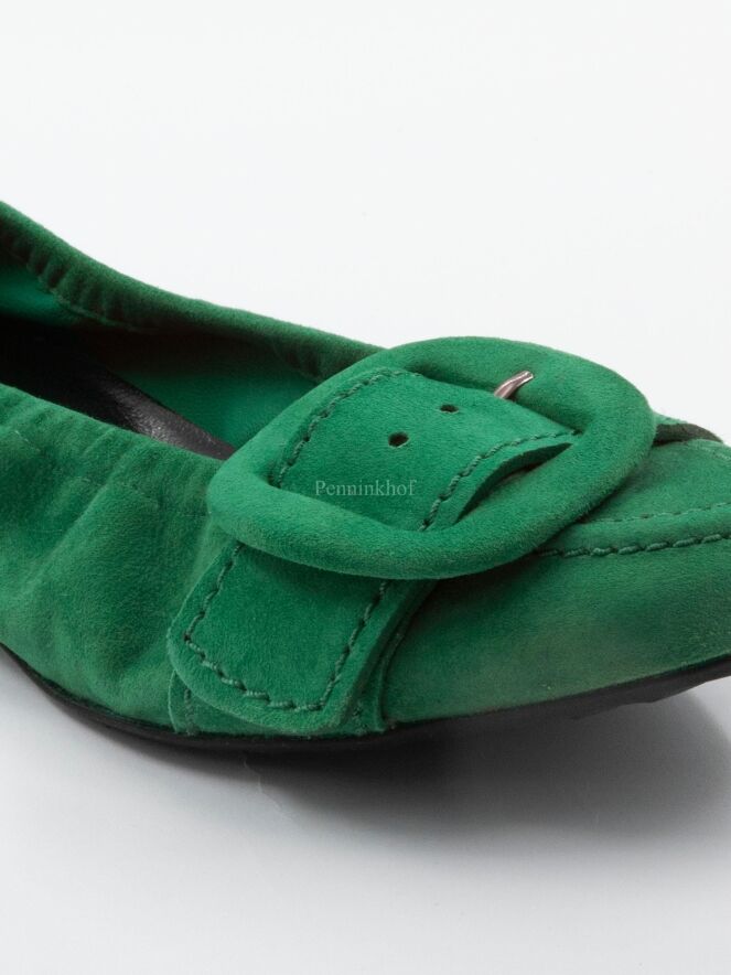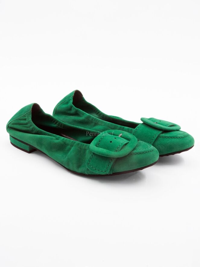 Ein smaragdgrüner Ballerina der Schuhmarke Kennel & Schmenger. Auf dem vorderen Fußteil befindet sich eine große quadratische Schnalle in Smaragdgrün. In den Rand des Schaftes ist ein Gummiband eingearbeitet.