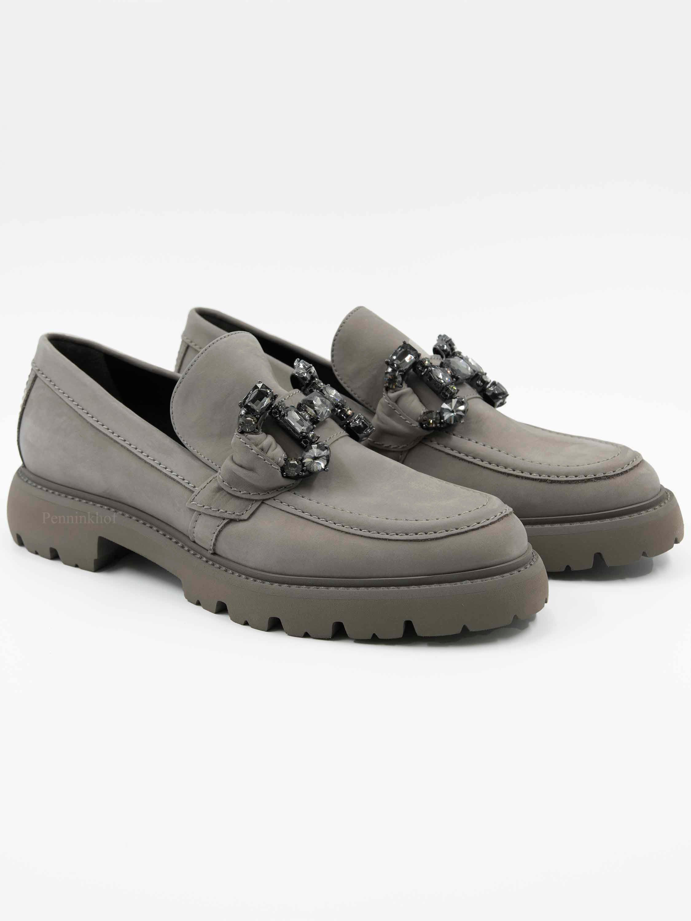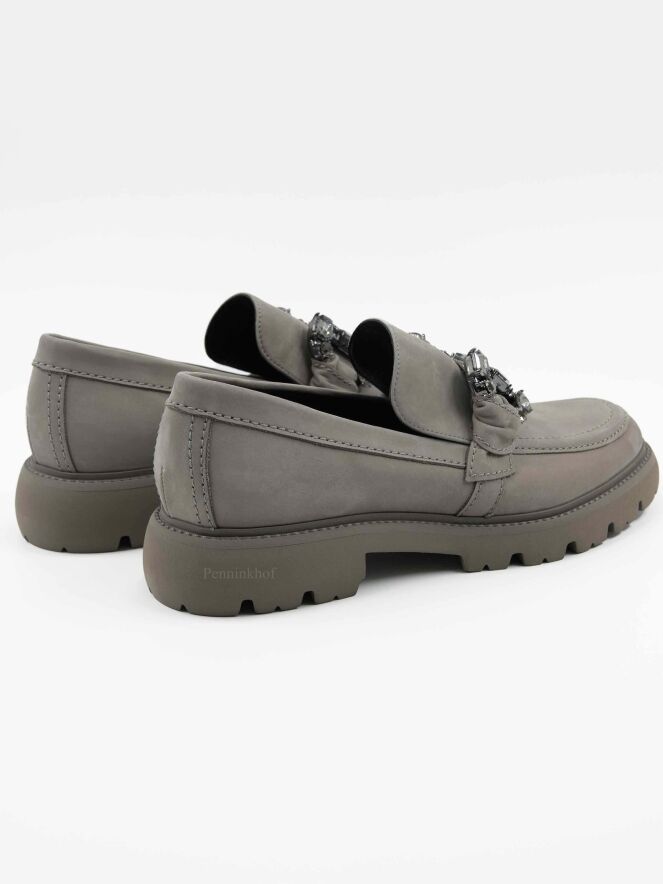 Ein Halbschuh von Kennel & Schmenger in der Farbe grau. Auf dem Vorfuß befindet sich eine dekorative Schnalle mit Strasssteinen in Gebissform. Die graue Sohle ist gerippt. Die Innenseite ist mit Leder gefüttert.