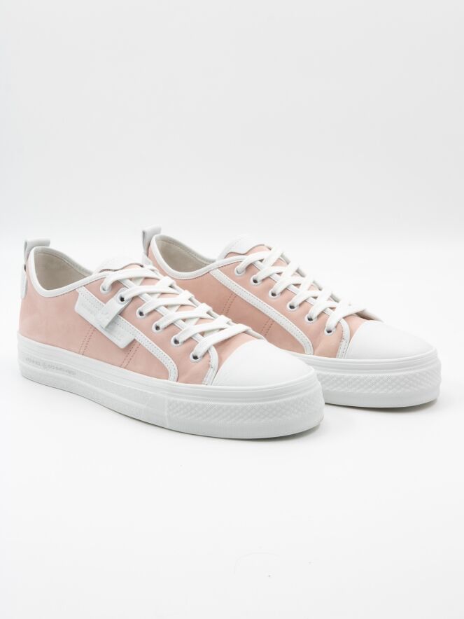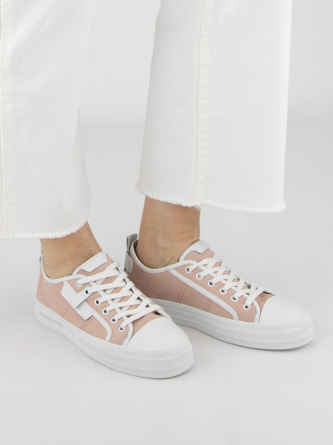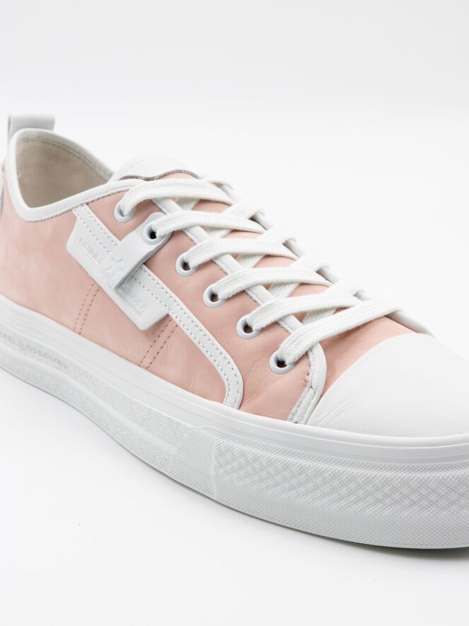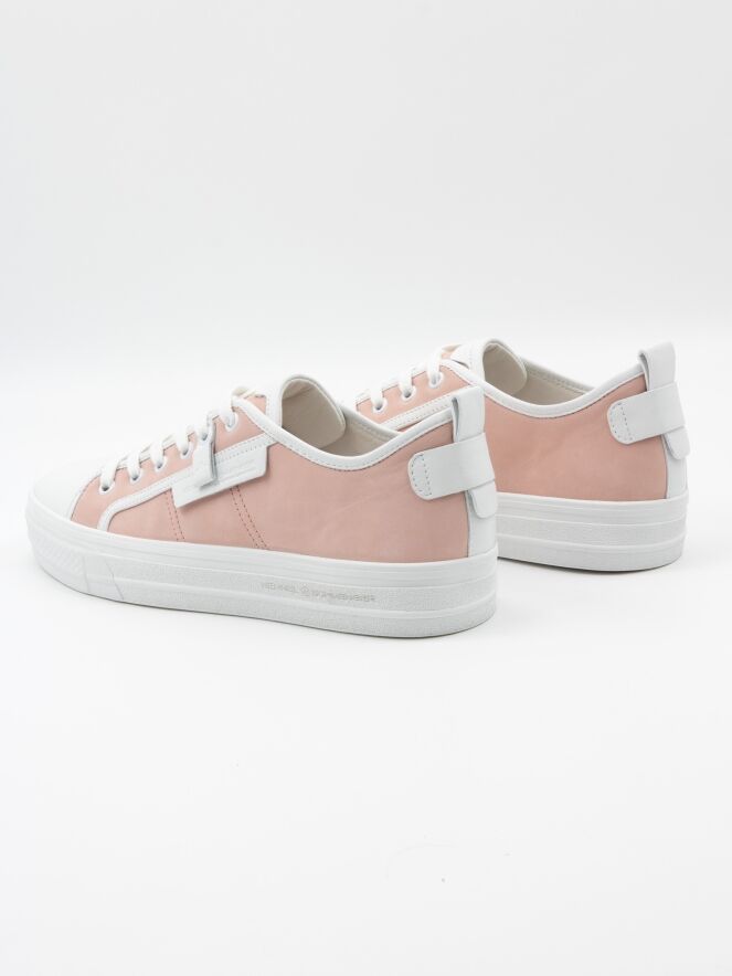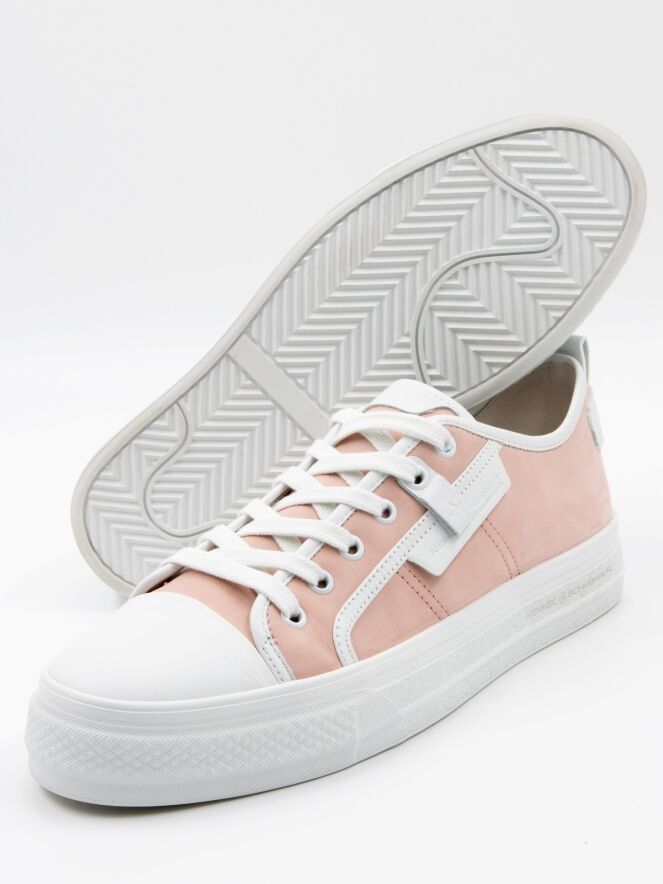 Ein flacher Sneaker von Kennel & Schmenger in rosa Farbe. Der Vorfuß besteht aus weißem Leder und entlang der Seiten und des Schafts befinden sich einige weiße Streifen. Die Plateausohle ist weiß und das Innere ist mit Leder ausgekleidet.