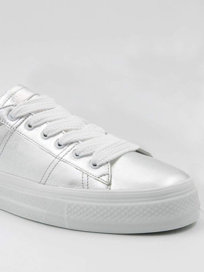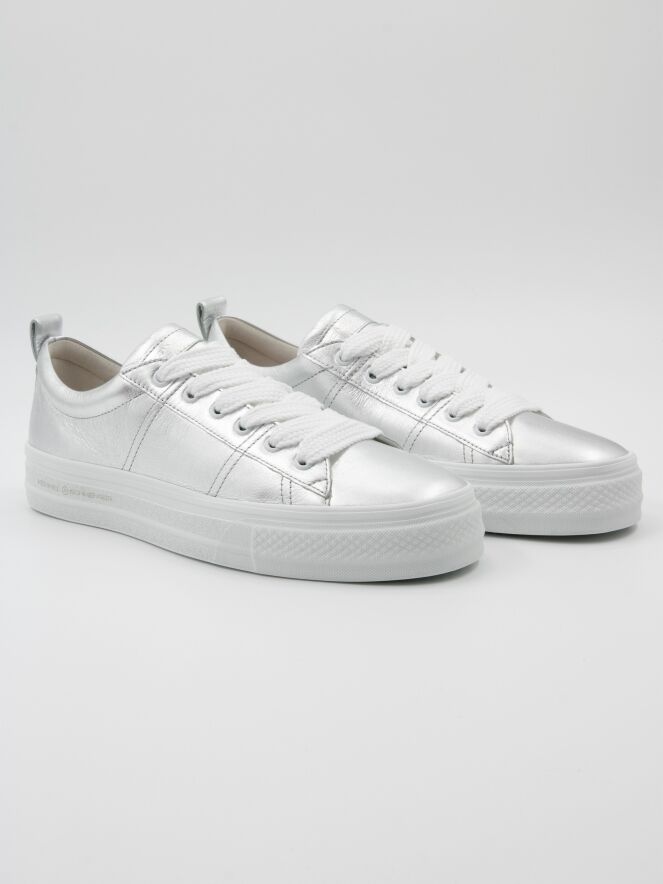 Ein flacher Sneaker von Kennel & Schmenger in Silberfarbe. Der Sneaker verfügt über breite weiße Schnürsenkel und eine weiße Plateausohle. Das Innere ist mit Leder gefüttert.