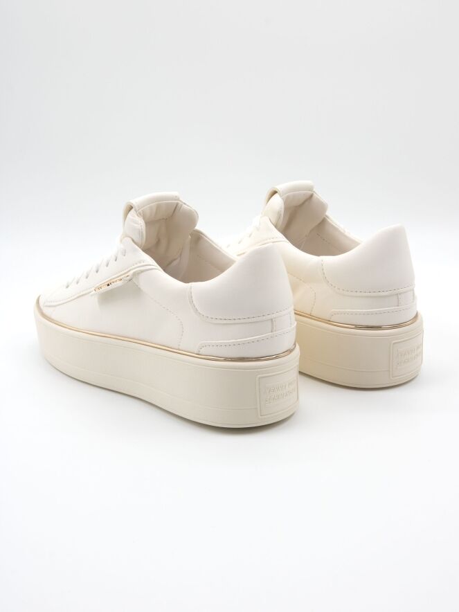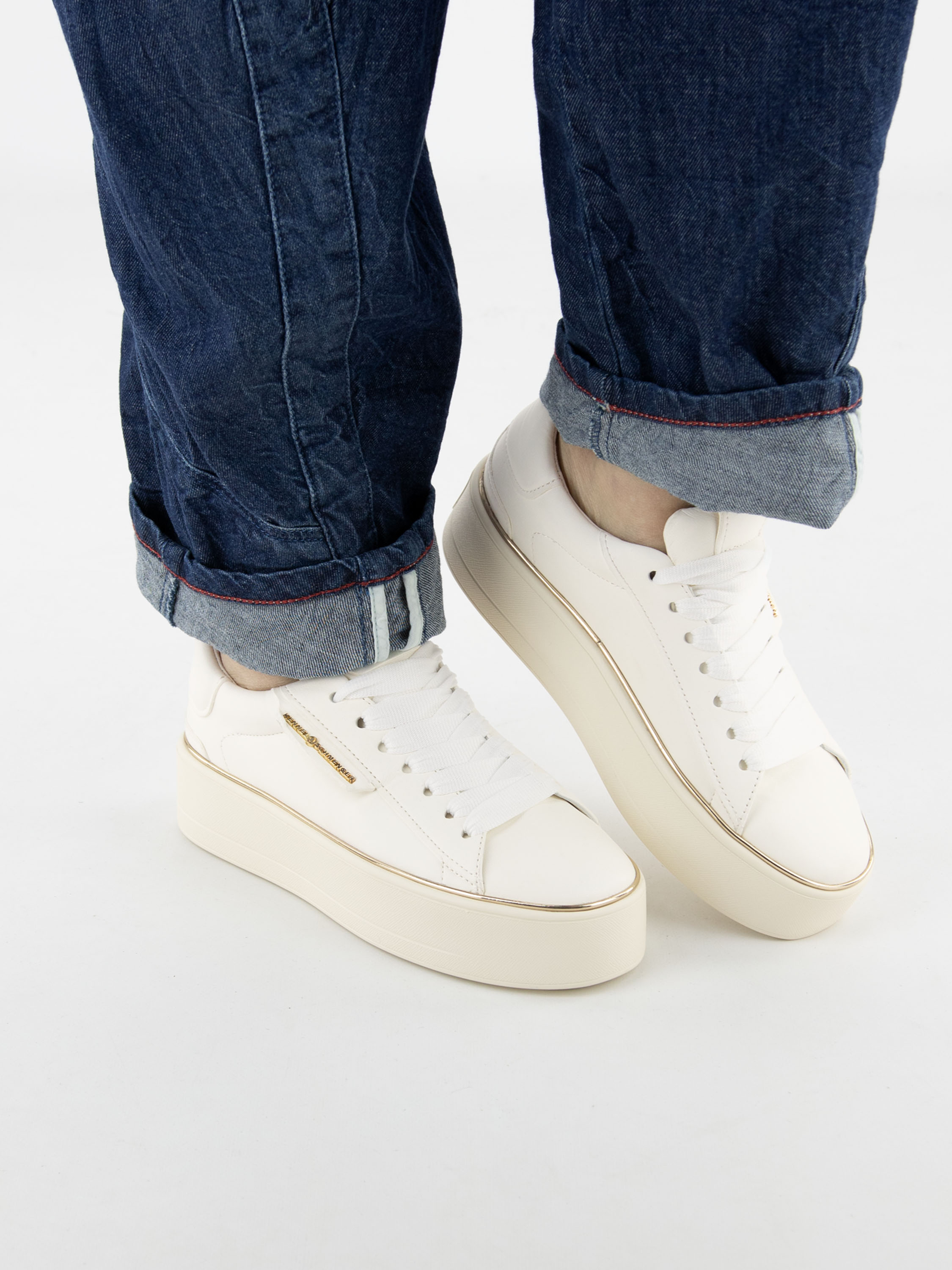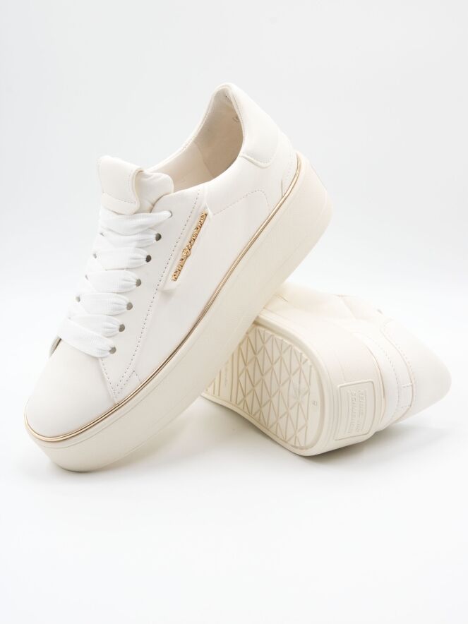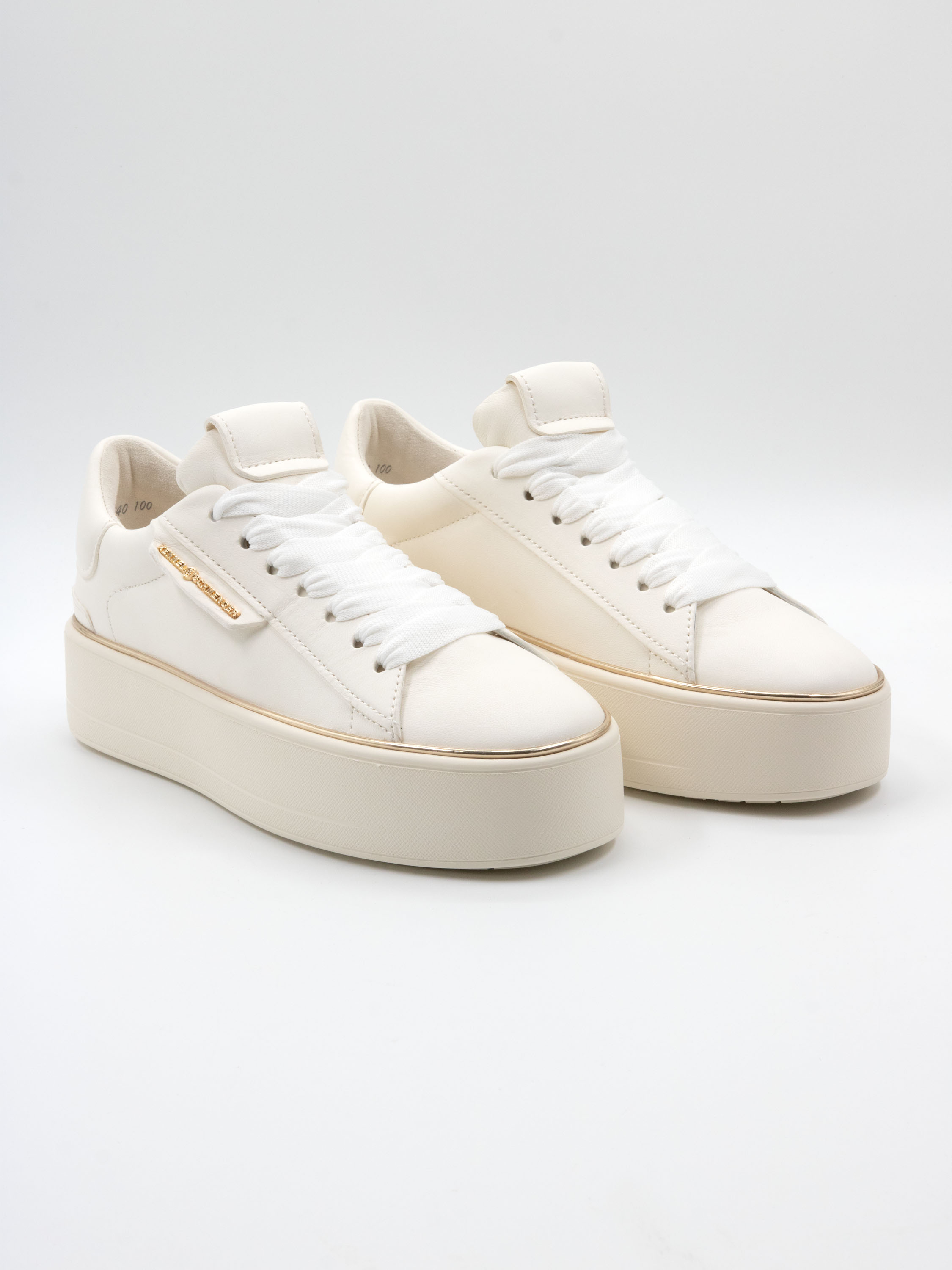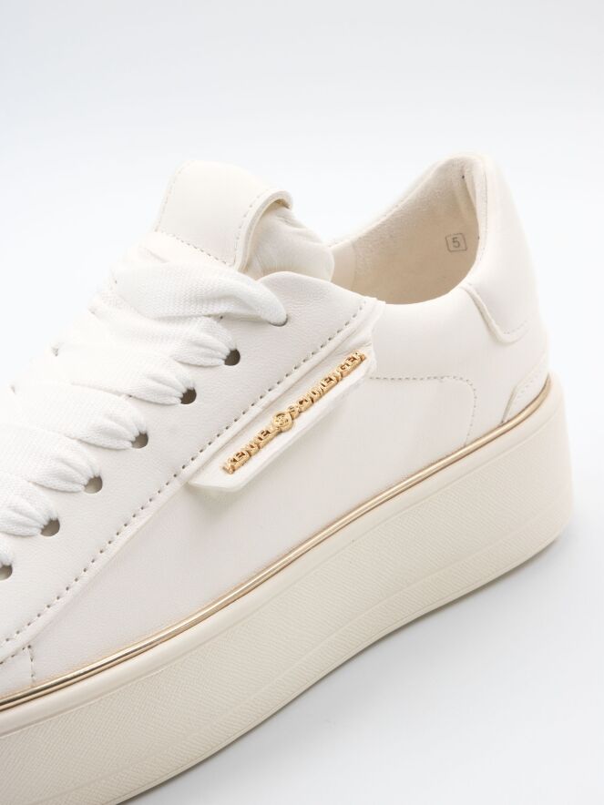 Ein luxuriöser Sneaker von Kennel & Schmenger in Cremeweiß. Entlang der cremeweißen Sohle verläuft eine goldfarbene Biese. Die Schnürsenkel sind aus weißem, matt satiniertem Stoff. Innen ist der Sneaker mit Leder gefüttert.