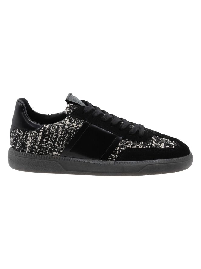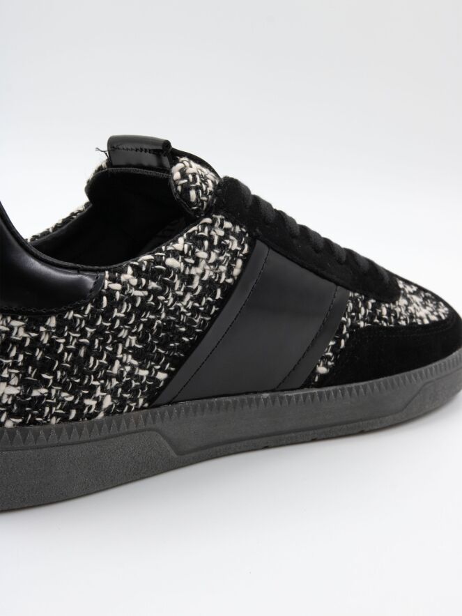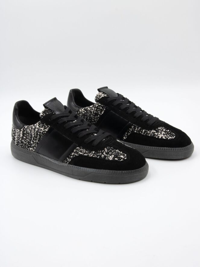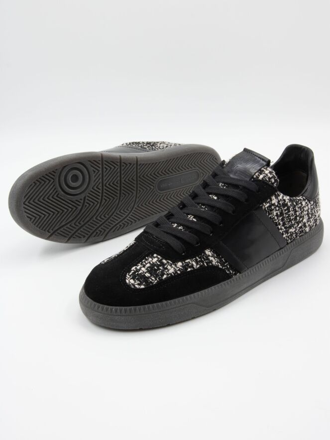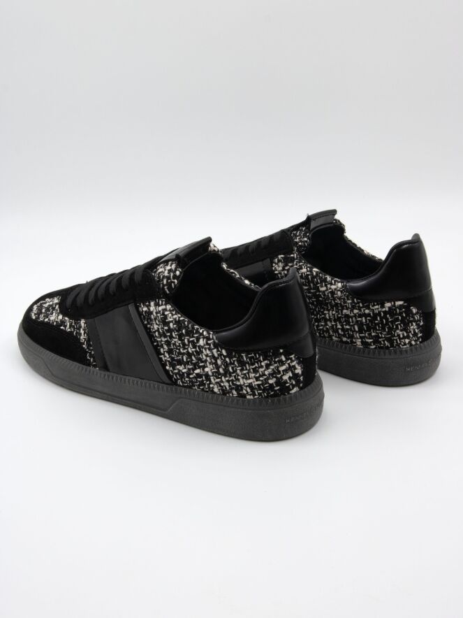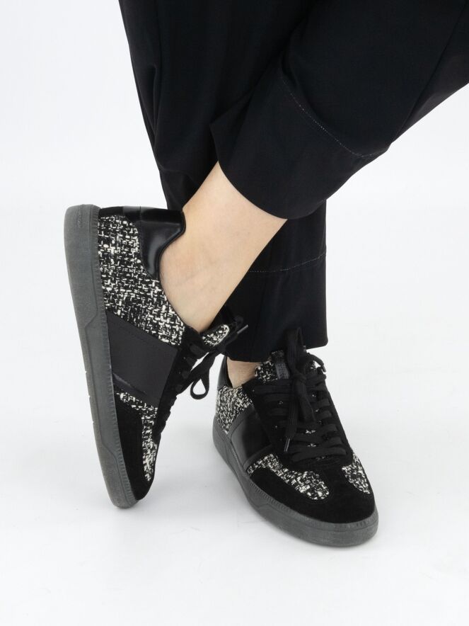 Ein luxuriöser Sneaker von Kennel & Schmenger aus einem schwarz-weißen Stoff, mit Camoscio-Wildleder in Schwarz entlang des Vorderrandes und bei den Schnürsenkeln. Am Absatz und an den Seiten befindet sich dekoratives Spazzolato-Leder. Die Sohle ist dunkelgrau und das Innere ist mit Leder gefüttert.