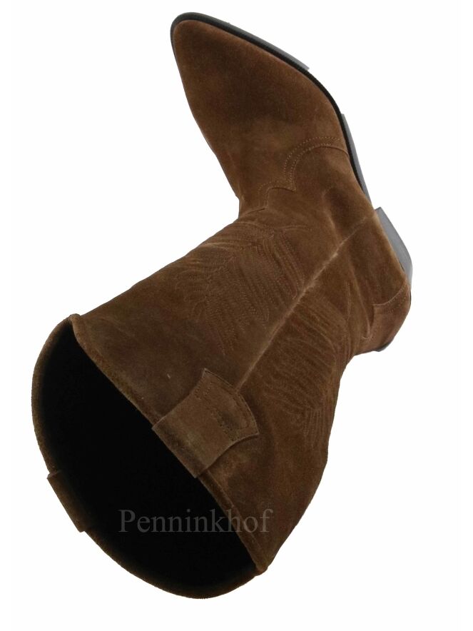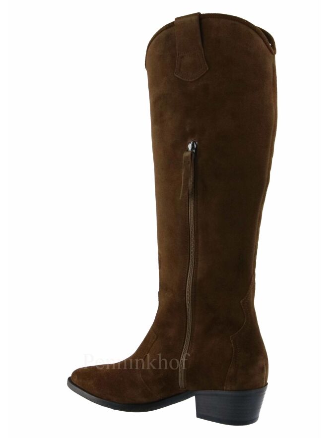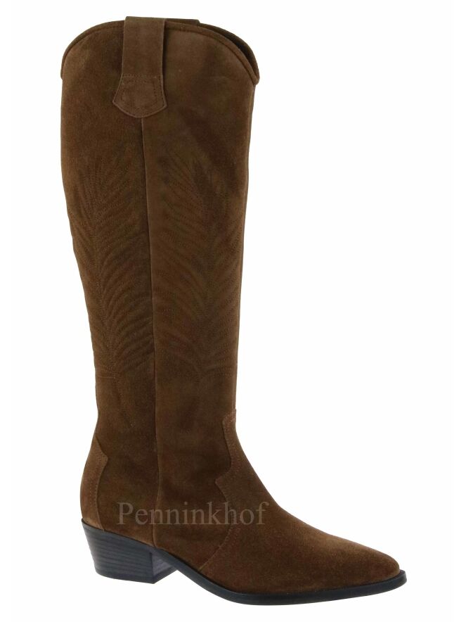 Ein hoher cognacfarbener Westernstiefel von Kennel & Schmenger. Auf der Außenseite des Schafts ist mit einem aufgestickten Blattmuster versehen. Der Stiefel läuft spitz zu und hat ein Futter aus Leder.
