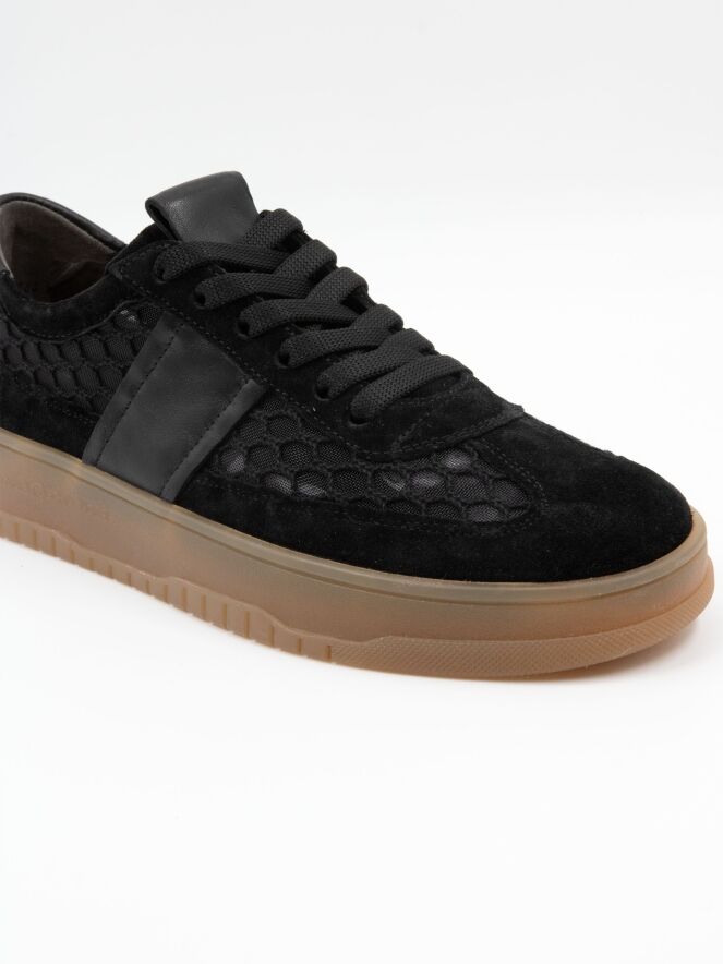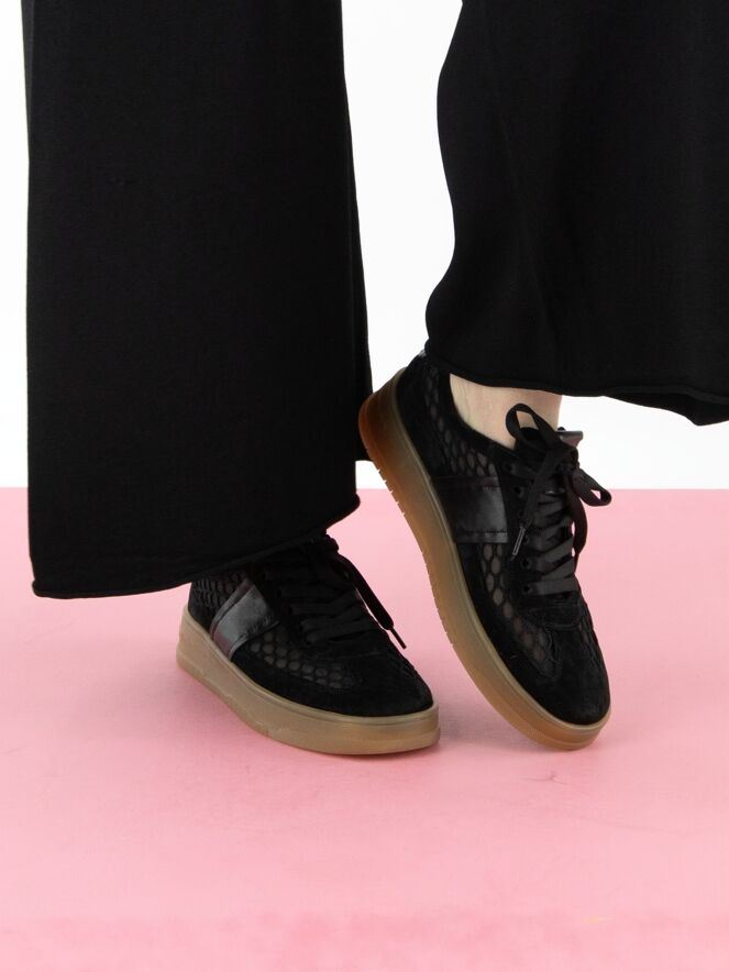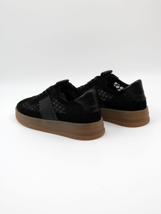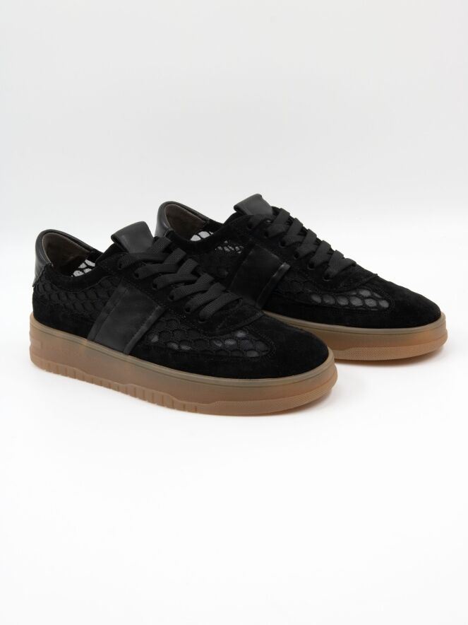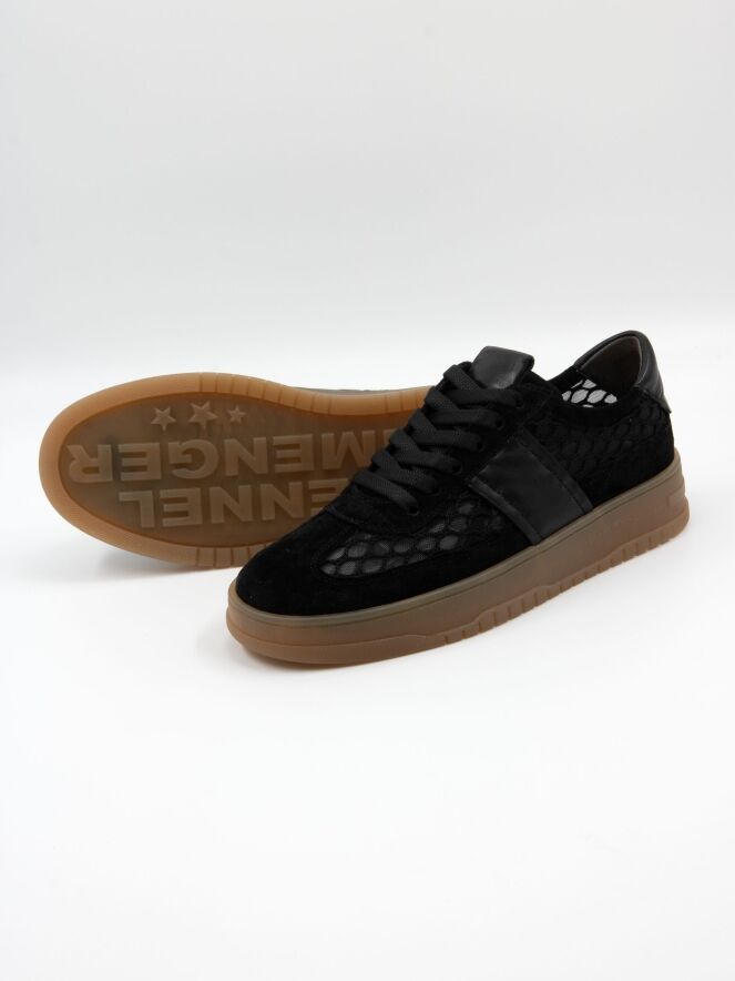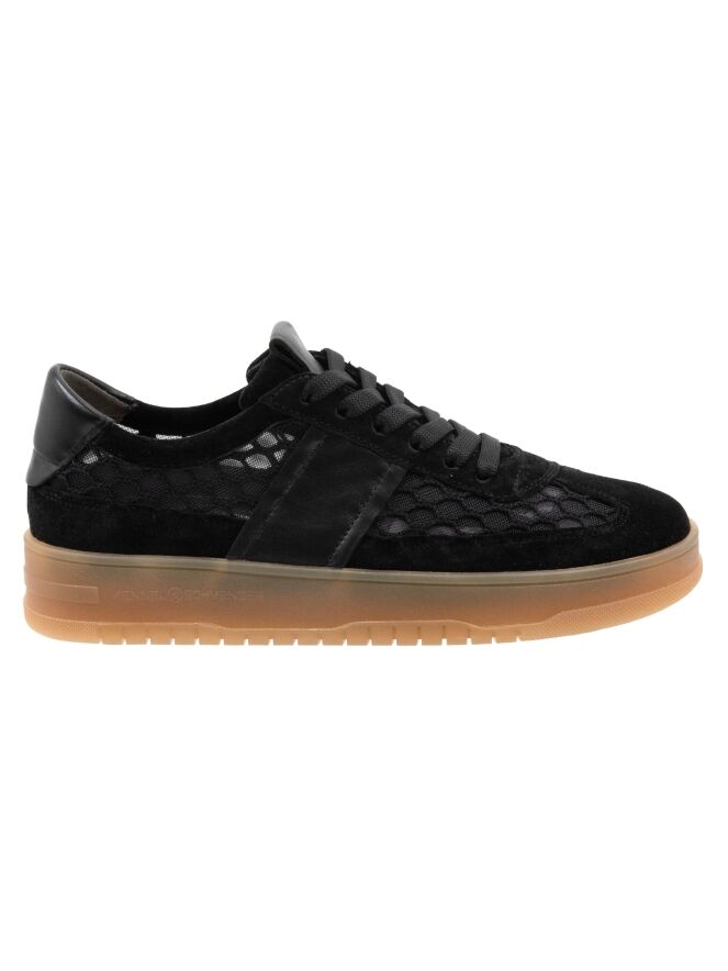 Ein niedriger Sneaker von Kennel und Schmenger in Schwarz. Der Sneaker besteht aus einem transparenten Stoff mit Rautenstruktur. Die Zehenkappe und der Rand oberhalb der Sohle sind aus Nubukleder gefertigt. An der Ferse befindet sich ein Ledereinsatz. Die Sohle hat eine honigfarbene Optik.