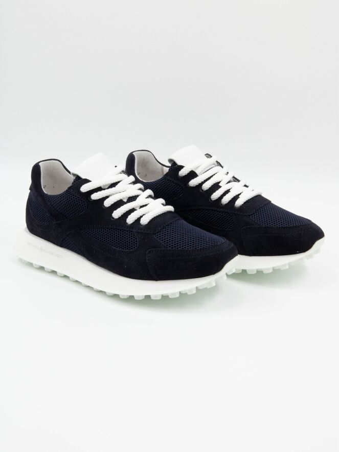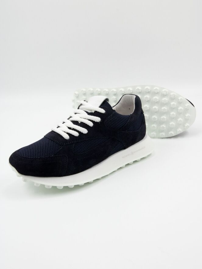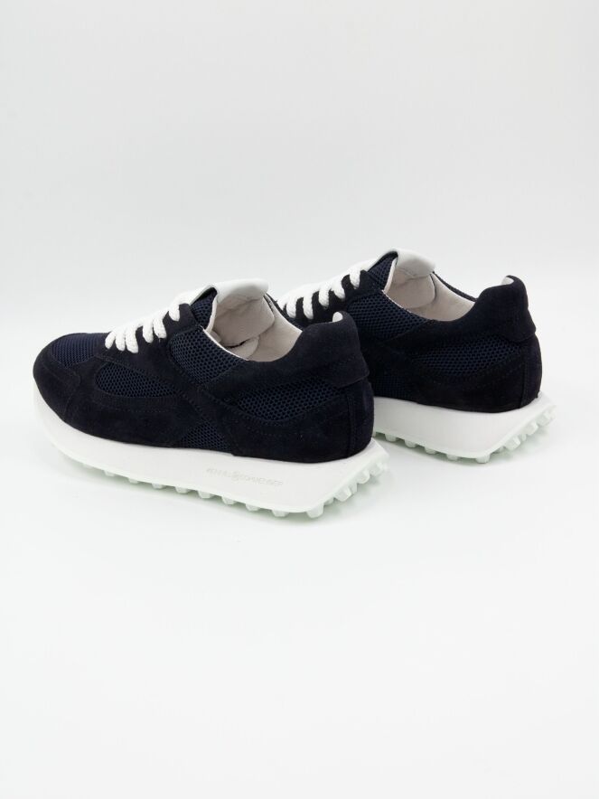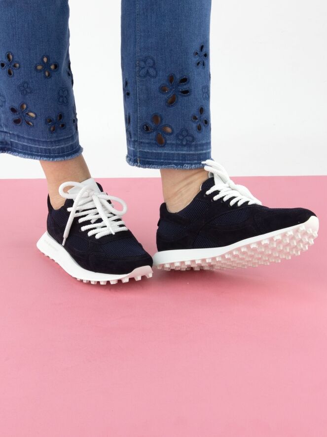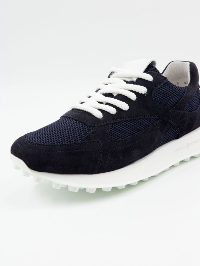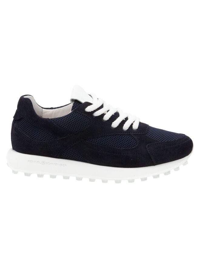 Ein luxuriöser Sneaker von Kennel und Schmenger in Marineblau. Der Sneaker kombiniert Camoscio-Wildleder mit einem elastischen Stoff in Netzstruktur. Er hat eine weiße Sohle und weiße Schnürsenkel.