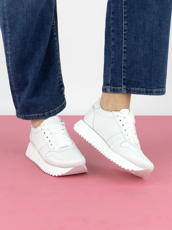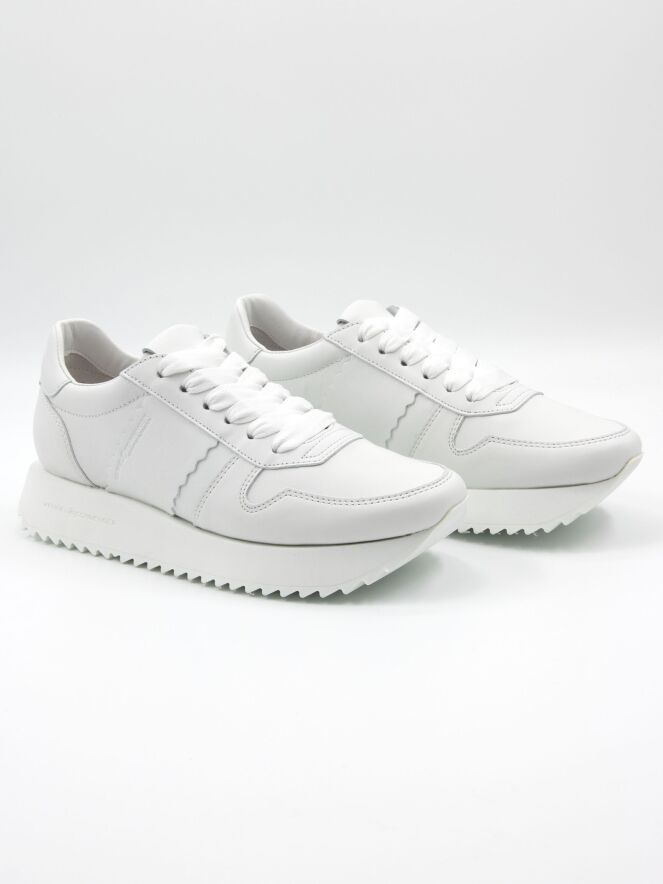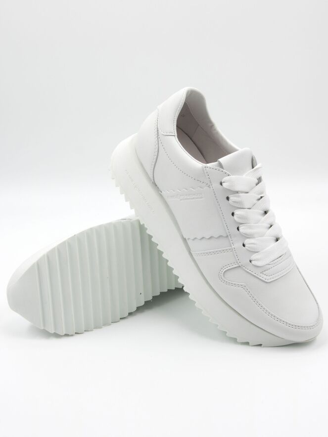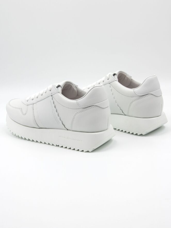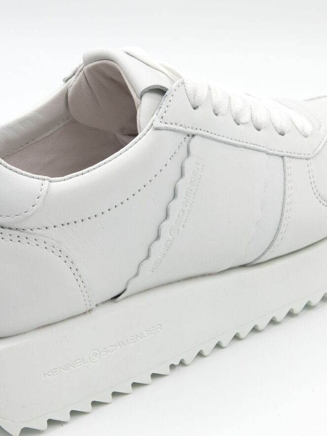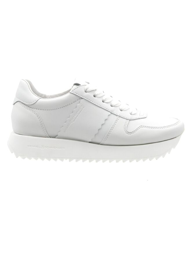 Ein Sneaker von Kennel und Schmenger in Weiß. Die sportliche Sohle ist an der Unterseite fein gezackt. Das Innere ist mit Leder gefüttert.