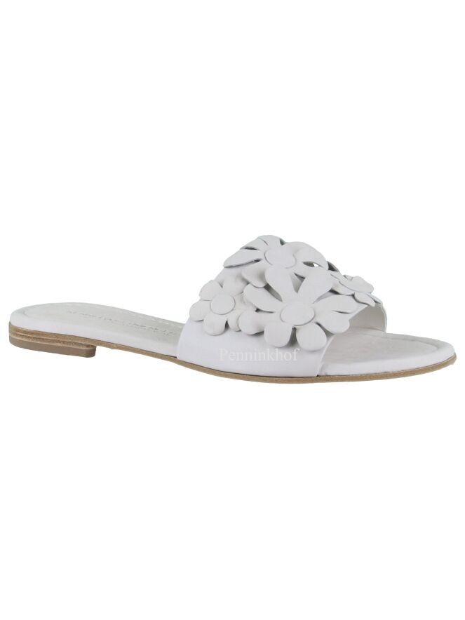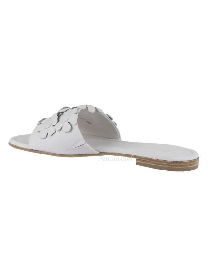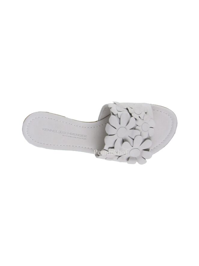 Ein Flip Flop von Kennel & Schmenger in Hellgrau. Auf dem breiten Band über dem Vorfuß befinden sich dekorative Blüten. Der Flip Flop ist vorne abgerundet.