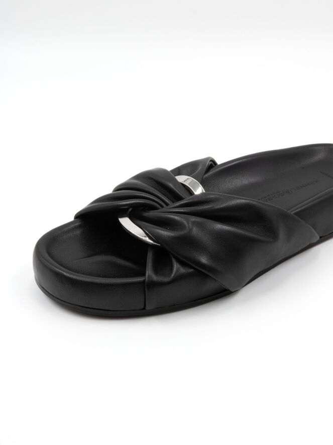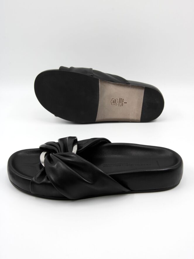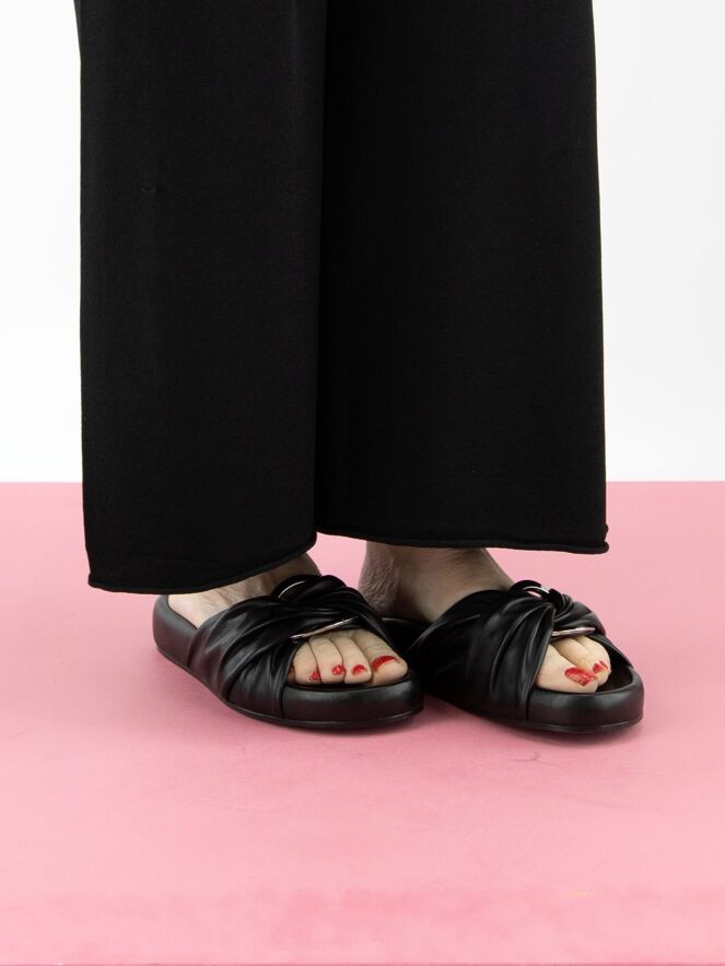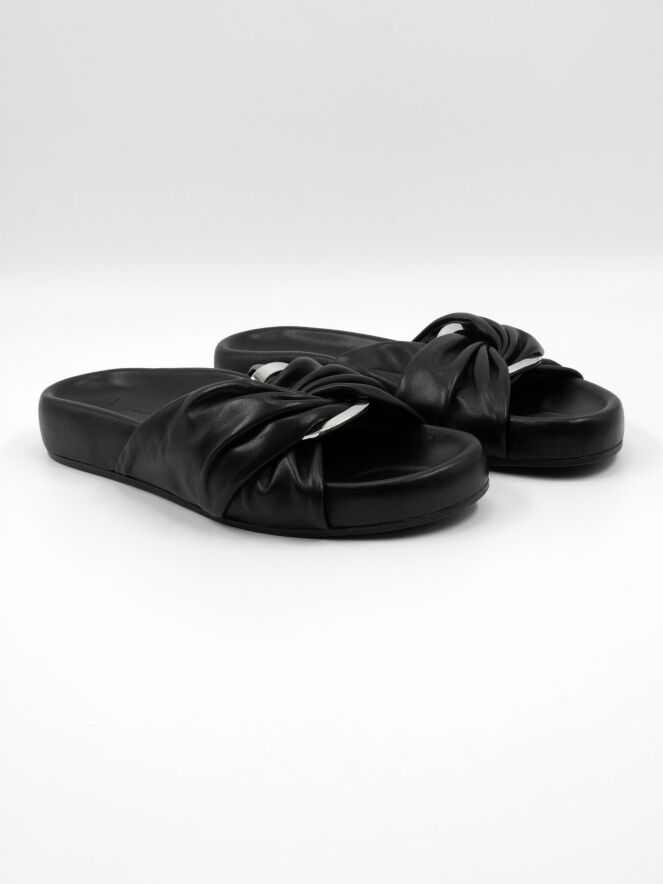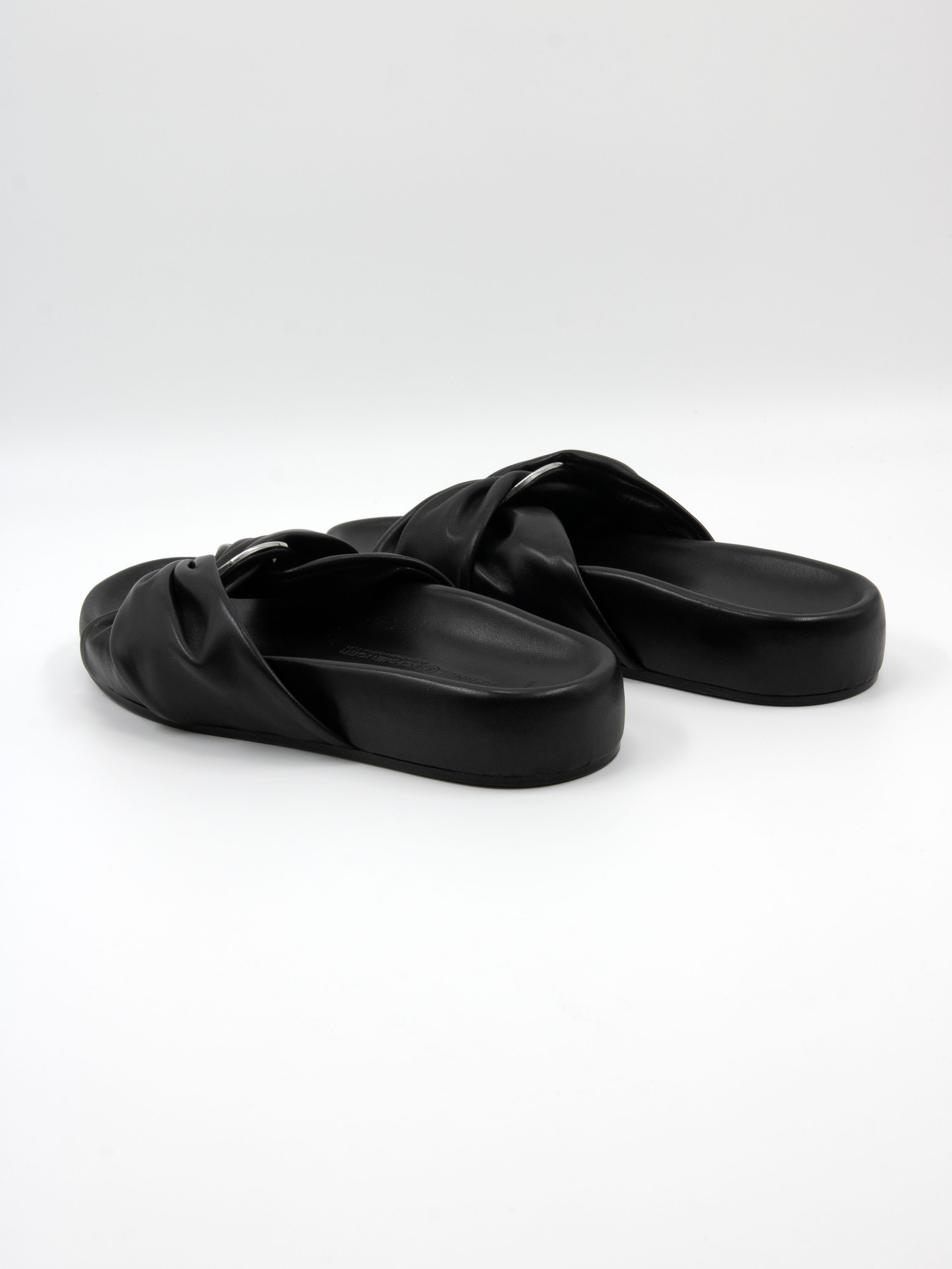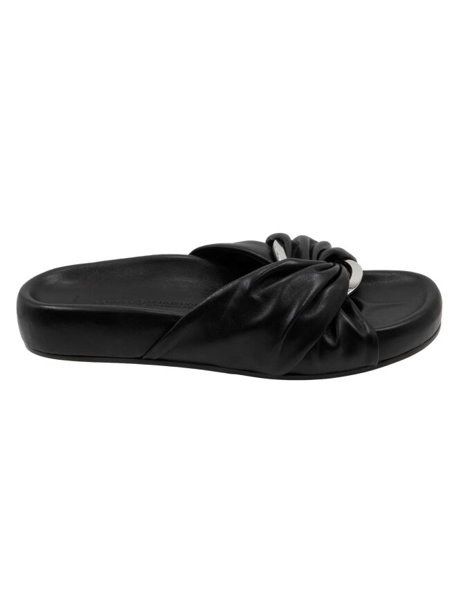 Eine luxuriöse Pantolette von Kennel und Schmenger in Schwarz. In der Mitte des Lederbands über dem Vorfuß befindet sich eine ovale, silberfarbene Schnalle. Das weiche Fußbett ist in derselben Farbe wie das Leder gehalten.