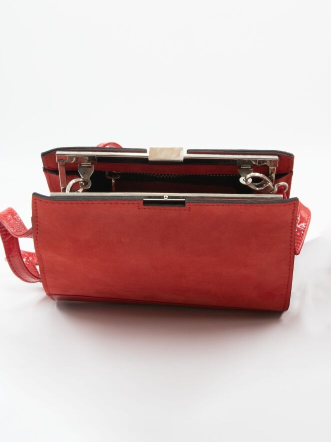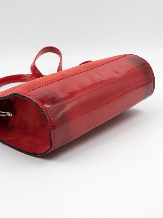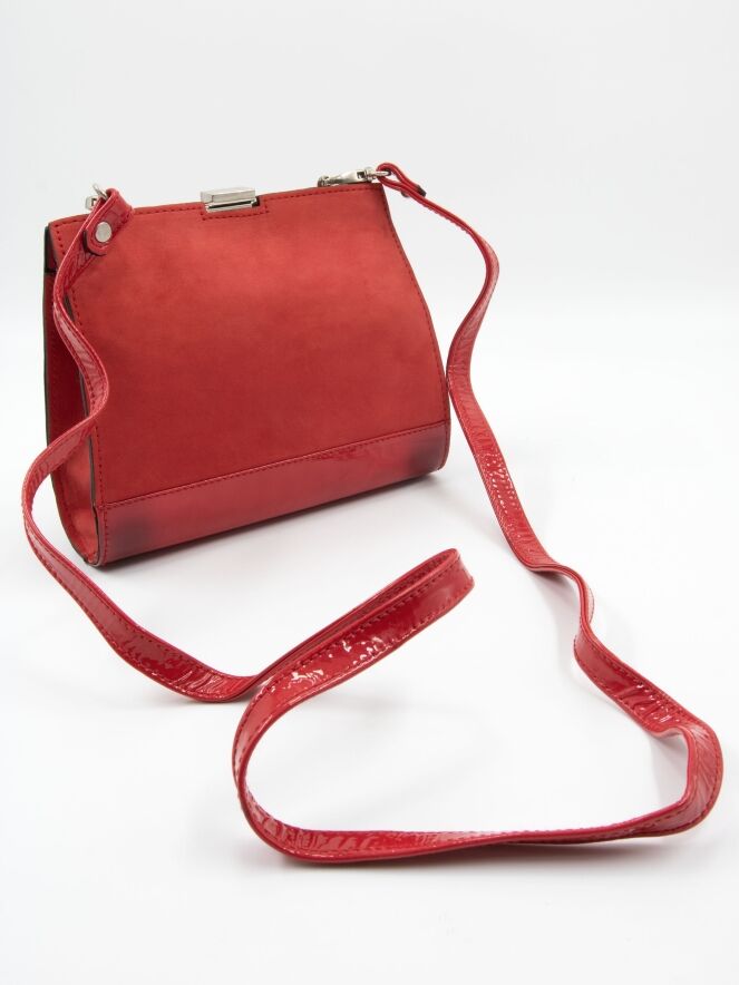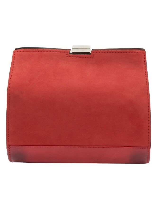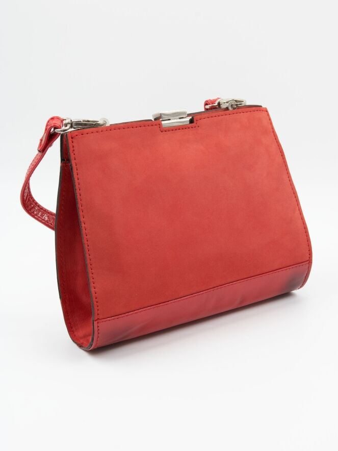 MODEL: 583\r\nKLEUR: ROOD\r\nMATERIAAL: NUBUCK MET LAKLEDER\r\nAFMETING: L 20CM X B 6CM X H 16CM
