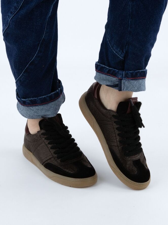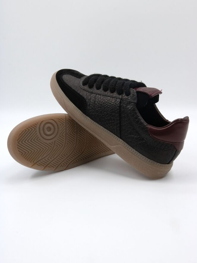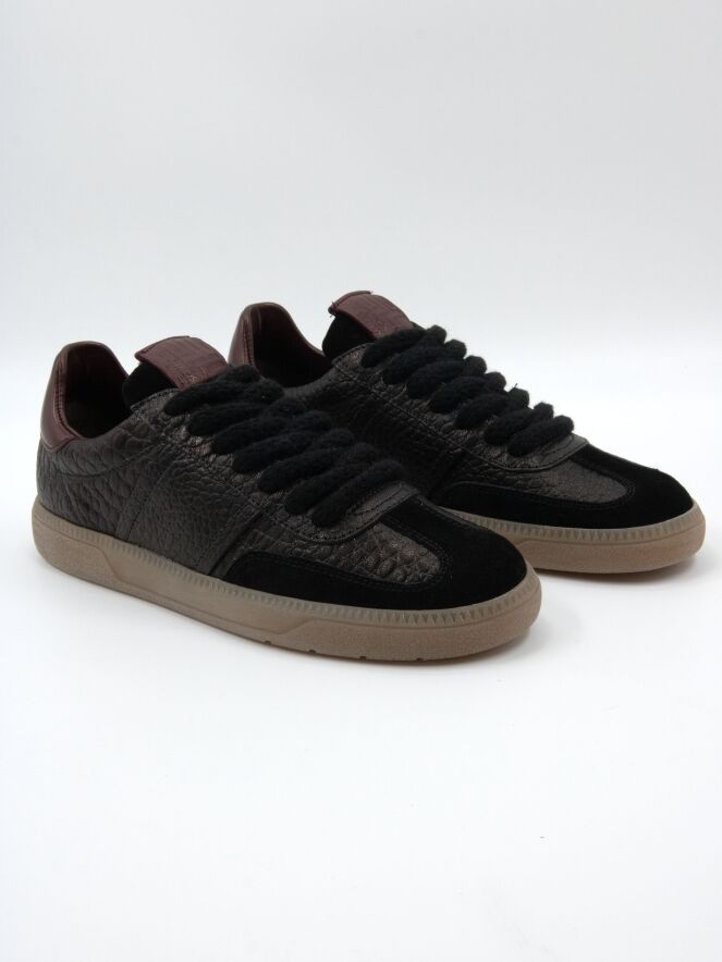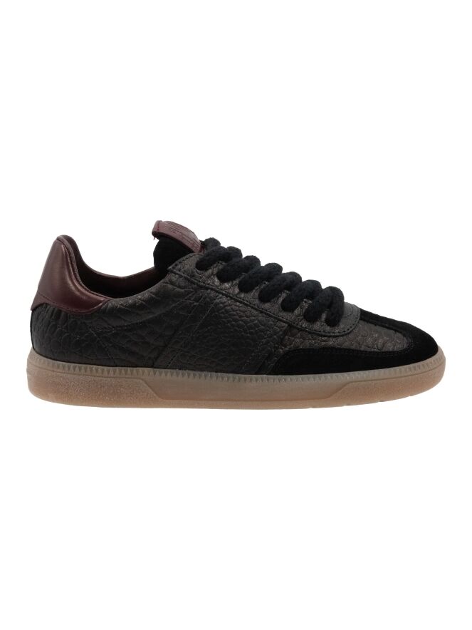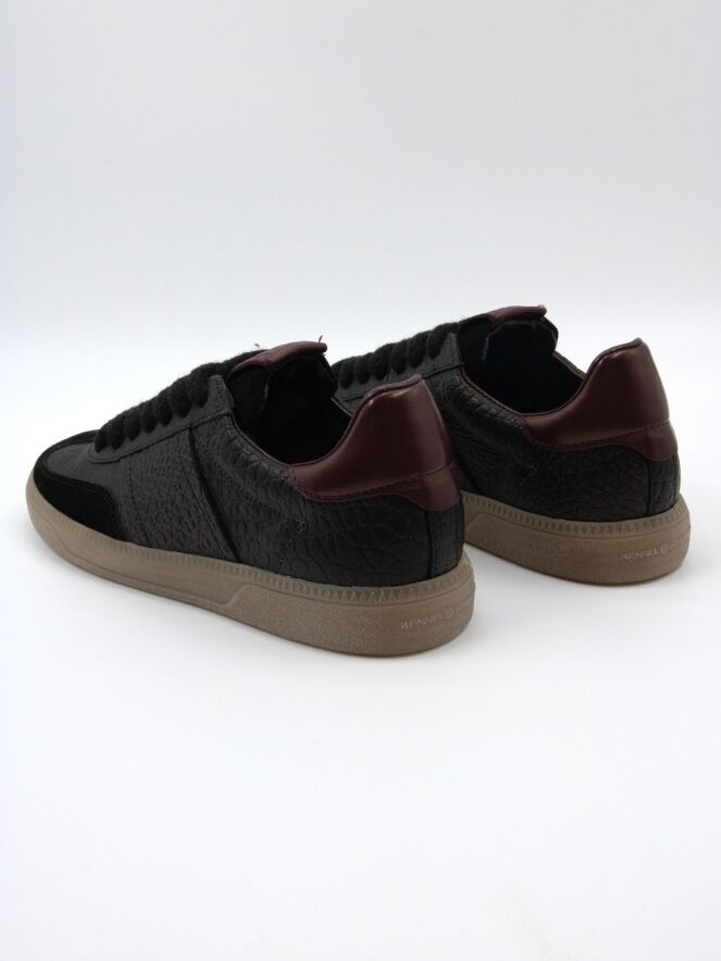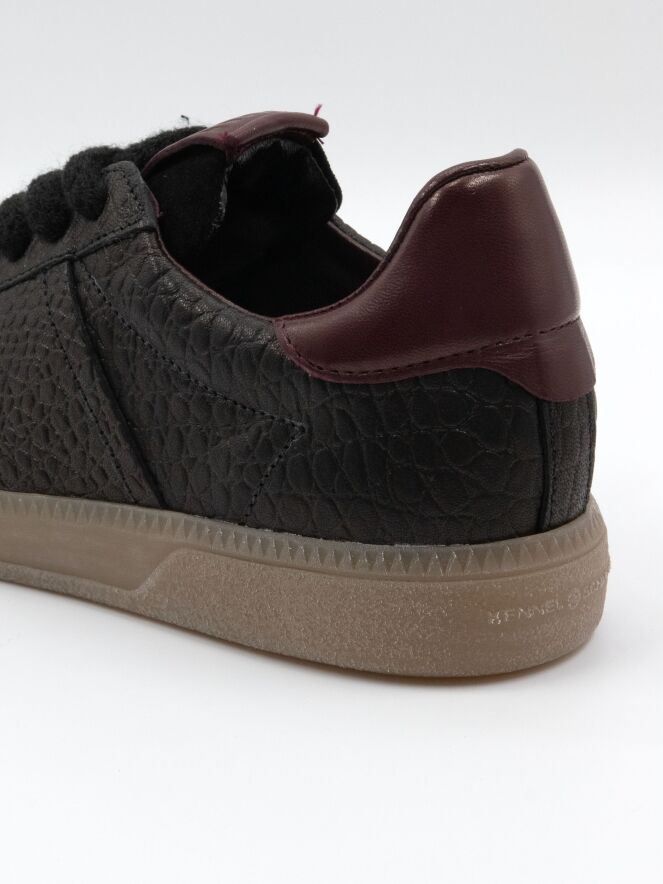 Niedriger Sneaker von Kennel & Schmenger in Schwarz. Die Schuhspitze besteht aus Camoscio-Veloursleder, die Seiten aus Leder mit Reptilstruktur. Fersen- und Zungenpartie sind in bordeauxrotem Leder gearbeitet. Das Innenfutter besteht aus Leder.