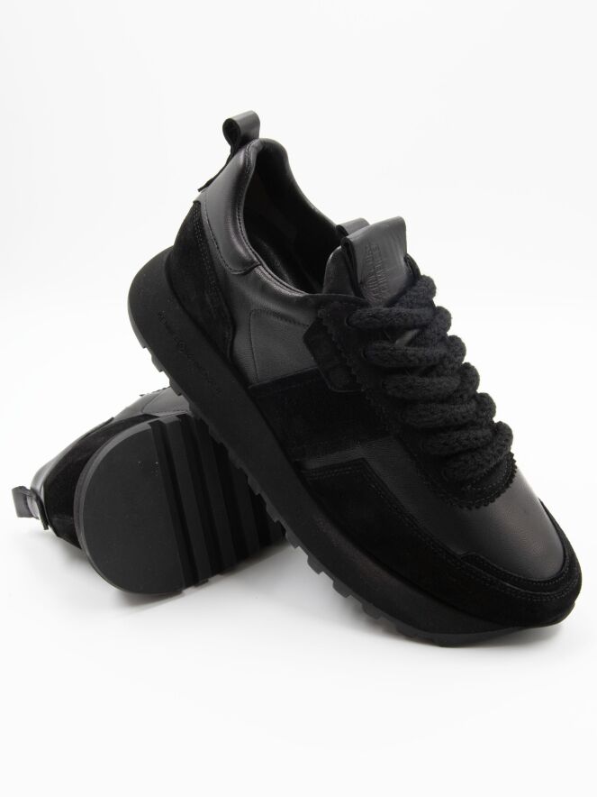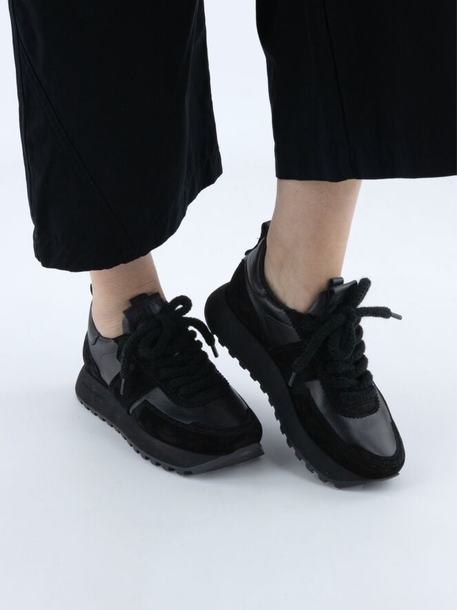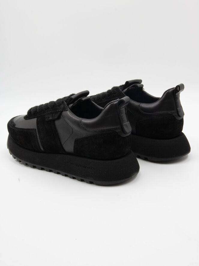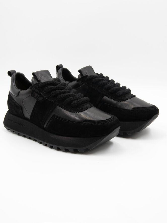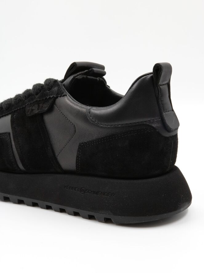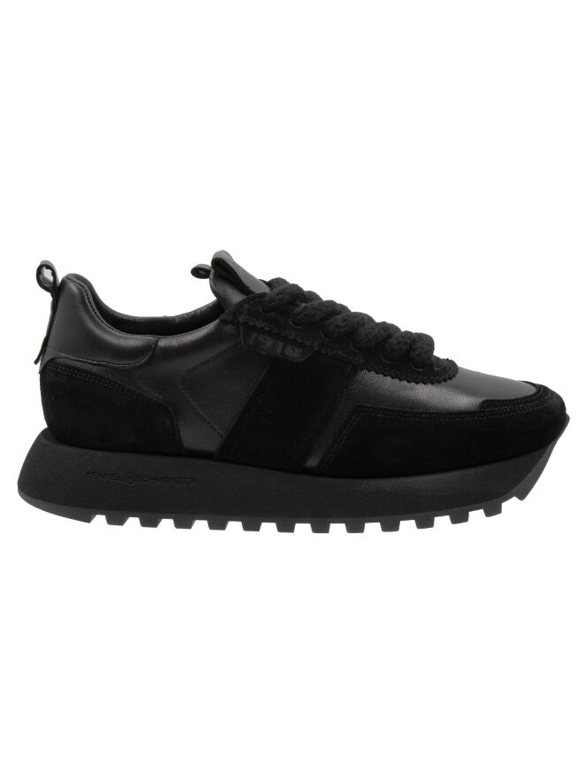 Ein Sneaker von Kennel & Schmenger in Schwarz. Entlang des Zehenrands zu den Seiten, an der Ferse und entlang der Schnürung befindet sich sportliches schwarzes Veloursleder. Die Sohle ist an der Ferse leicht erhöht, und das Innere ist mit Leder gefüttert.