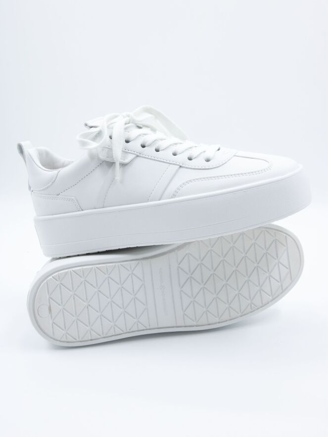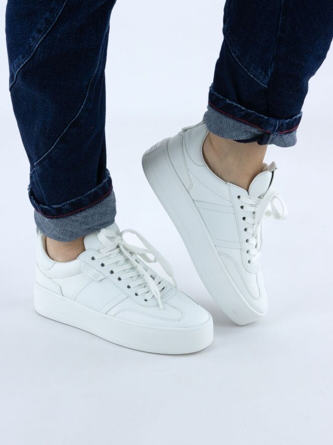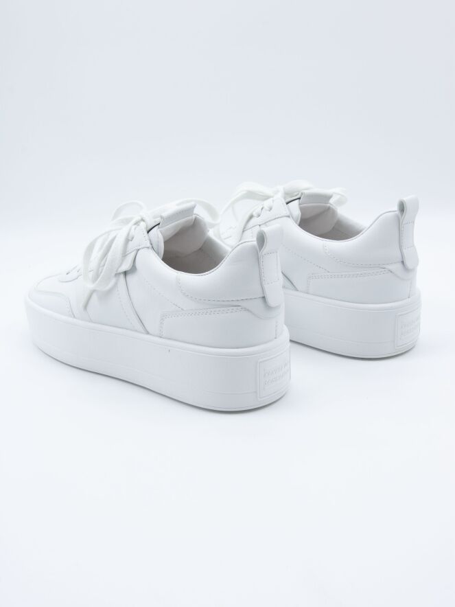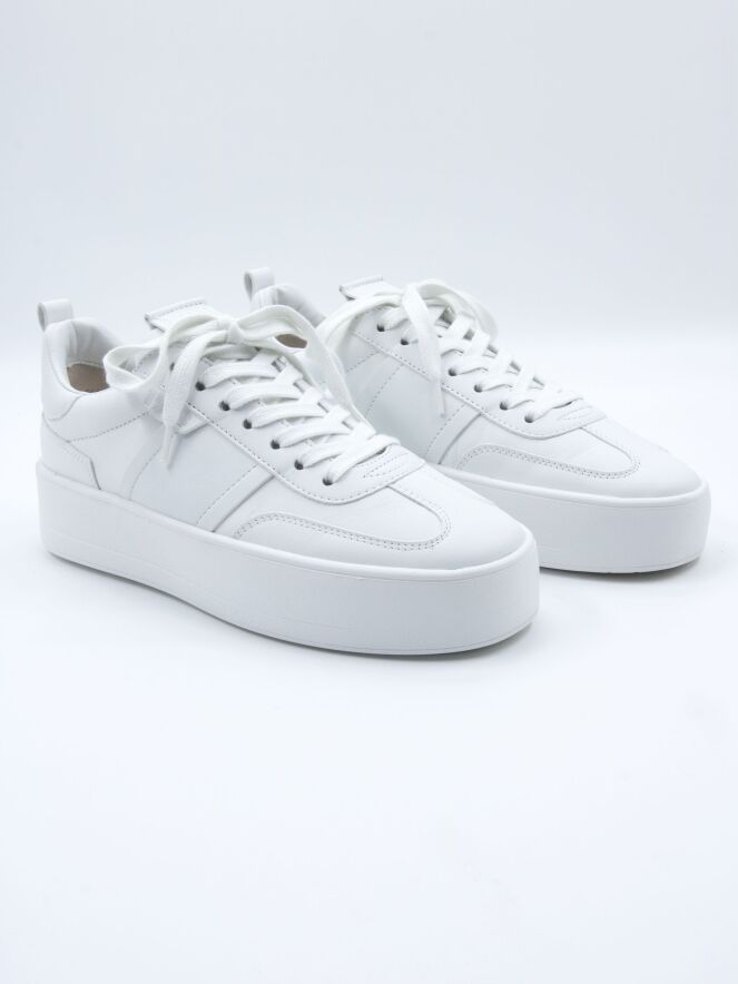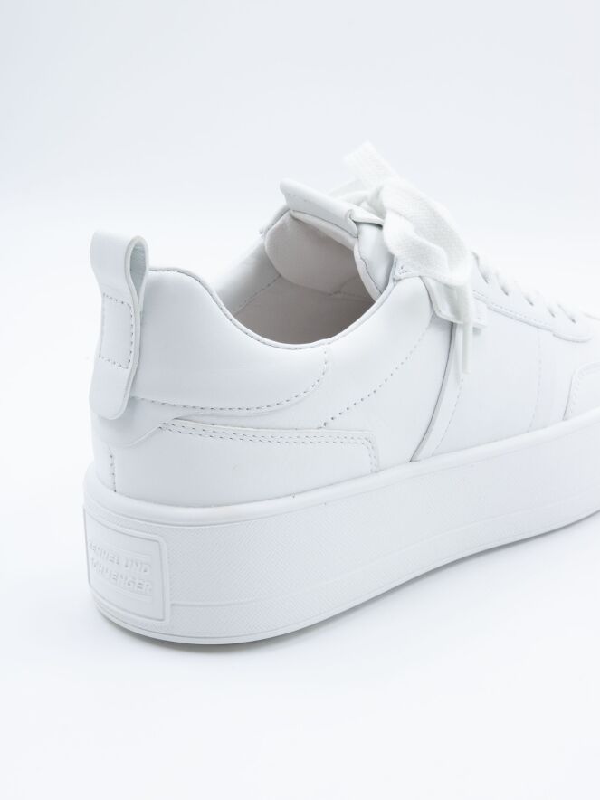 Ein Sneaker von Kennel & Schmenger in Weiß. Die Plateausohle und die Schnürsenkel sind ebenfalls weiß. Das Innenfutter besteht aus Leder.