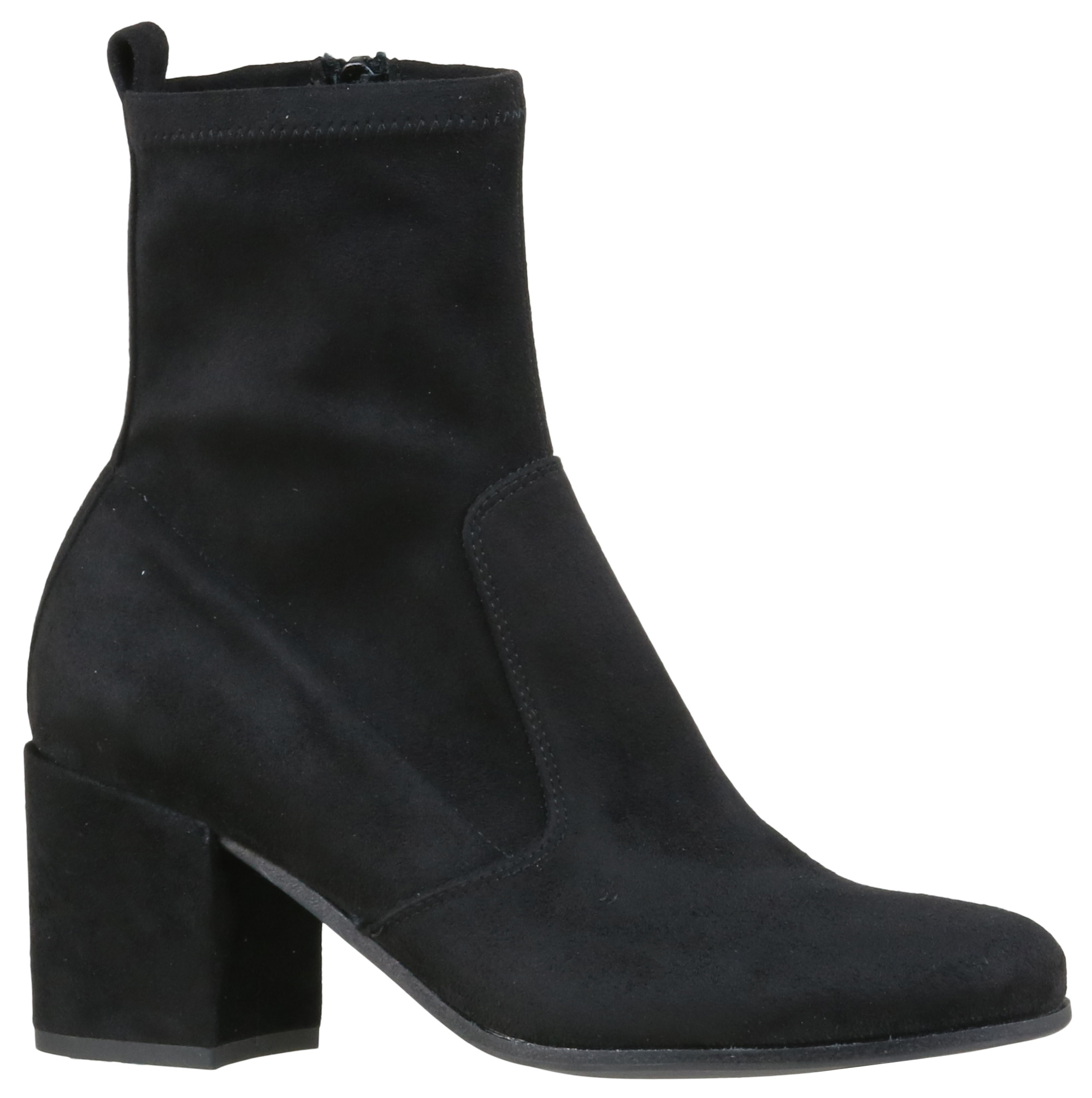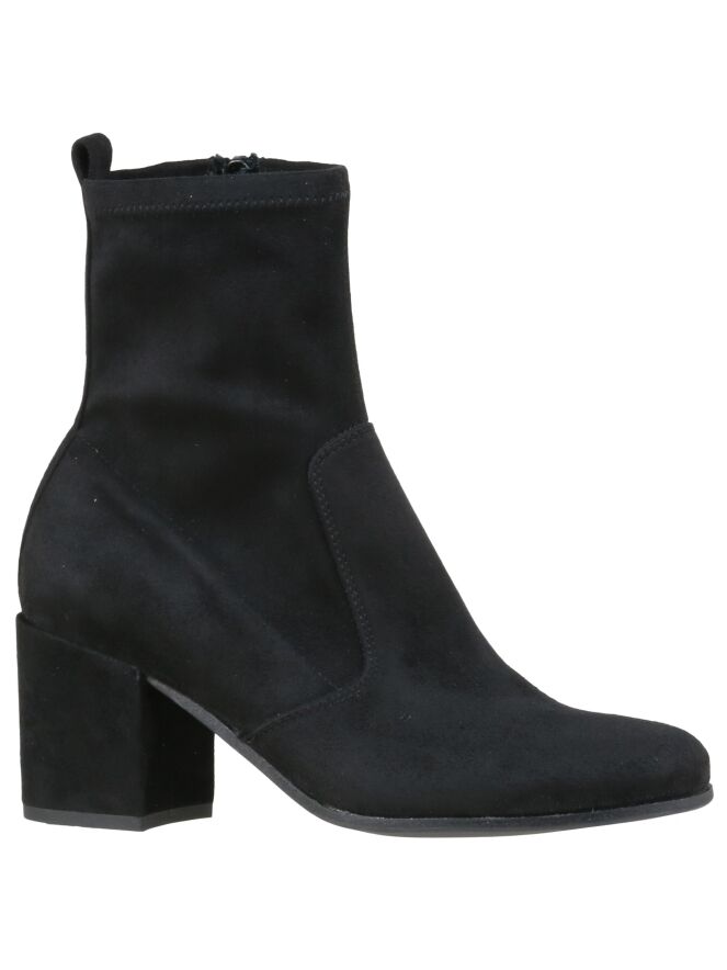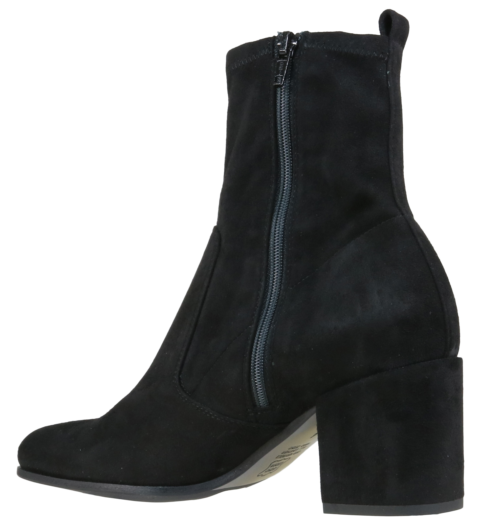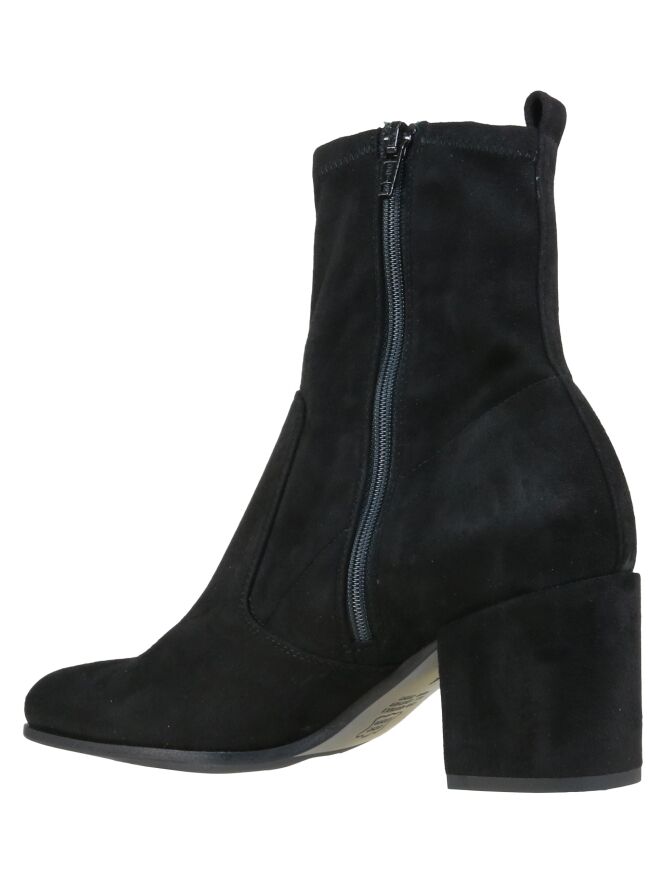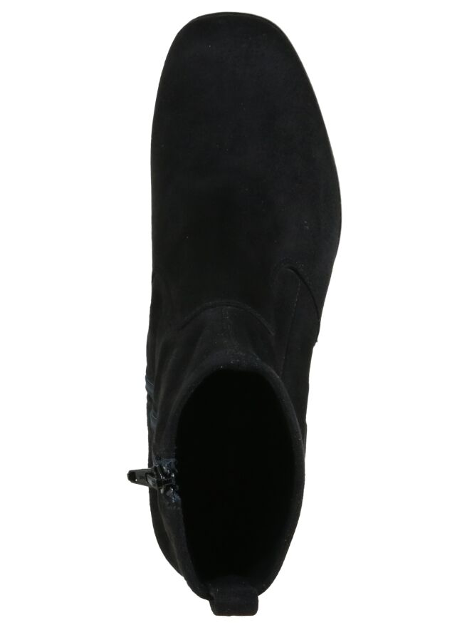 Schwarze Stiefelette der Schuhmarke Kennel und Schmenger K&S. Die Schuhspitze der Stiefelette ist abgerundet. Der Absatz ist mit demselben Wildleder wie die Stiefelette versehen. Die Stiefelette hat ein Innenfutter aus Satin.