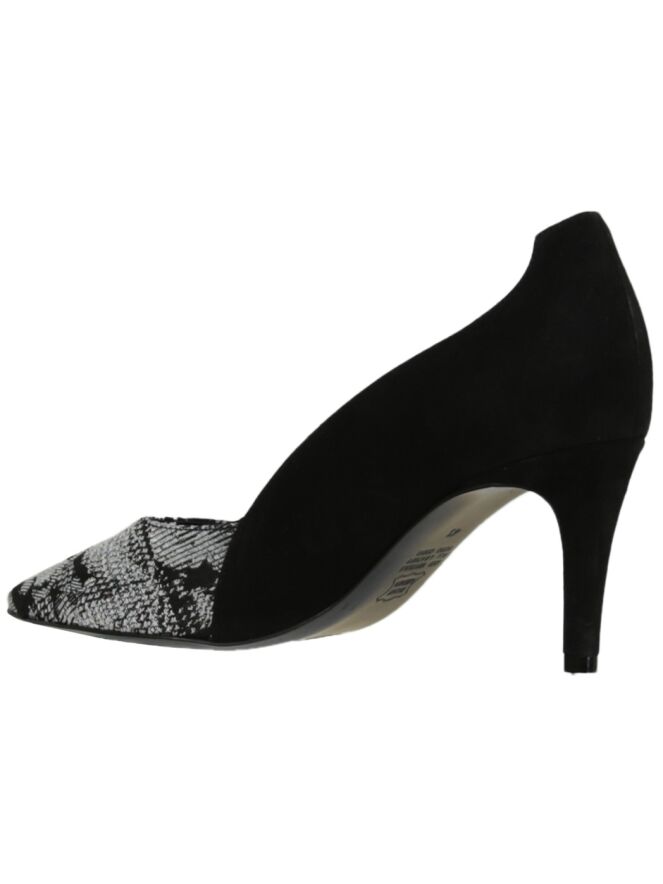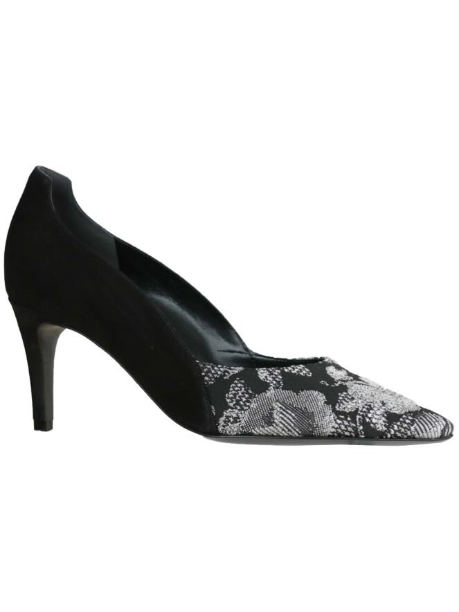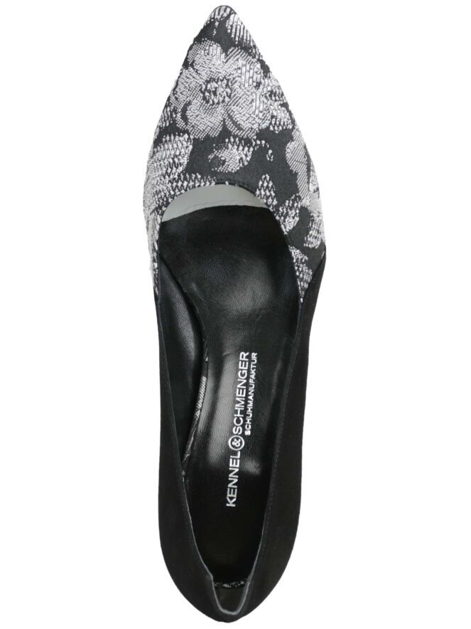 Schwarzer Pumps der Schuhmarke Kennel und Schmenger K&S. Der Vorderfuß des Pumps ist in einem matten Satinstoff mit einem Spitzen-Print. Der Pumps hat ein Innenfutter aus Leder und eine leicht spitz zulaufende Schuhspitze. Der schmale Absatz ist aus demselben Material wie der Schuh.