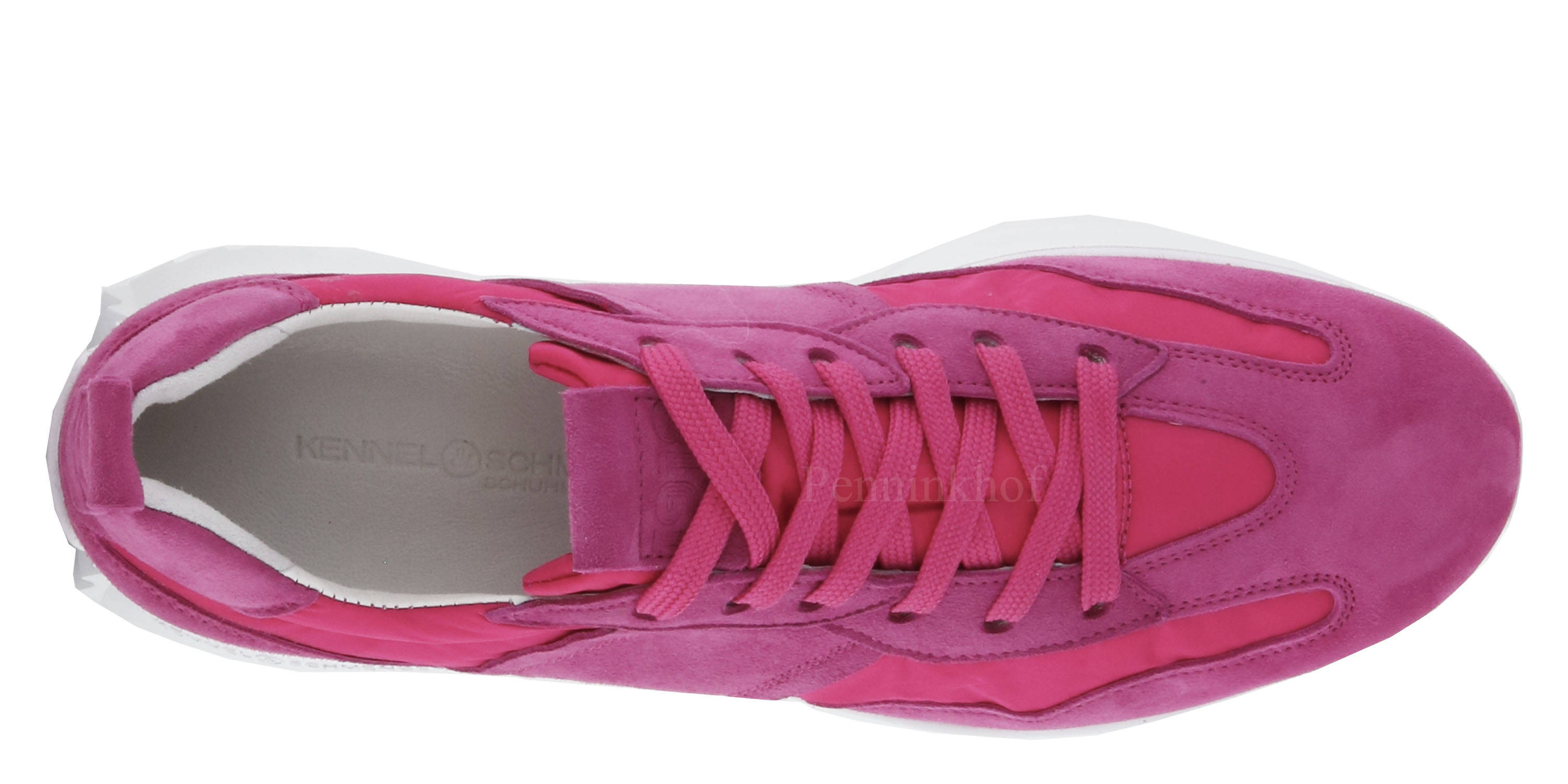 Ein Sneaker der Schuhmarke Kennel & Schmenger in Fuchsia. An den Seiten sind einige Teile aus einem fuchsiafarbigen Fallschirmstoff. Die gezackte Sohle ist weiß. Die Innenseite ist mit Leder gefüttert.