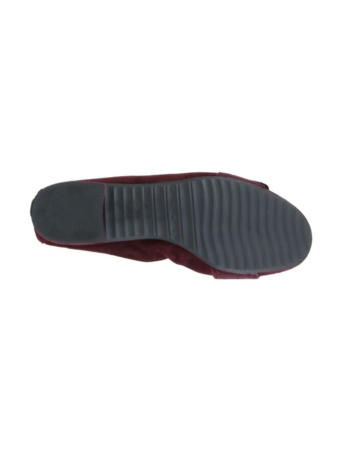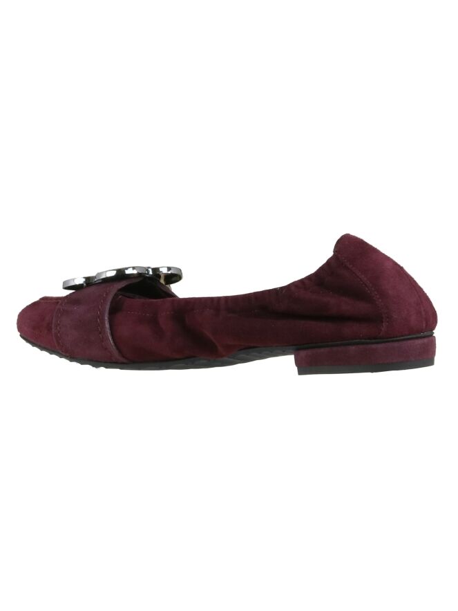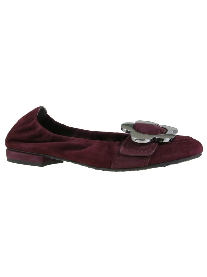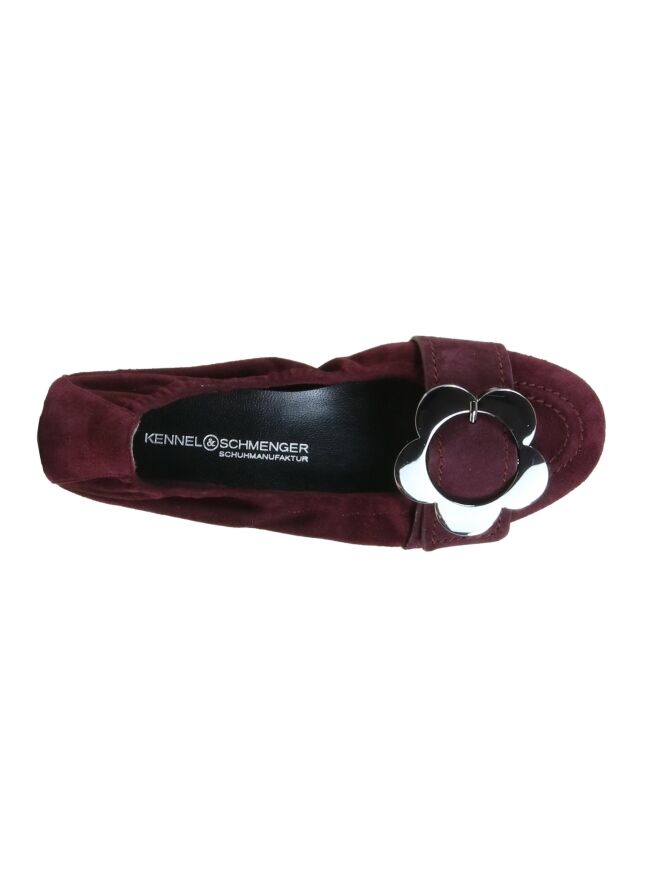 Bordeauxroter Ballerina der Marke Kennel und Schmenger K&S. Eine nickelfarbige Schnalle in Form einer großen Blüte verziert den Vorfuß. Die Seitenränder sind elastisch. Der Ballerina hat kein Innenfutter.