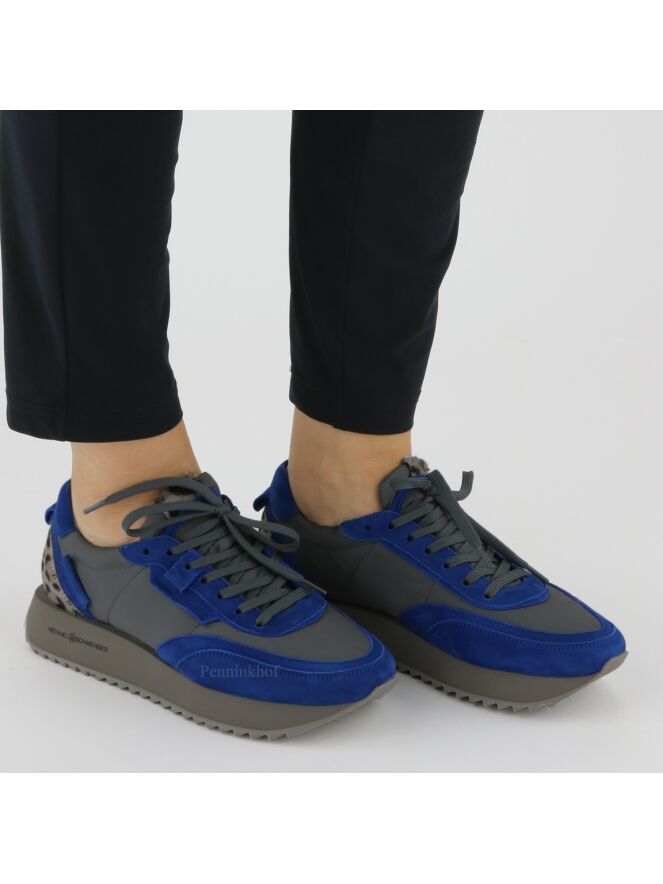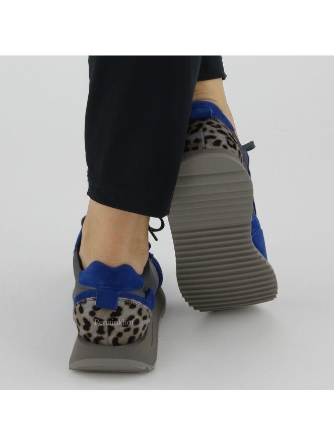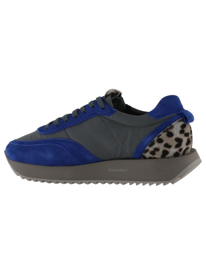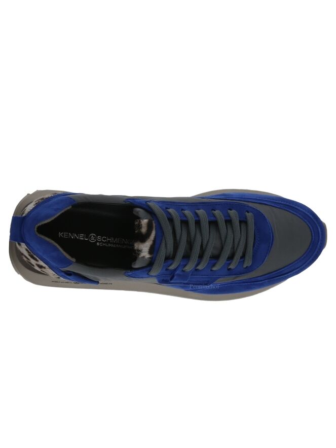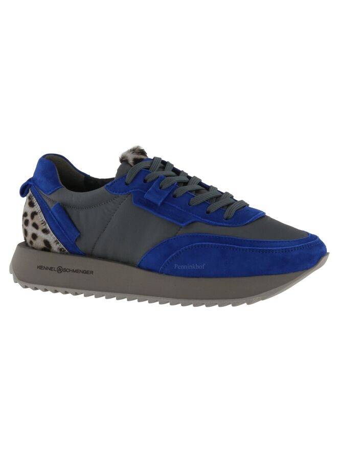 Ein grün-grauer Sneaker der Schuhmarke Kennel & Schmenger. Entlang der Schnürsenkel, der unteren Kante des vorderen Fußteils und der Spitze ist der Sneaker aus kobaltblauem Nubuk-Wildleder. Der Spann und die Seiten sind aus einem grauen Fallschirmgewebe. Die Ferse ist aus rasiertem Fell mit Leopardenmuster. Die Sohle ist leicht gezackt und 2-lagig aus den Farben Hell- und Dunkelgrau aufgebaut. Die Innenseite ist mit Leder gefüttert.