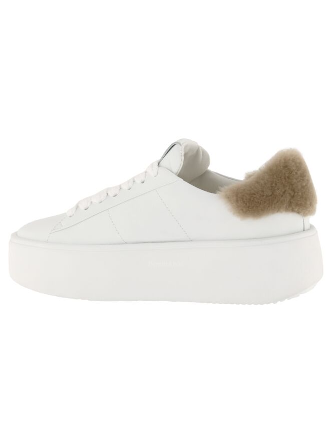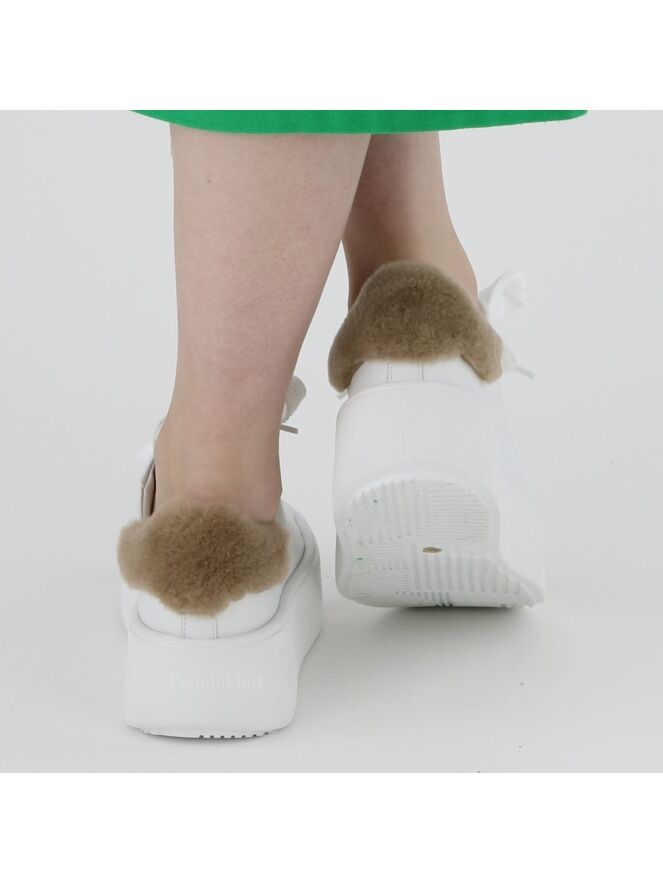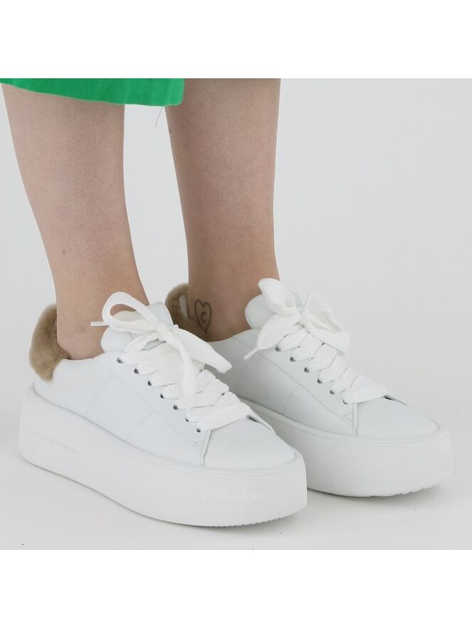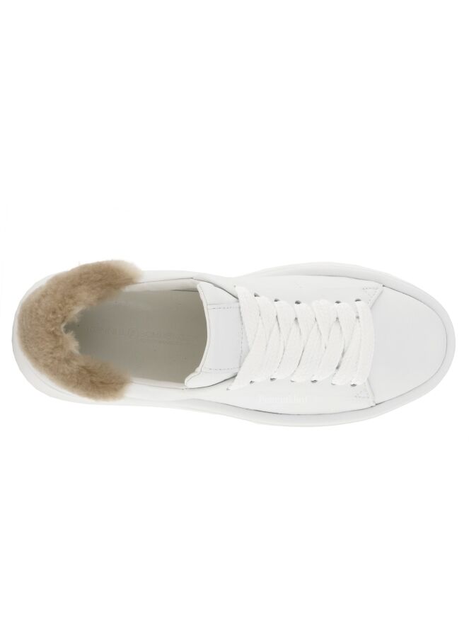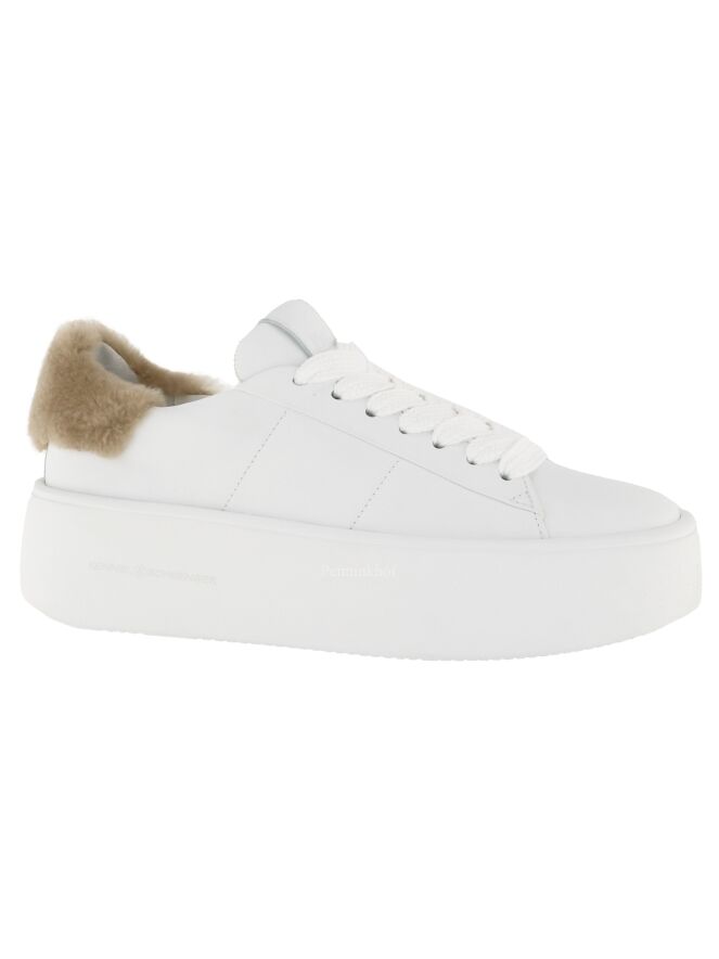 Ein weißer Sneaker der Schuhmarke Kennel und Schmenger K&S. An der Ferse befindet sich ein Einsatz aus Kunstfell in der Farbe Camel. Die Plateausohle ist weiß. Die Innenseite ist mit Leder gefüttert.