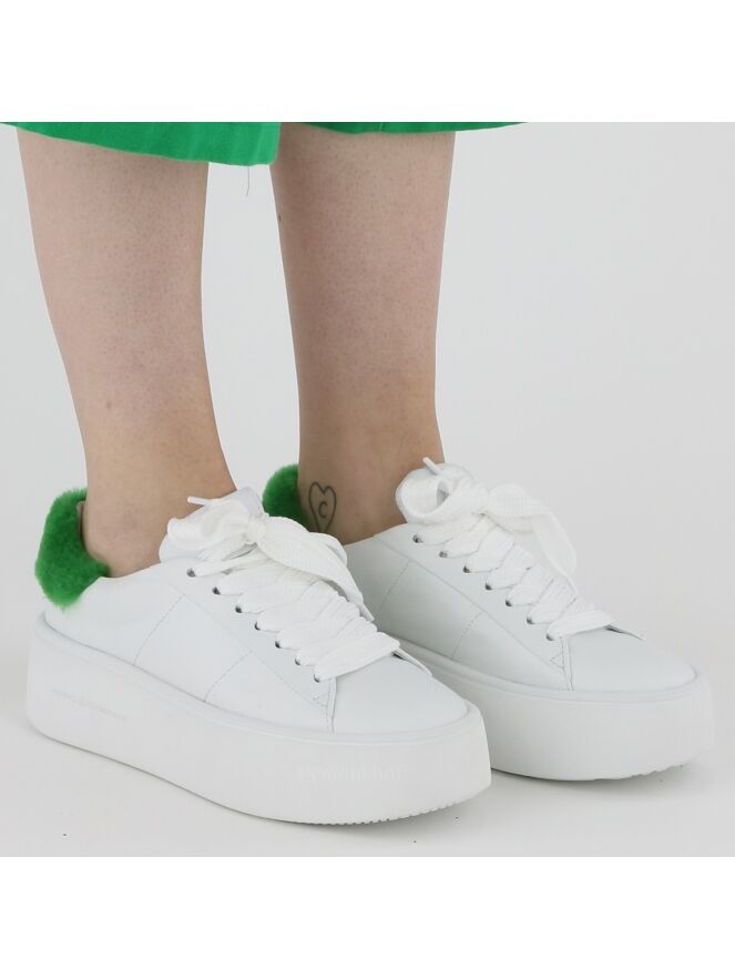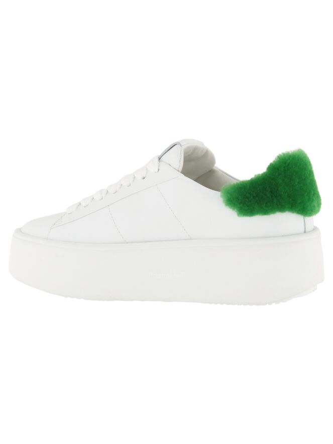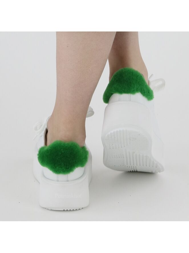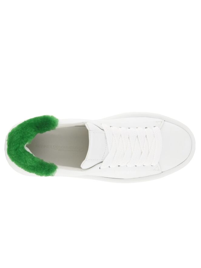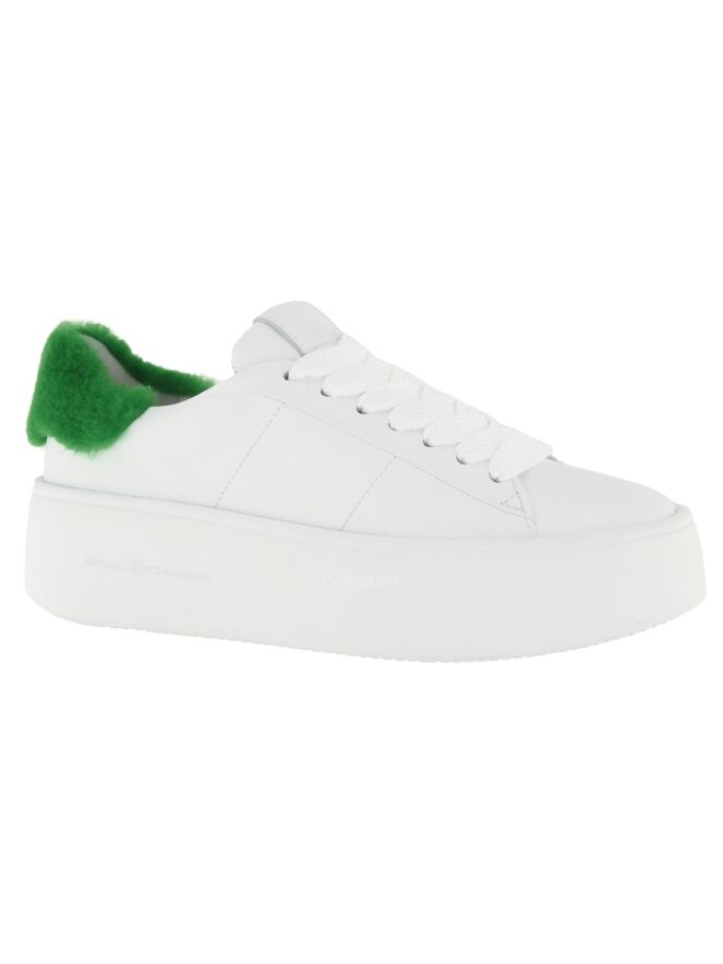 Ein weißer Sneaker der Schuhmarke Kennel und Schmenger K&S. An der Ferse befindet sich ein Einsatz aus grünem Kunstfell. Die Plateausohle ist weiß. Die Innenseite ist mit Leder gefüttert.