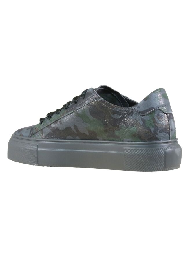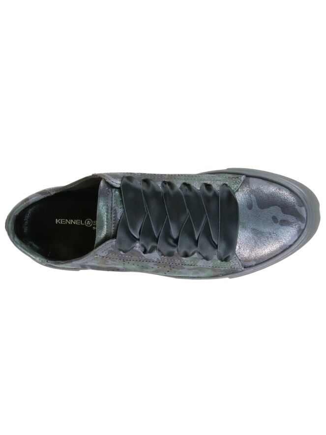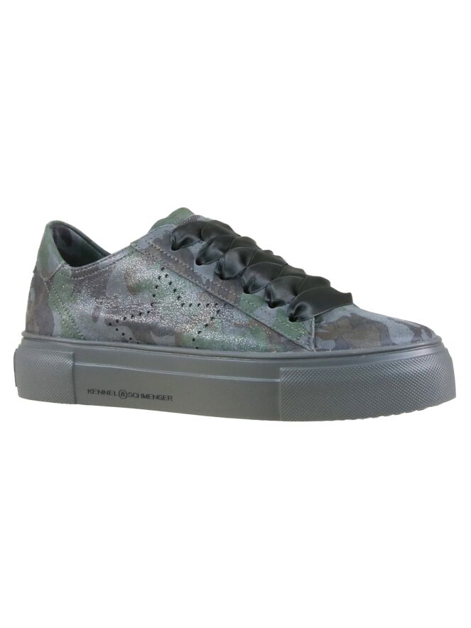 Luxuriöser Slipper der Schuhmarke Kennel und Schmenger K&S mit Camouflagedruck. Die Schnürsenkel sind aus Mattsatin. Der Halbschuh hat teilweise ein Innenfutter aus Leder und eine herausnehmbare Innensohle.