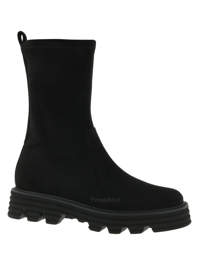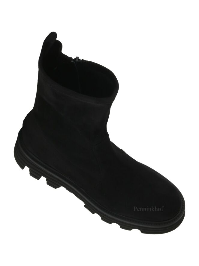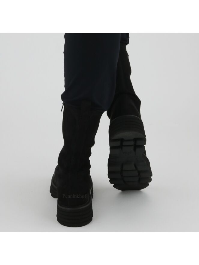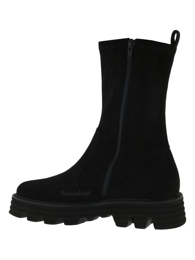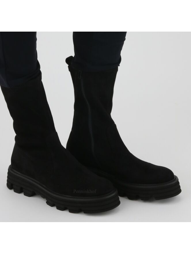 Ein halbhoher Stiefel der Schuhmarke Kennel & Schmenger in der Farbe Schwarz. Der Spann ist aus weichem Wildleder und der Schaft aus einem edlen Stretchgewebe. Der Stiefel hat eine sportliche Sohle.