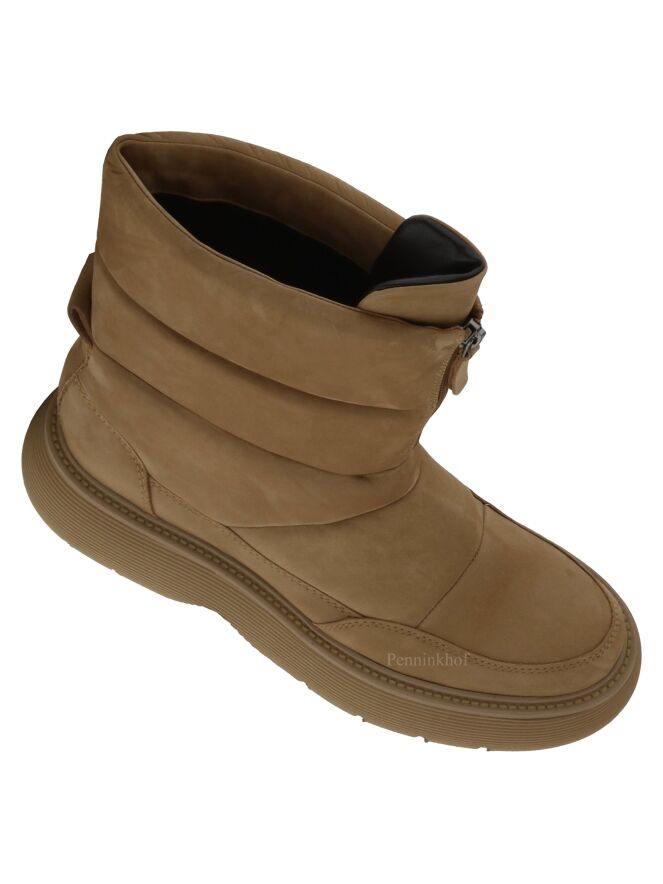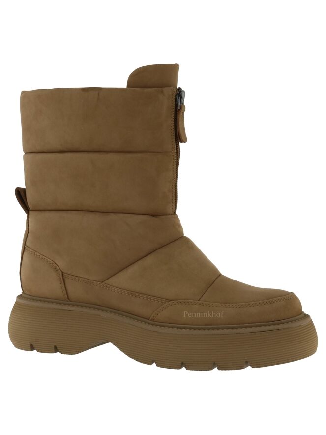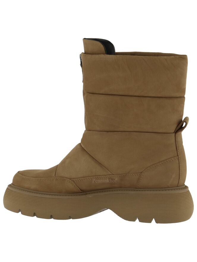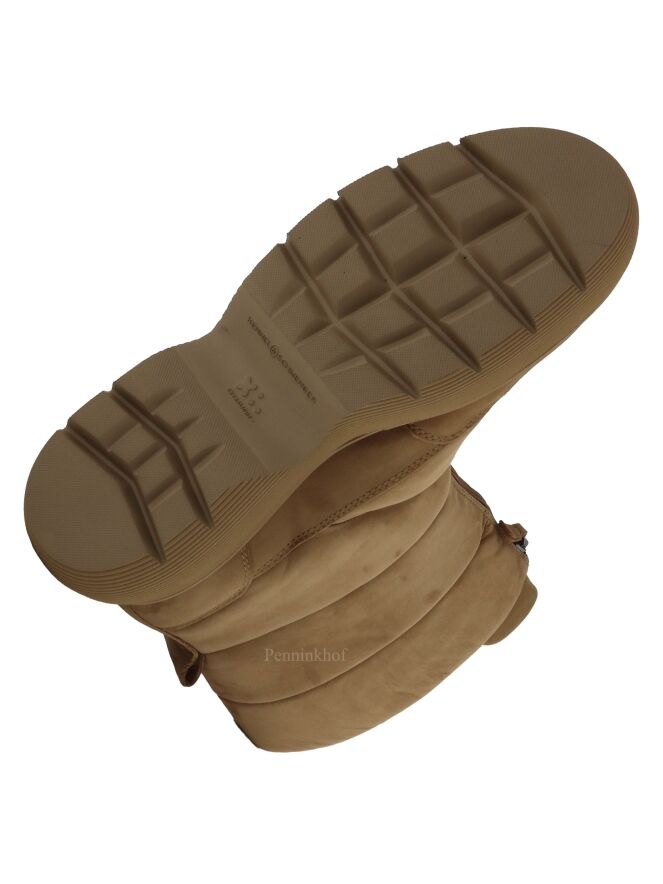 Ein kurzer Snowboot der Schuhmarke Kennel & Schmenger in der Farbe Camel. Die sportliche Sohle ist camelfarben. Vorne am Schaft befindet sich ein kurzer Reißverschluss. Der Snowboot hat vier horizontale Ziernähte. Die Innenseite ist mit Leder gefüttert.