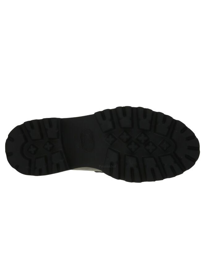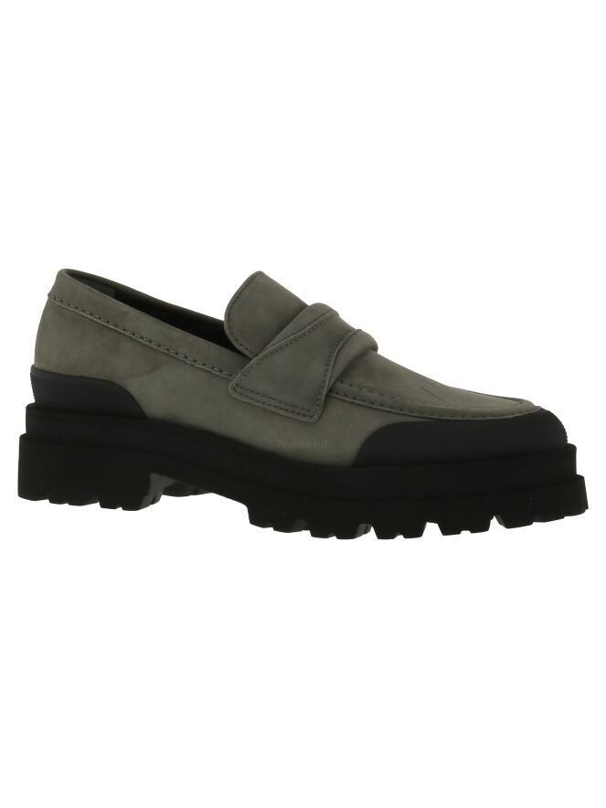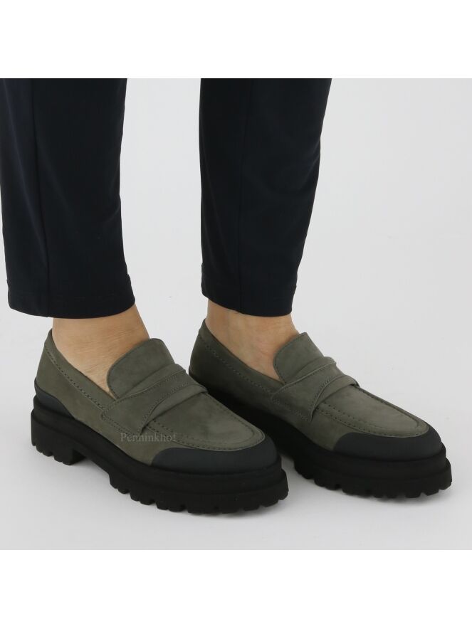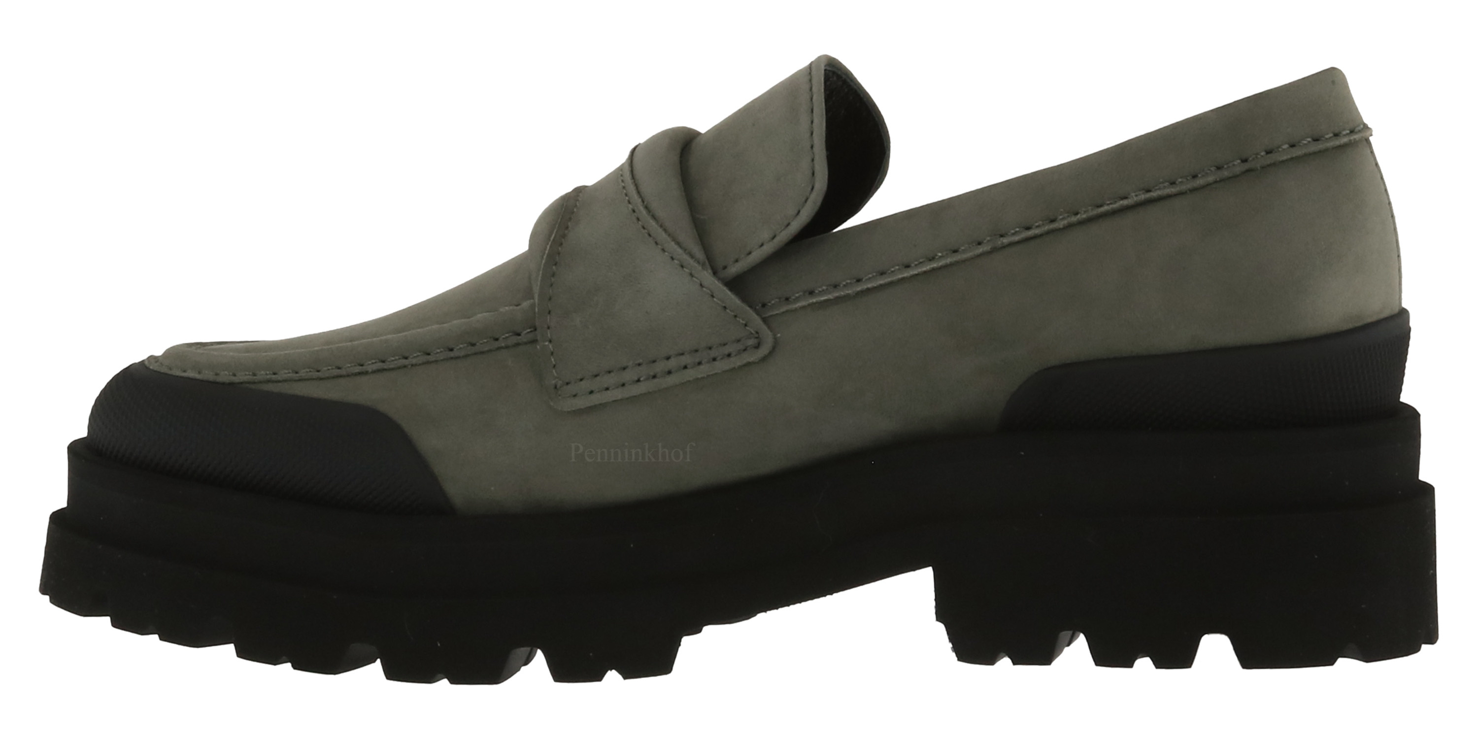 Ein grauer Slipper der Schuhmarke Kennel & Schmenger. Die Schuhspitze ist am Rand mit einem breiten gerippten schwarzen Streifen versehen. Die robuste Sohle ist gezackt. Die Innenseite ist mit Leder gefüttert.
