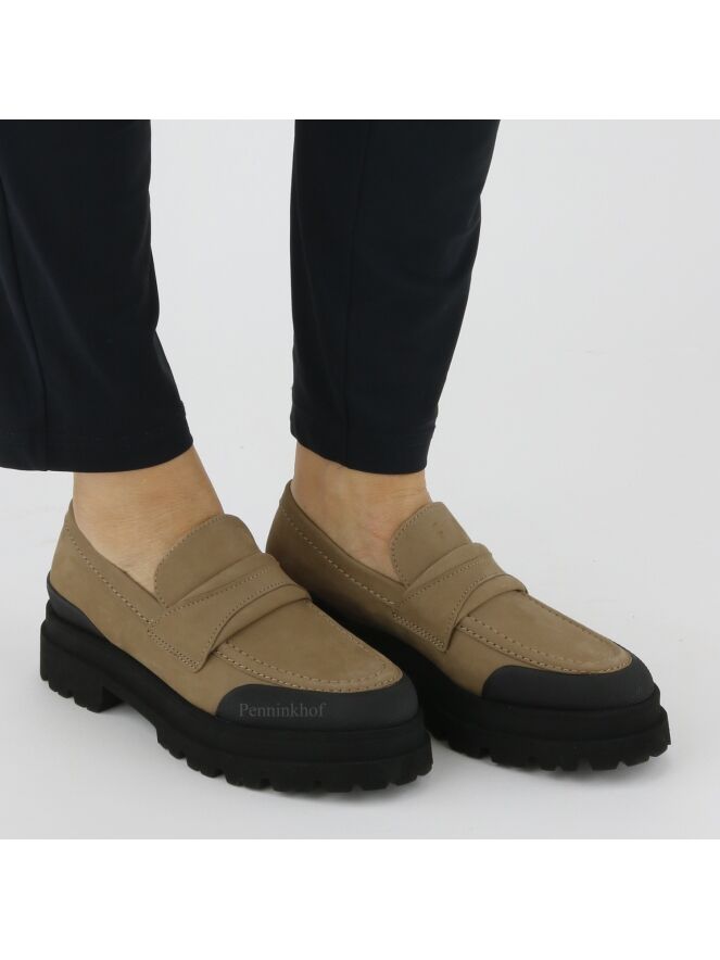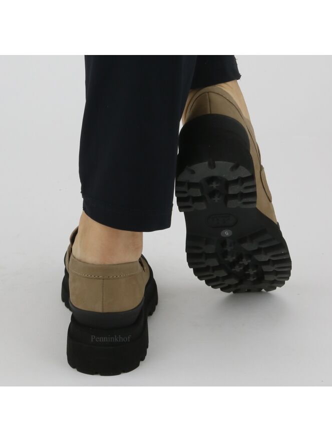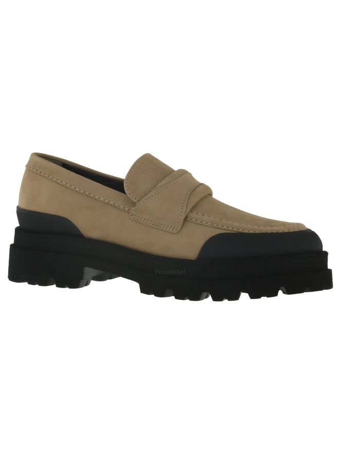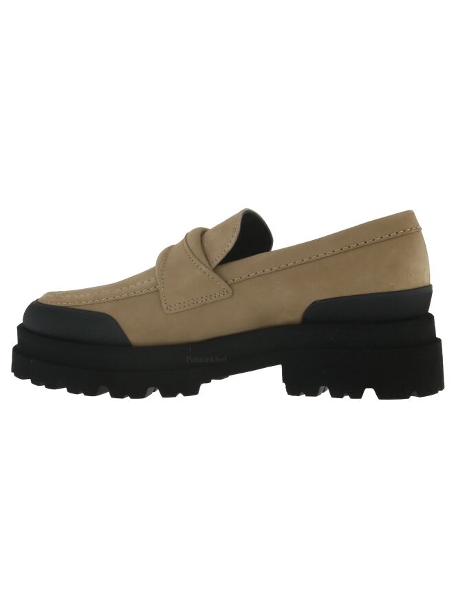 Ein Slipper der Schuhmarke Kennel & Schmenger in Camel. Die Schuhspitze ist am Rand mit einem breiten gerippten schwarzen Streifen versehen. Die robuste Sohle ist gezackt. Die Innenseite ist mit Leder gefüttert.