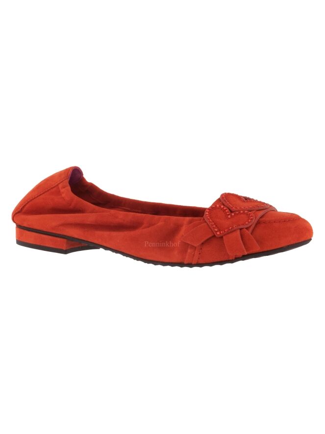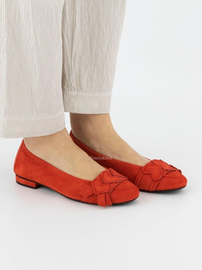 Ein hellroter Ballerina der Schuhmarke Kennel & Schmenger. Auf dem vorderen Fußteil befindet sich ein Band mit dekorativen Herzen, die an den Rändern mit schwarzem Strass versehen sind.