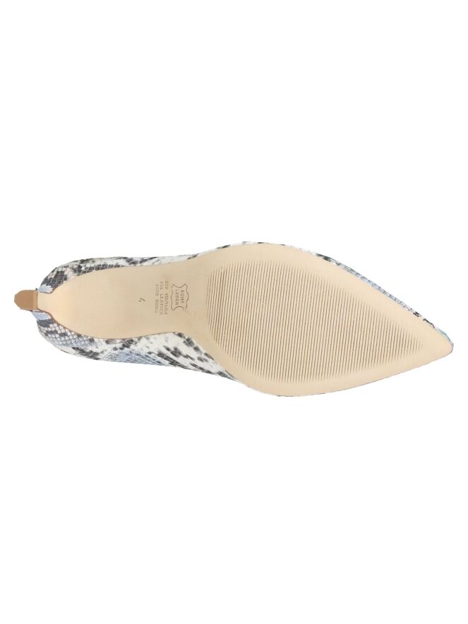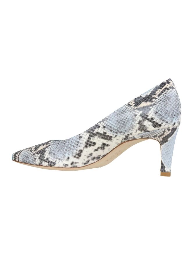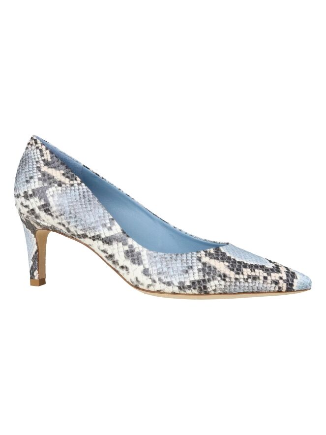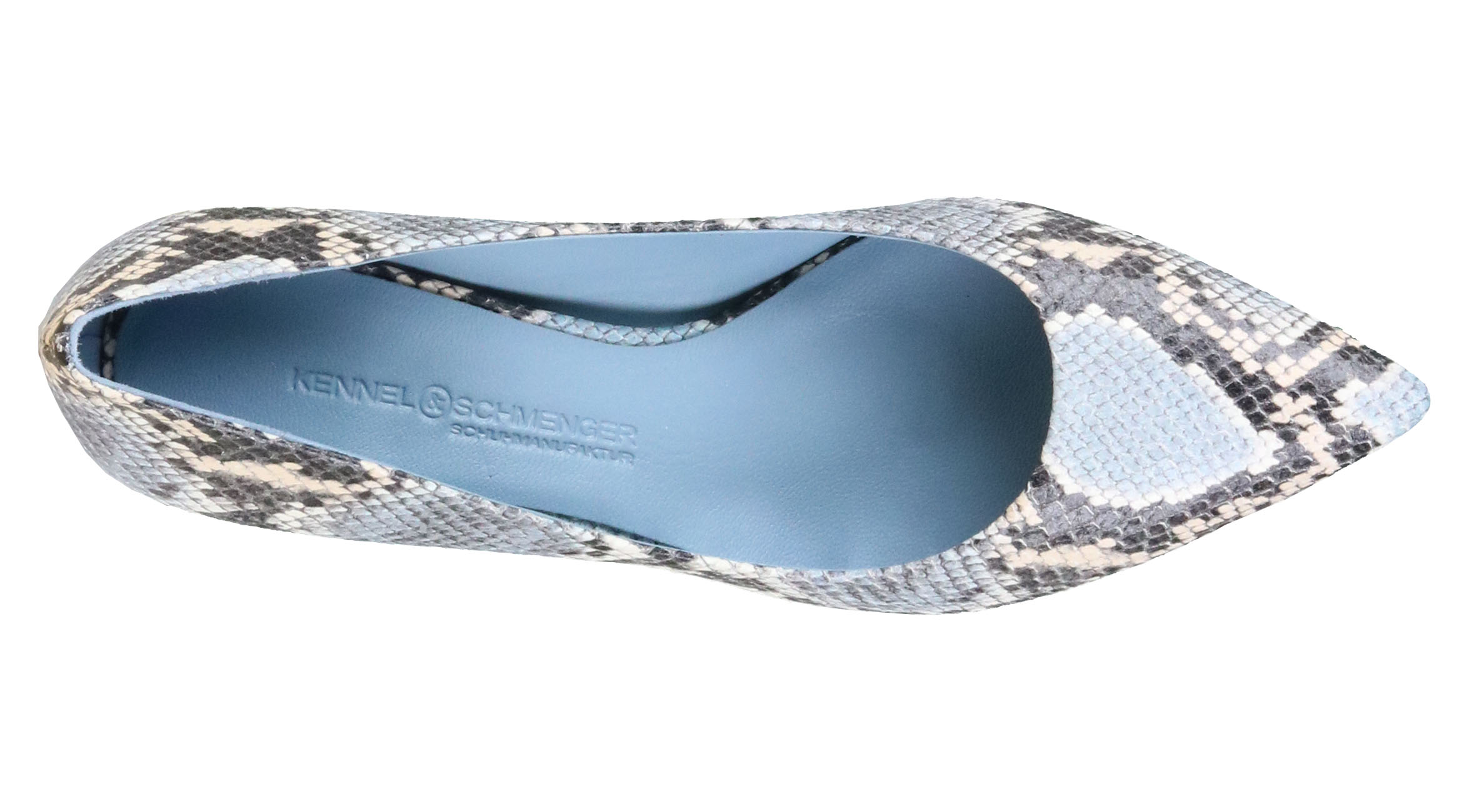 Pumps der Schuhmarke Kennel und Schmenger K&S mit Python-Print in verschiedenen Blautönen, Cremeweiß und Grau. Der Pumps läuft spitz zu. Der Absatz besteht aus dem gleichen Material wie der Pumps. Der Pumps hat ein Innenfutter aus Leder.