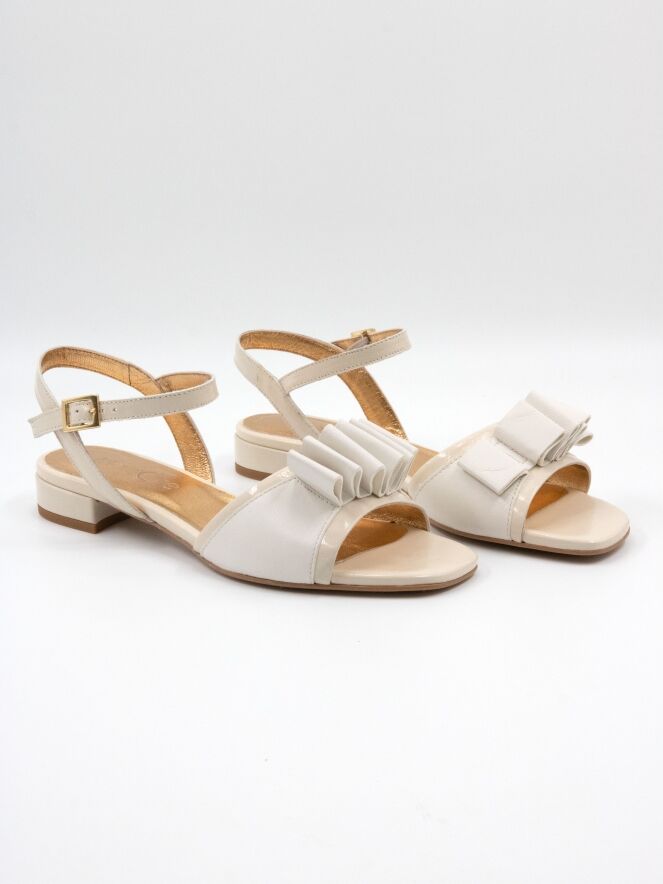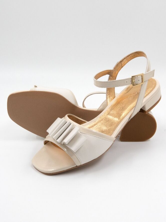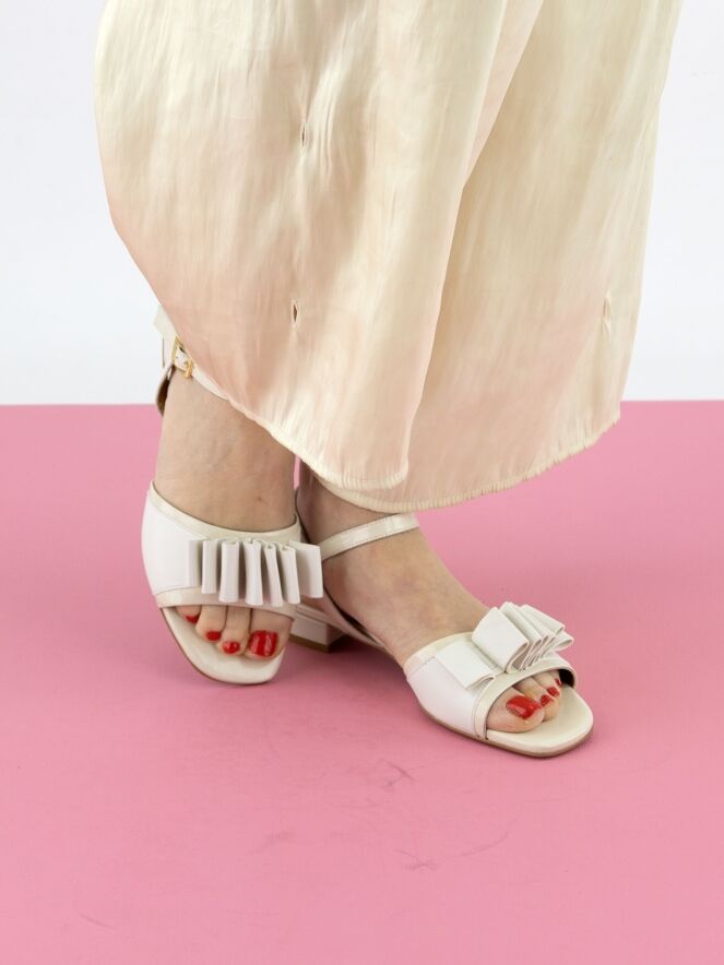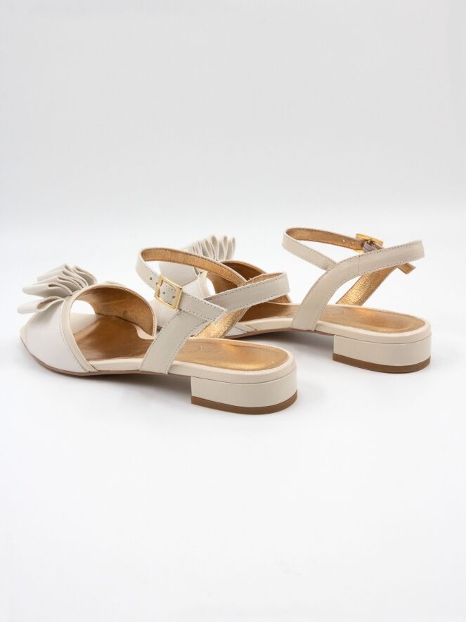 Eine Sandale von Madore in Cremeweiß. Über dem Vorderfuß verläuft ein dekorativer Riemen aus plissiertem Leder. Der Fersenriemen ist seitlich verstellbar.