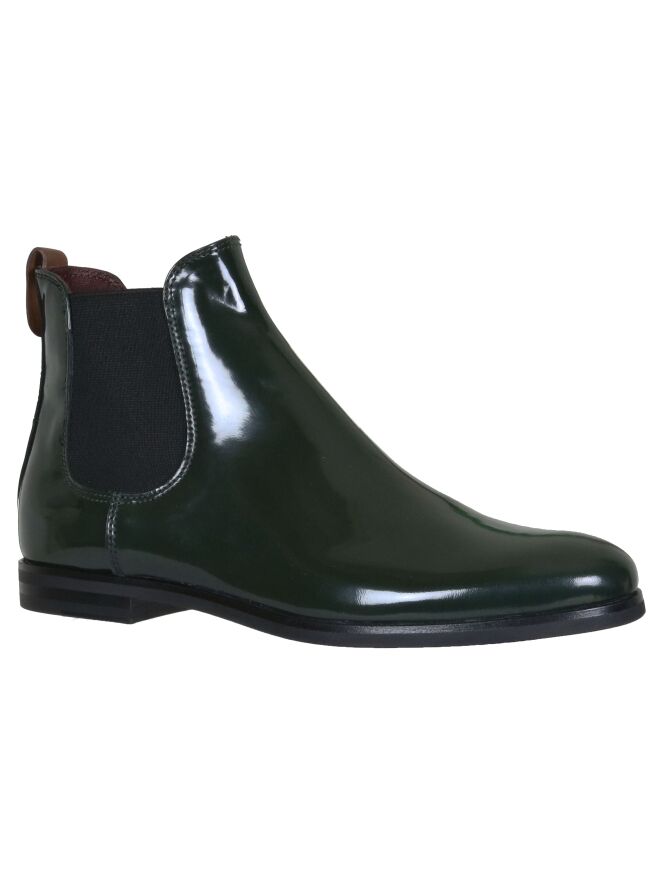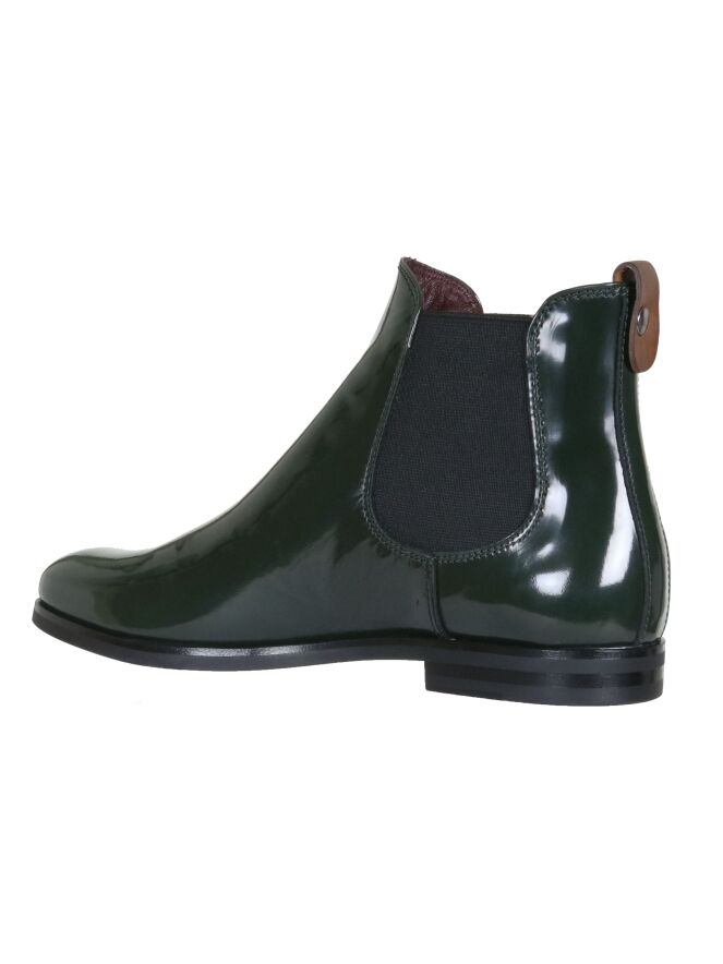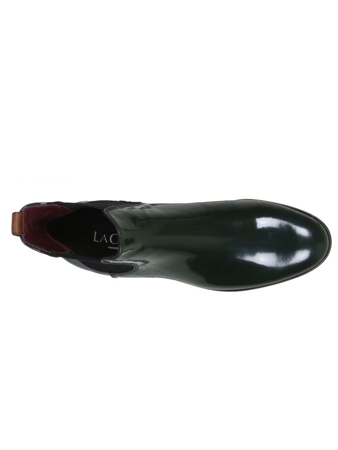 Dunkelgrüne Stiefelette der Designerschuhmarke La Cabala. Am oberen Rand des Stiefelschafts befindet sich eine braune Schlaufe an der Ferse. Der Schaft ist beidseitig mit einem elastischen Einsatz versehen. Die vorn abgerundete Stiefelette hat ein Innenfutter aus Leder.