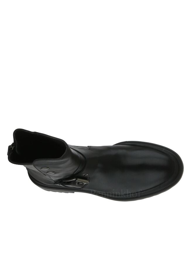 Eine Stiefelette der Schuhmarke La Cabala in Schwarz. Auf dem Spann ist eine dekorative Schnalle. An der Außenseite des Schaftes befinden sich zwei Druckknöpfe. Von der Schaftkante bis zur Ferse verläuft ein Reißverschluss. Die Innenseite des Schaftes ist mit Leder ausgekleidet.