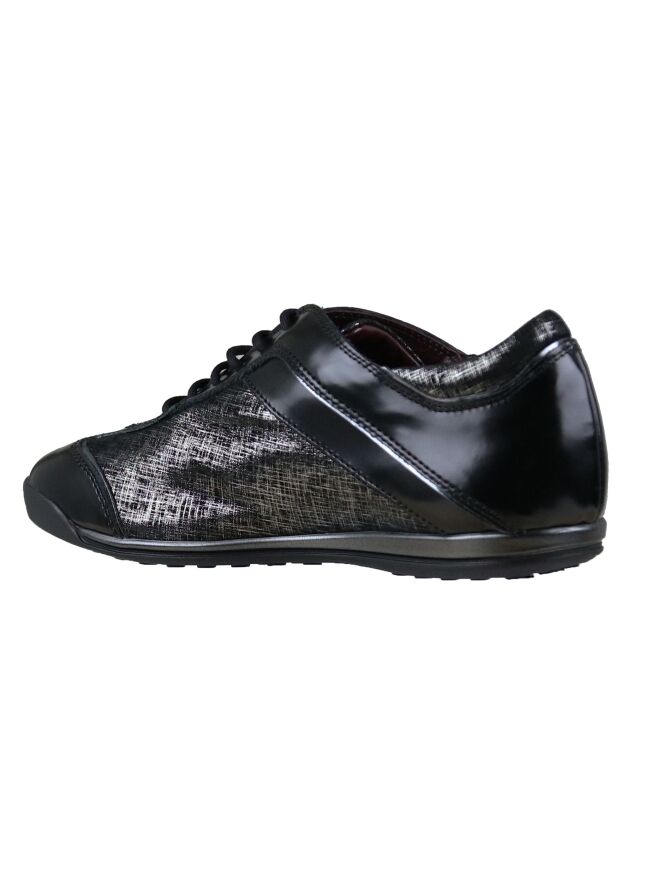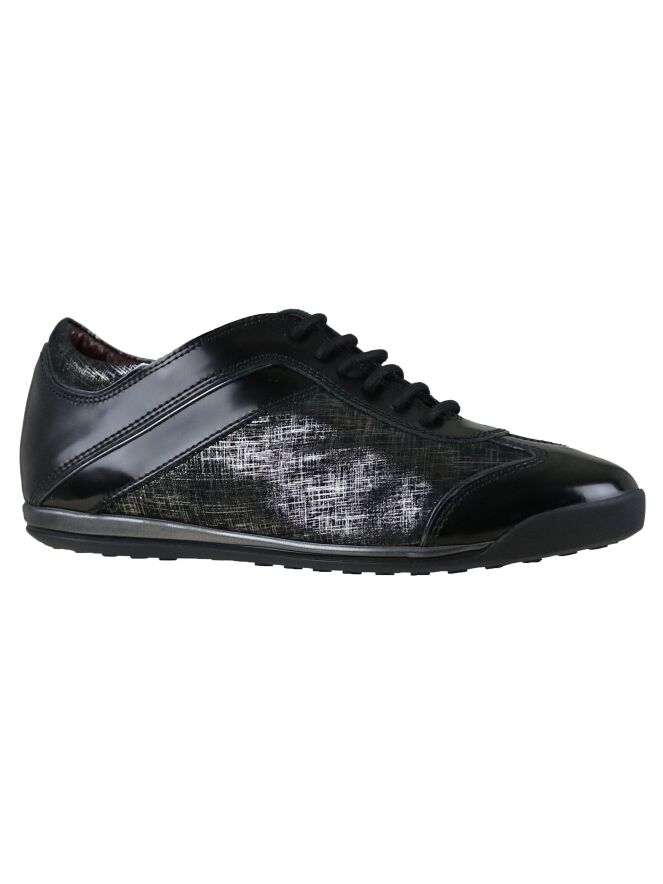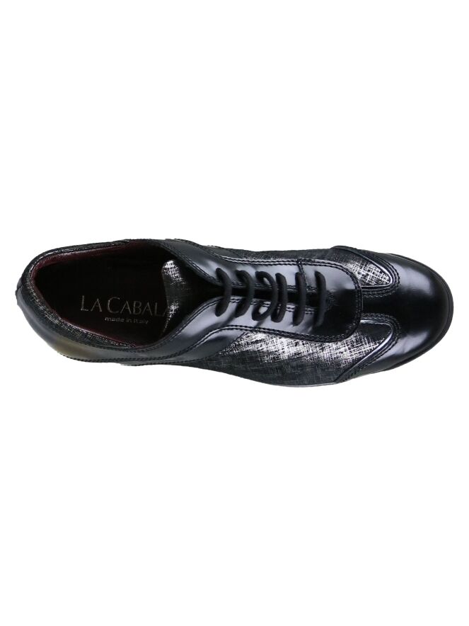 Schwarzer Sneaker der Designerschuhmarke La Cabala. Ein Streifen aus Spazzolato-Leder akzentuiert die Seiten. Die Ferse, Zunge und Seiten des Sneakers sind aus Leder und mit einem schwarz-silbernen Grafikdruck versehen. Die Innensohle ist herausnehmbar. Der Sneaker hat ein Innenfutter aus Leder.