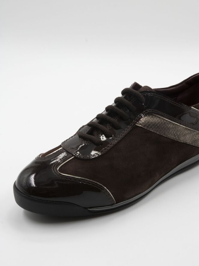 Ein mokkabrauner Sneaker der Schuhmarke La Cabala. Schaft, Ferse und Schuhspitze sind mit mokkabraunem Lackleder versehen. An den Seiten befindet sich ein Streifen mit bronzefarbenem Schlangenprint. Die Einlegesohle ist herausnehmbar. Das Innenfutter ist aus Leder.