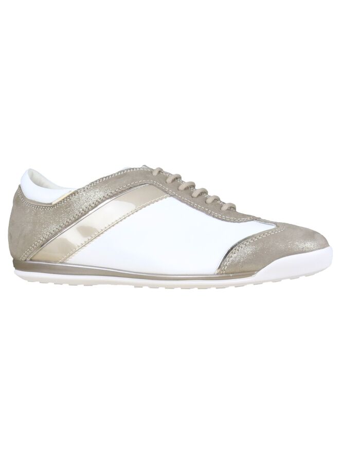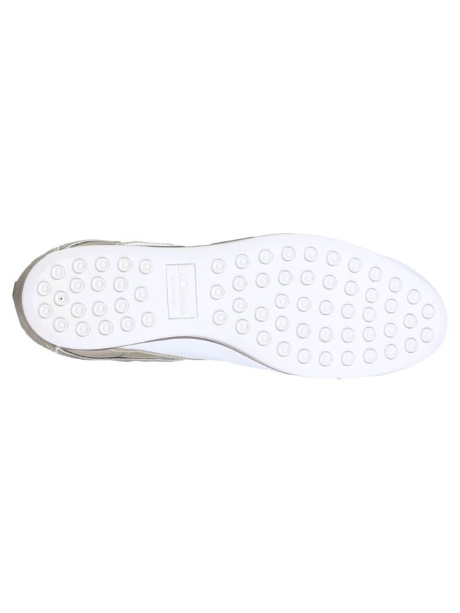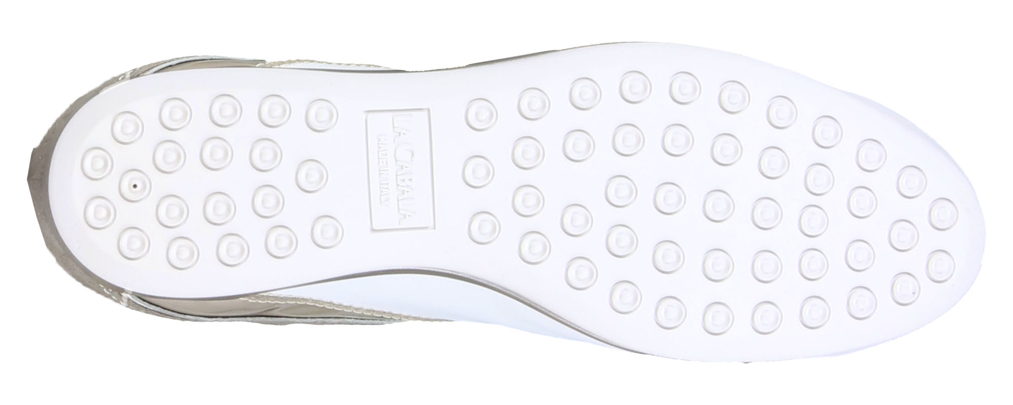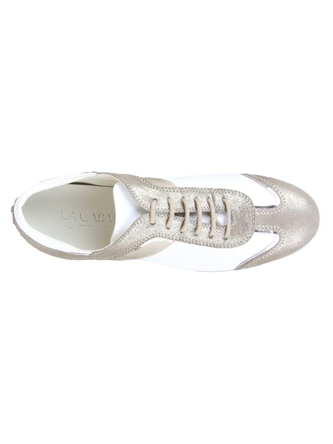 Taupemetallic-weißer Sneaker der Designerschuhmarke La Cabala. Ein taupefarbiger Lackstreifen akzentuiert die Seiten. Die Innensohle ist herausnehmbar. Der Sneaker hat ein Futter aus Leder.