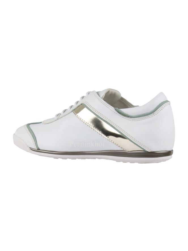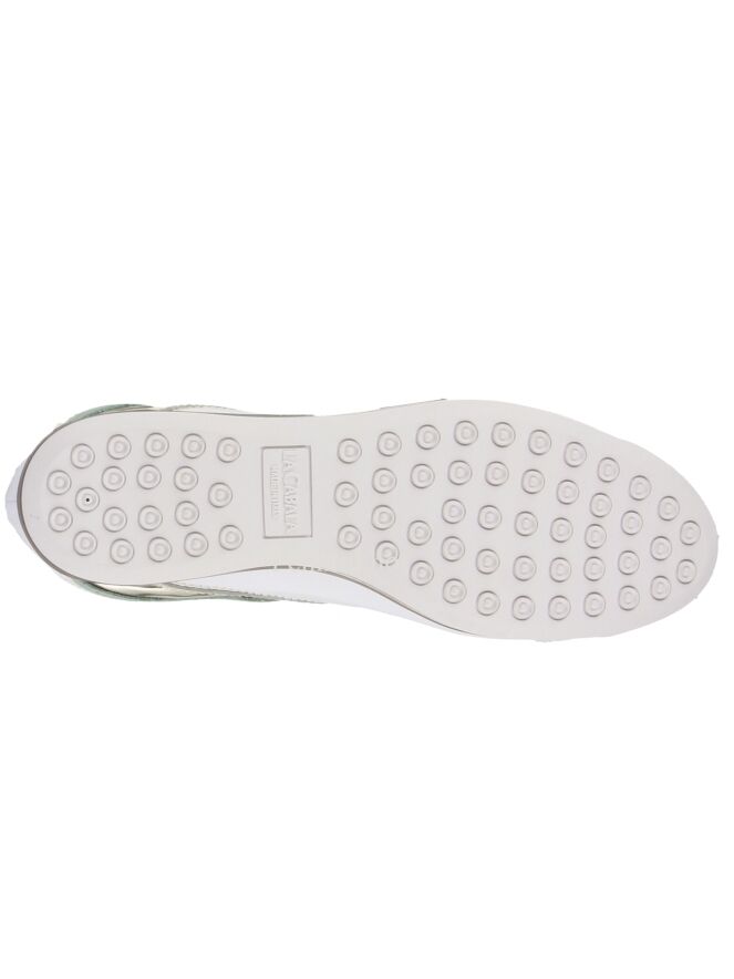 Ein weißer Sneaker der Schuhmarke La Cabala. An den Seiten, an der Ferse und am Vorderfuß befindet sich eine mintgrüne Paspel aus Lackleder. Auf beiden Seiten verläuft auch ein silberfarbener Streifen. Die Einlegesohle ist herausnehmbar. Das Innenfutter ist aus Leder.