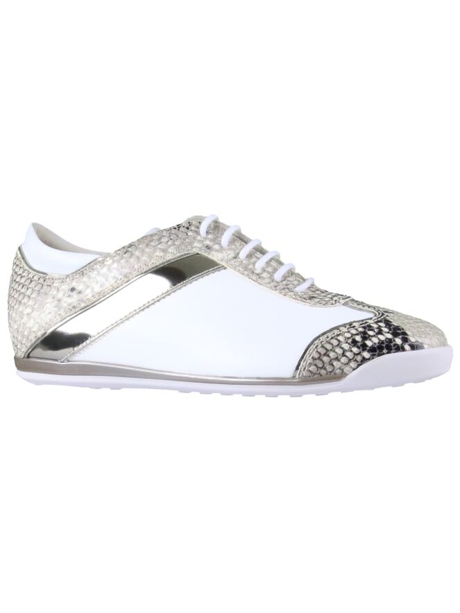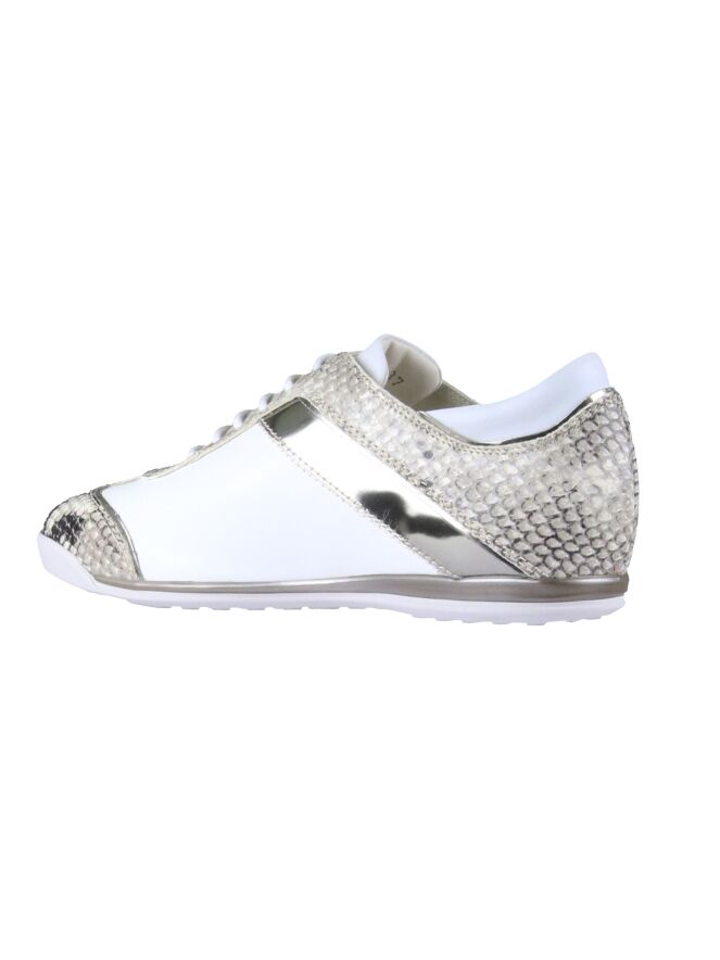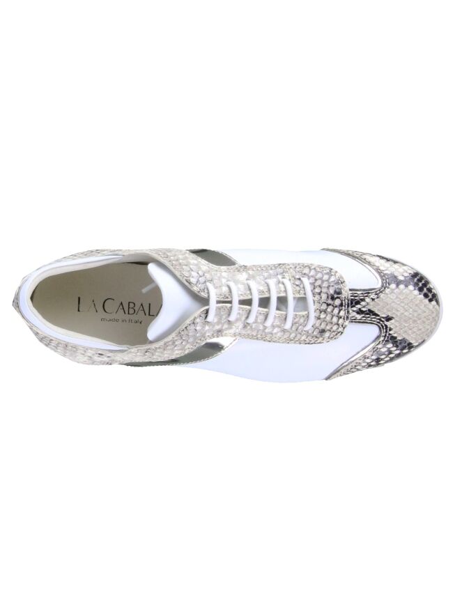 Weißer Sneaker der Designerschuhmarke La Cabala. Der Sneaker ist von der Ferse über den oberen Rand und die Schnürung bis hin zur Schuhspitze mit einem Schlangenmuster versehen. Ein platinfarbiger Streifen akzentuiert die Seiten. Die Innensohle ist herausnehmbar. Der Sneaker hat ein Innenfutter aus Leder.