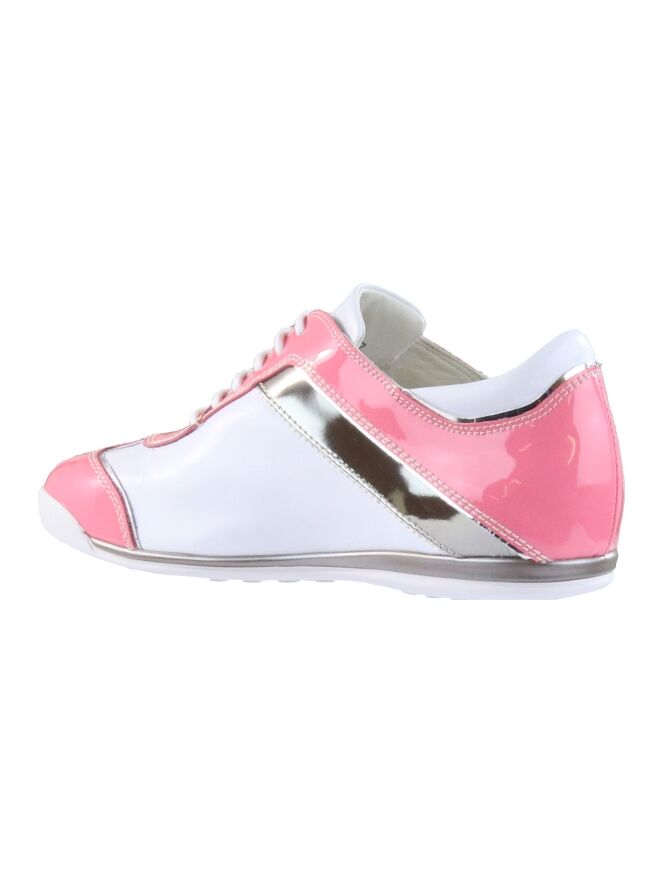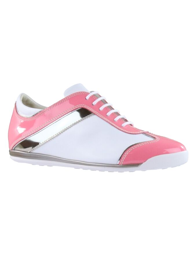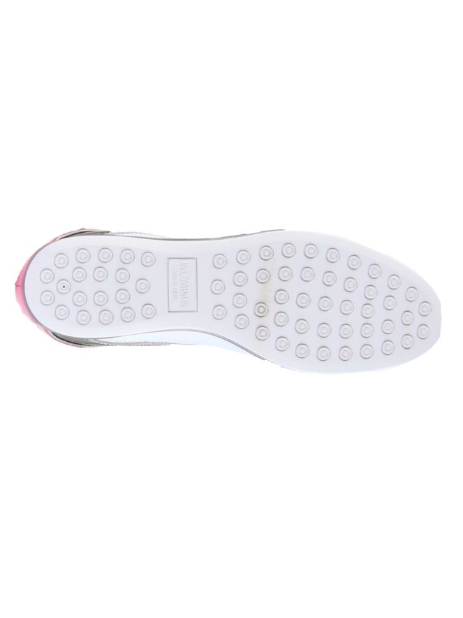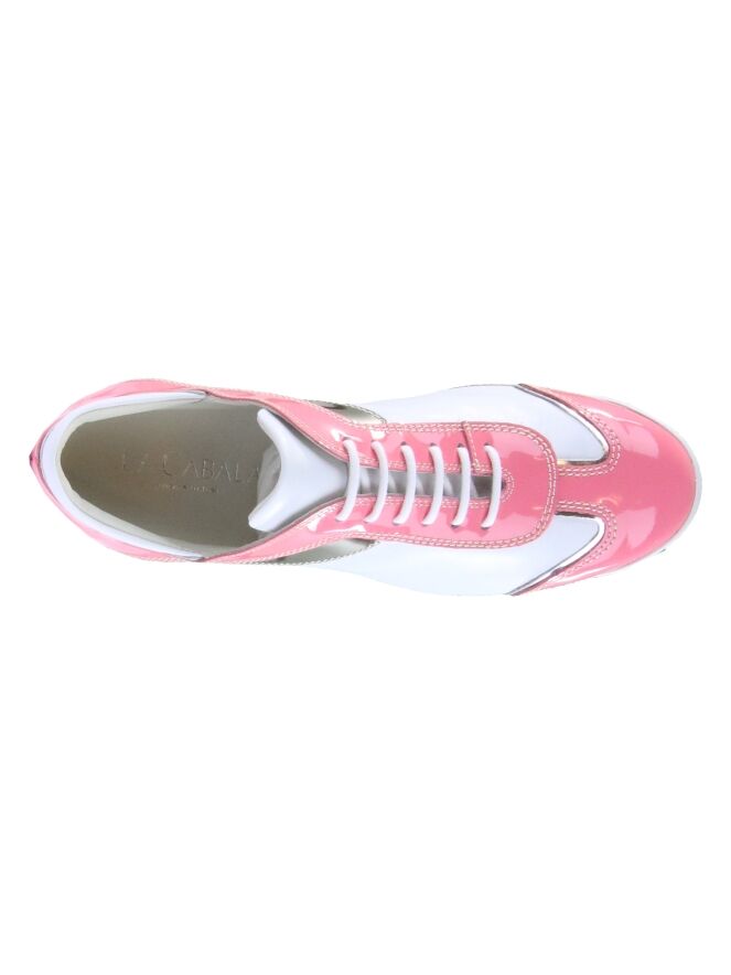 Weiß-rosa Sneaker der Designerschuhmarke La Cabala. Der Sneaker ist von der Ferse über den oberen Rand und die Schnürung bis hin zur Schuhspitze mit einem pinkfarbenen Lacklederstreifen versehen. Ein platinfarbener Streifen akzentuiert die Seiten. Der Sneaker hat ein Innenfutter aus Leder und eine herausnehmbare Innensohle.