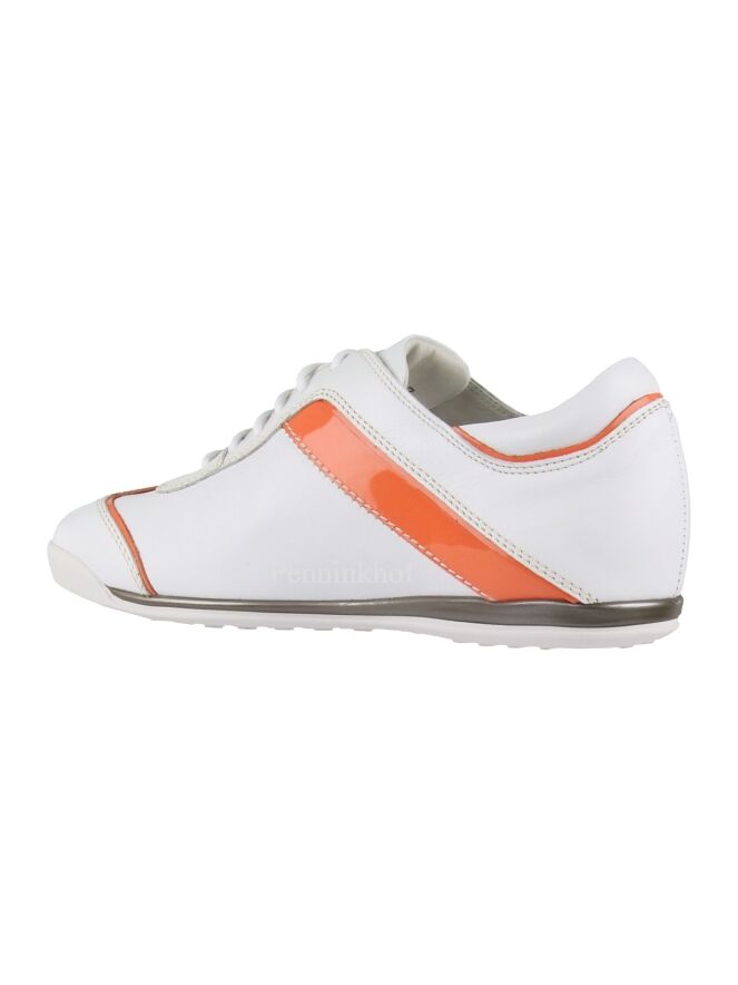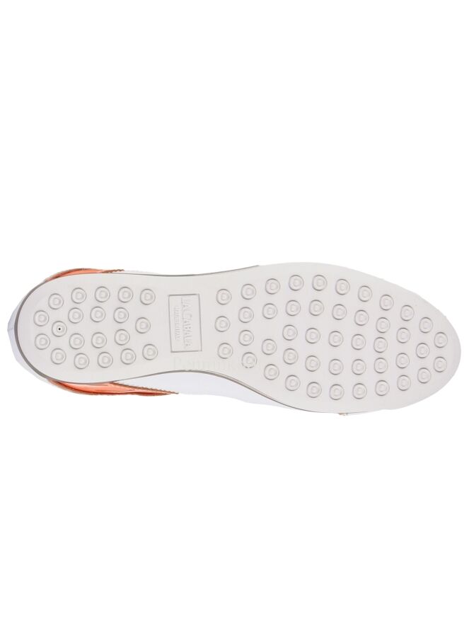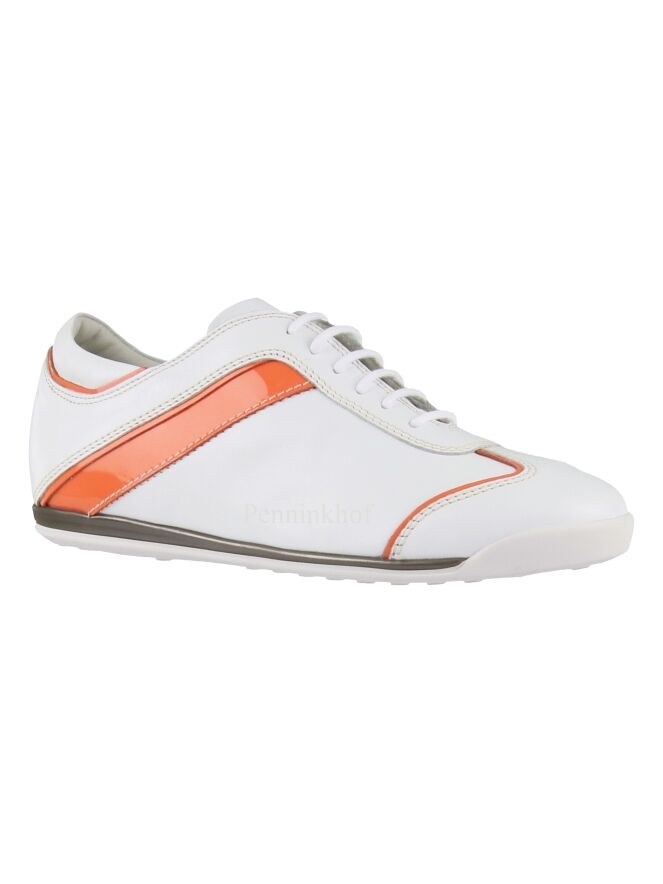 Ein weißer Sneaker der Schuhmarke La Cabala. An den Seiten, an der Ferse und am Vorderfuß befindet sich eine orangefarbene Paspel aus Lackleder. Die Einlegesohle ist herausnehmbar. Das Innenfutter ist aus Leder.
